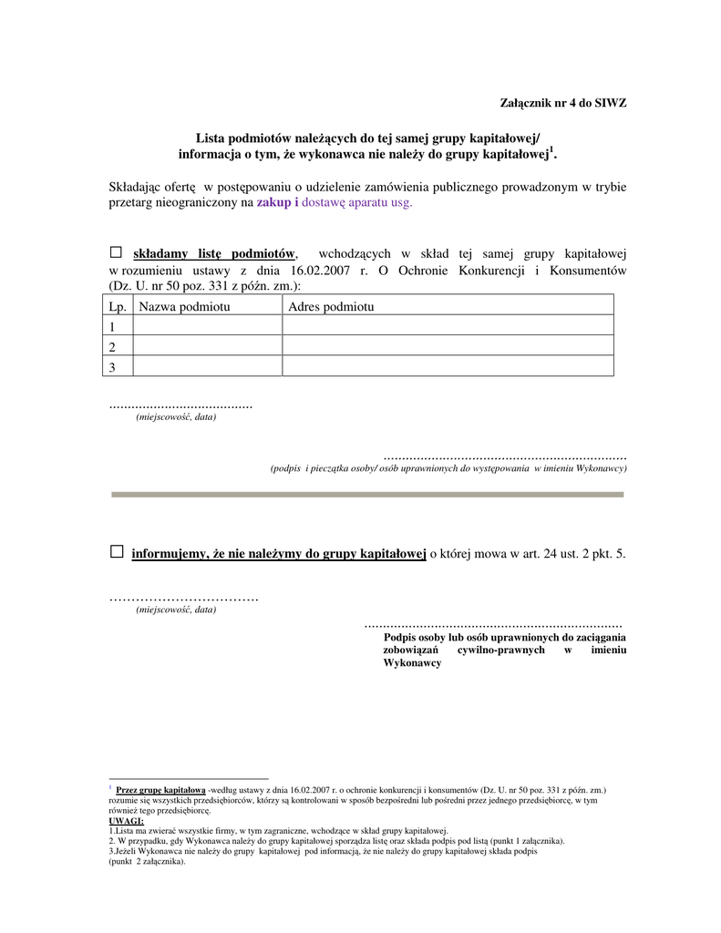 Załącznik nr 4 do SIWZ Lista podmiotów należących do tej samej grupy kapitałowej/ informacja o tym, że wykonawca nie należy do grupy kapitałowej1. Składając ofertę w postępowaniu o udzielenie zamówienia publicznego prowadzonym w trybie przetarg nieograniczony na zakup i dostawę aparatu usg. □ składamy listę podmiotów, wchodzących w skład tej samej grupy kapitałowej w rozumieniu ustawy z dnia 16.02.2007 r. O Ochronie Konkurencji i Konsumentów (Dz. U. nr 50 poz. 331 z późn. zm.): Lp. Nazwa podmiotu Adres podmiotu 1 2 3 ....................................... (miejscowość, data) .................................................................. (podpis i pieczątka osoby/ osób uprawnionych do występowania w imieniu Wykonawcy) □ informujemy, że nie należymy do grupy kapitałowej o której mowa w art. 24 ust. 2 pkt. 5. ……………………………. (miejscowość, data) ...................................................................... Podpis osoby lub osób uprawnionych do zaciągania zobowiązań cywilno-prawnych w imieniu Wykonawcy 1 Przez grupę kapitałową -według ustawy z dnia 16.02.2007 r. o ochronie konkurencji i konsumentów (Dz. U. nr 50 poz. 331 z późn. zm.) rozumie się wszystkich przedsiębiorców, którzy są kontrolowani w sposób bezpośredni lub pośredni przez jednego przedsiębiorcę, w tym również tego przedsiębiorcę. UWAGI: 1.Lista ma zwierać wszystkie firmy, w tym zagraniczne, wchodzące w skład grupy kapitałowej. 2. W przypadku, gdy Wykonawca należy do grupy kapitałowej sporządza listę oraz składa podpis pod listą (punkt 1 załącznika). 3.Jeżeli Wykonawca nie należy do grupy kapitałowej pod informacją, że nie należy do grupy kapitałowej składa podpis (punkt 2 załącznika).