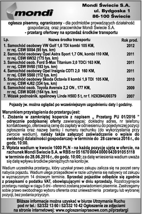 Mondi Świecie S.A. ul. Bydgoska 1, 86-100 Świecie ogłasza pisemny, ograniczony - dla podmiotów prowadzących działalność gospodarczą oraz pracowników Mondi Świecie S.A. - przetarg ofertowy na sprzedaż środków transportu 1 Samochód osobowy VW Golf 1,6 TDI kombi 105 KM, nr rej. 2012 CSW 9X64 (95 tys. km) 2 Samochód osobowy Opel Astra Sport 1,7 ON, kombi 110 KM, 2011 nr rej. CSW 6W32 (175 tys. km) 3 Samochód osob. Ford S-Max Titanium 2,0 TDCi 163 KM, nr 2011 rej. CSW 9V60 (183 tys. km) 4 Samochód osobowy Opel Insignia CDTI 2,0 160 KM, nr rej. 2011 CSW 5S60 (112 tys. km) 5 Samochód osobowy Skoda Octavia II kombi 1,9 TDI 105 KM, 2010 nr rej. CSW 4J62 (334 tys. km) 6 Samochód osob. Toyota Avensis 2,2 ON , 177 KM, nr rej. CSW 2009 8G98 (164 tys. km) 7 Wózek podnośnik. spalinowy Linde H50D 5 t, nr f. 2007 H2X394U00379 7 Wózek podnośnik. spalinowy Linde H50D 5 t, nr f. 2007 H2X394U00379 z chwytakiem do rol papieru Pojazdy jw. można oglądać po wcześniejszym uzgodnieniu daty i godziny. Warunkiem przystapienia do przetargu jest : 1. Złożenie w zamkniętej kopercie z napisem „ Przetarg PU 01/2016 ” odręcznie podpisanej oferty zawierajacej: dokładny adres, nr telefonu kontaktowego, oferowaną cenę do zapłaty w odniesieniu do pojedynczej pozycji ogłoszenia, oraz nazwę banku i numeru rachunku (do wykorzystania przy zwrocie wadium), należy także załączyć zaświadczenie o wpisie do ewidencji działalnosci gospodarczej - w terminie do 28 czerwca 2016 r., do godz. 10:00. 2. Wpłata wadium w kwocie 1000 PLN - na każdą pozycję ujętą w ofercie, na rachunek Mondi Świecie S.A. w RBS nr 05 1670 0004 0000 6439 9105 5118 w terminie do 28.06.2016 r., do godz. 10:00; za datę wniesienia wadium uważa się datę wpływu środków pieniężnych na konto jw. Wadium uczestnika przetargu, który uzyskał prawo zakupu zalicza się na poczet ceny nabycia pojazdu. Wadium ulega przepadkowi w razie uchylenia się nabywcy od zakupu w wyznaczonym 14 dniowym terminie. Sprzedaż pojazdów odbędzie się zgodnie z przepisami o podatku VAT, obowiązującymi w dniu sprzedaży. Rozstrzygniecie przetargu nastąpi w ciągu 5 dni - oferenci zostaną powiadomieni pisemnie. Zastrzegamy sobie prawo swobodnego wyboru oferenta oraz unieważnienia przetargu lub wybranej pozycji, bez podania przyczyn. Bliższe informacje można uzyskać w biurze Utrzymania Ruchu pod tel.: 0-52 / 332 1360 i 0-52 /332 1042 Ogłoszenie ze zdjęciami do wglądu na stronie internetowej: www.ogloszeniaprasowe.com.pl/przetargi