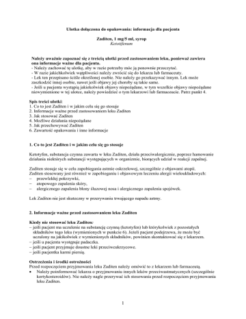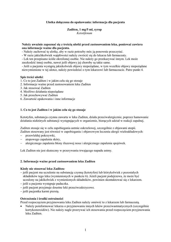 Ulotka dołączona do opakowania: informacja dla pacjenta Zaditen, 1 mg/5 ml, syrop Ketotifenum Należy uważnie zapoznać się z treścią ulotki przed zastosowaniem leku, ponieważ zawiera ona informacje ważne dla pacjenta. - Należy zachować tę ulotkę, aby w razie potrzeby móc ją ponownie przeczytać. - W razie jakichkolwiek wątpliwości należy zwrócić się do lekarza lub farmaceuty. - Lek ten przepisano ściśle określonej osobie. Nie należy go przekazywać innym. Lek może zaszkodzić innej osobie, nawet jeśli objawy jej choroby są takie same. - Jeśli u pacjenta wystąpią jakiekolwiek objawy niepożądane, w tym wszelkie objawy niepożądane niewymienione w tej ulotce, należy powiedzieć o tym lekarzowi lub farmaceucie. Patrz punkt 4. Spis treści ulotki: 1. Co to jest Zaditen i w jakim celu się go stosuje 2. Informacje ważne przed zastosowaniem leku Zaditen 3. Jak stosować Zaditen 4. Możliwe działania niepożądane 5. Jak przechowywać Zaditen 6. Zawartość opakowania i inne informacje 1. Co to jest Zaditen i w jakim celu się go stosuje Ketotyfen, substancja czynna zawarta w leku Zaditen, działa przeciwalergicznie, poprzez hamowanie działania niektórych substancji występujących w organizmie, biorących udział w reakcji zapalnej. Zaditen stosuje się w celu zapobiegania astmie oskrzelowej, szczególnie z objawami atopii. Zaditen stosowany jest również w zapobieganiu i objawowym leczeniu alergii wieloukładowych: przewlekłej pokrzywki, atopowego zapalenia skóry, alergicznego zapalenia błony śluzowej nosa i alergicznego zapalenia spojówek. Lek Zaditen nie jest skuteczny w przerywaniu trwającego napadu astmy. 2. Informacje ważne przed zastosowaniem leku Zaditen Kiedy nie stosować leku Zaditen: jeśli pacjent ma uczulenie na substancję czynną (ketotyfen) lub którykolwiek z pozostałych składników tego leku (wymienionych w punkcie 6). Jeżeli pacjent podejrzewa, że może być uczulony na jakikolwiek z wymienionych składników, powinien skontaktować się z lekarzem. jeśli u pacjenta występuje padaczka. jeśli pacjent przyjmuje doustne leki przeciwcukrzycowe. jeśli pacjentka karmi piersią. Ostrzeżenia i środki ostrożności Przed rozpoczęciem przyjmowania leku Zaditen należy omówić to z lekarzem lub farmaceutą. Należy poinformować lekarza o przyjmowaniu innych leków przeciwastmatycznych (szczególnie kortykosteroidów). Nie należy nagle przerywać ich stosowania przed rozpoczęciem przyjmowania leku Zaditen. 1 Jeśli u pacjenta występowała padaczka, przed rozpoczęciem przyjmowania leku, należy poinformować o tym lekarza, ponieważ podczas stosowania leku Zaditen mogą wystąpić drgawki (patrz również punkt „Kiedy nie stosować leku Zaditen”). Jeśli pacjent przyjmuje leki przeciwcukrzycowe, należy o tym poinformować lekarza. U pacjentów stosujących lek Zaditen jednocześnie z doustnymi lekami przeciwcukrzycowymi w rzadkich przypadkach obserwowano przemijające zmniejszenie liczby płytek krwi, dlatego nie należy stosować jednocześnie leków przeciwcukrzycowych i leku Zaditen (patrz punkt „Kiedy nie stosować leku Zaditen”). Lek Zaditen może nasilać działanie alkoholu. Dlatego nie należy pić alkoholu podczas stosowania leku Zaditen. W przypadku spowolnienia reakcji u pacjenta, prawdopodobnie z powodu uspokajającego działania leku, należy zgłosić się do lekarza, który zmniejszy dawkę. Zaditen a inne leki Należy powiedzieć lekarzowi lub farmaceucie o wszystkich lekach przyjmowanych przez pacjenta obecnie lub ostatnio, a także o lekach, które pacjent planuje przyjmować. Szczególnie ważne jest, aby poinformować lekarza o przyjmowaniu: - innych leków stosowanych w leczeniu astmy, w tym leków rozszerzających oskrzela, - leków uspokajających, nasennych lub innych leków, po których występuje senność, - silnych leków przeciwbólowych, - doustnych leków przeciwcukrzycowych (patrz także punkt „Kiedy nie stosować leku Zaditen”), - leków przeciwhistaminowych (np. niektórych leków stosowanych w leczeniu alergii, przeziębień i grypy), - leków przeciwzakrzepowych. Ciąża i karmienie piersią Jeśli pacjentka jest w ciąży lub karmi piersią, przypuszcza że może być w ciąży lub gdy planuje mieć dziecko, powinna poradzić się lekarza przed zastosowaniem tego leku. Nie ustalono bezpieczeństwa stosowania leku w ciąży, dlatego Zaditen może być stosowany w czasie ciąży jedynie w przypadku gdy lekarz uzna, że jest to bezwzględnie konieczne. Podczas stosowania leku Zaditen nie należy karmić piersią. Prowadzenie pojazdów i obsługiwanie maszyn W przypadku stosowania syropu Zaditen u dorosłych należy pamiętać, że podczas pierwszych kilku dni leczenia reakcje pacjenta mogą ulec spowolnieniu, dlatego nie należy prowadzić pojazdów ani obsługiwać maszyn do czasu poznania indywidualnej reakcji pacjenta na lek. Lek Zaditen zawiera glukozę oraz sole sodowe parahydroksybenzoesanu metylu i propylu. Syrop Zaditen zawiera glukozę. Jeśli u pacjenta stwierdzono wcześniej nietolerancję niektórych cukrów, pacjent powinien poinformować o tym lekarza przed zastosowaniem leku. Lek Zaditen w postaci syropu zawiera sole sodowe parahydroksybenzoesanu metylu i propylu, które mogą powodować reakcje alergiczne (możliwe reakcje typu późnego). 3. Jak stosować Zaditen Ten lek należy zawsze stosować zgodnie z zaleceniami lekarza. Nie należy stosować dawki większej niż zalecana. W razie wątpliwości należy zwrócić się do lekarza. Lek należy stosować doustnie. Do opakowania dołączona jest miarka dozująca umożliwiająca odmierzenie odpowiedniej ilości leku. 2 Stosowanie u dzieci w wieku od 6 miesięcy życia do 3 lat 0,05 mg ketotyfenu (0,25 ml syropu)/kg masy ciała dwa razy na dobę, rano i wieczorem, podczas posiłku. Przykład: dziecko ważące 10 kg może otrzymać 2,5 ml (pół łyżeczki) syropu, rano i wieczorem. Stosowanie u dzieci w wieku powy