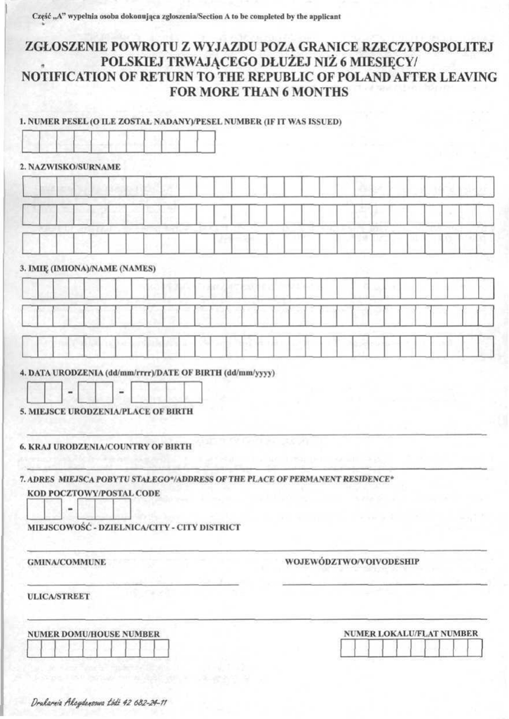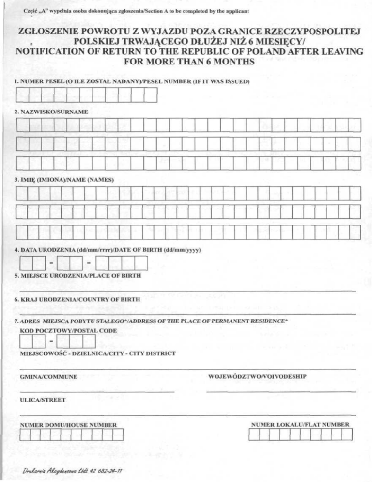 Część ..A" wypełnia osoba dokonująca zgloszenia/Section A to be completed by the applicant ZGŁOSZENIE POWROTU Z WYJAZDU POZA GRANICE RZECZYPOSPOLITEJ POLSKIEJ TRWAJĄCEGO DŁUŻEJ NIŻ 6 MIESIĘCY/ NOTIFICATION OF RETURN TO THE REPUBLIC OF POLANO AFTER LEAYING FOR MORĘ THAN 6 MONTHS 1. NUMER PESEL (O ILE ZOSTAŁ NADANY)/PESEL NUMBER (IF IT WAS ISSUED) .. NAZWISKO/SURNAME 1. IMIĘ (IMIONA)/NAME (NAMES) 4. DATA URODZENIA (dd/mm/rrrr)/DATE OF BIRTH (dd/mm/yyyy) 5. MIEJSCE URODZENIA/PLACE OF B1KTH 6. KRAJ URODZENIA/COUNTRY OF BIRTH 7. ADRES MIEJSCA POBYTU STAŁEGO*/ADDRESS OF THE PLACE OF PERMANENT RESIDENCE* KOD POCZTOWY/POSTAŁ CODE MIEJSCOWOŚĆ - DZIELNICA/CITY - CITY DISTRICT WO JE WÓDZTWO/VOIVODE SHIP GMINA/COMMUNE ULICA/STREET NUMER DOMU/HOUSE NUMBER óJź 42 6&2-24-11 NUMER LOKALU/FLAT NUMBER 8. ADRES MIEJSCA POBYTU CZASO\VEGO*/ADDRESS OF THE NEW PLACE OF TEMPORARY RESIDENCE* KOD POCZTOWY/POSTAŁ CODE MIEJSCOWOŚĆ - DZIELNICA/CITY - CITY DISTRICT GMINA/COMMUNE WOJEWÓDZTWO/VOIVODESHIP ULICA/STREET NUMER DOMU/HOUSE NUMBLR NUMER LOKALU/FLAT NUMBER 9. DATA POWROTU Z WYJAZDU POZA GRANICE RZECZYPOSPOLITEJ POLSKIEJ (dd/mm/rrrr)/DATE OF RETURN TO THE TERRITORY OF THE REPUBLIC OF POLAND (dd/mm/yyyy) 10. NAZWISKO I IMIĘ PEŁNOMOCNIKA**/SURNAME AND FIRST NAME OF THE PROXY** Stwierdzani wiarygodność powyższych danych/l hereby certify that the above information is true and correct (własnoręczny, czytelny podpis osoby zgłaszającej/ (handwritten legible signature of the applicant) (miejscowość, data)/(place, datę) POUCZENIE/INSTRUCTION Zgłoszenie należy wypełnić w jeżyku polskim, komputerowo (maszynowo) lub pismem odręcznym, kolorem niebieskim lub czarnym, drukowanymi litera mi./CompI etę the application form in Polish by typing (printing) or in handwriting, in blue or black using capital letters. * W przypadku braku miejsca pobytu pozostawia się puste pole./If there is no previous place of stay, leave the box blank. ** Wypełnić w przypadku wykonywania obowiązku meldunkowego przez pełnomocnika./Complete if the registration reąuirement is performed by a proxy. Część „B"wypelnia urzednik/Section B to be completed by an official Przyjęto zgłoszenie powrotu z wyjazdu poza granice Rzeczypospolitej Polskiej trwającego dłużej niż 6 miesięcy/ The notification of retum to the Rcpublic of Poland after leaving for morę than 6 months is hereby accepted (miejscowość, data)/(place, datę) (pieczęć i podpis urzędnika przyjmującego zgłoszenie)/ (seal and signature of the official accepting the notification of return to the Republic of Poland after leaving for morę than 6 months)