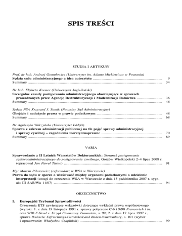 SPIS TREŚCI STUDIA I ARTYKUłY Prof. dr hab. Andrzej Gomułowicz (Uniwersytet im. Adama Mickiewicza w Poznaniu) Se˛dzia sa˛du administracyjnego a idea autorytetu .......................................................................... 9 Summary ............................................................................................................................................... 34 Dr hab. Elżbieta Kremer (Uniwersytet Jagielloński) Szczególne zasady poste˛powania administracyjnego obowia˛zuja˛ce w sprawach prowadzonych przez Agencje˛ Restrukturyzacji i Modernizacji Rolnictwa ........................... 36 Summary ............................................................................................................................................... 46 Se˛dzia NSA Krzysztof J. Stanik (Naczelny Sa˛d Administracyjny) Obejście i nadużycie prawa w prawie podatkowym ...................................................................... 48 Summary ............................................................................................................................................... 68 Dr Agnieszka Wilczyńska (Uniwersytet Łódzki) Sprawa z zakresu administracji publicznej na tle poje˛ć sprawy administracyjnej i sprawy cywilnej – zagadnienia teoretycznoprawne ................................................................. 70 Summary ............................................................................................................................................... 89 VARIA Sprawozdanie z II Letnich Warsztatów Doktoranckich: Stosunek poste˛powania sa˛dowoadministracyjnego do poste˛powania cywilnego, Gorzów Wielkopolski 2–4 lipca 2008 r. (opracował Jan Paweł Tarno) ......................................................................................................... 91 Mgr Marcin Piłaszewicz (referendarz w WSA w Warszawie) Prawo do sa˛du w sporze o właściwość mie˛dzy organami podatkowymi o udzielenie interpretacji (uwagi do orzeczenia WSA w Warszawie z dnia 15 października 2007 r. sygn. akt III SAB/Wa 11/07) .................................................................................................................... 94 ORZECZNICTWO I. Europejski Trybunał Sprawiedliwości Orzeczenia ETS zawieraja˛ce wskazówki dotycza˛ce wykładni prawa wspólnotowego (wyroki: 1. z dnia 19 listopada 1991 r. sprawy poła˛czone C-6 i 9/90 Francovich i in. oraz 9/70 F.Grad v. Urza˛d Finansowy Traunstein, s. 99; 2. z dnia 17 lipca 1997 r., sprawa Badische Erfrischungs-Getränke/Land Baden-Württemberg, s. 101 (wybór i opracowanie: Władysław Czapliński) ........................................................................................ 99 4 Zeszyty Naukowe Sa˛downictwa Administracyjnego 5(20)/2008 II. Europejski Trybunał Praw Człowieka Roszczenia wynikaja˛ce z aktów nacjonalizacyjnych. Orzeczenie ETPC z dnia 24 czerwca 2008 r. w sprawie Tomáš BAŤA przeciwko Republice Czech, skarga nr 43775/05 (Opracowała Agnieszka Wilk) ...................................................................................................... 103 III. Trybunał Konstytucyjny Przejście prawa własności samochodu na rzecz Skarbu Państwa (wyrok TK z dnia 3 czerwca 2008 r. sygn. akt P 4/06)(wybór i opracowanie: Irena Chojnacka) .......................................... 109 IV. Sa˛d Najwyższy Postanowienie Sa˛du Najwyższego z dnia 13 maja 2008 r. (sygn. akt III SK 39/07) [dot. orzekania przez sa˛d o obowia˛zkach przedsie˛biorcy w przypadku decyzji tymczasowej] (wybór i opracowanie: Andrzej Wróbel) ..................................................................................... 118 V. Naczelny Sa˛d Administracyjny i wojewódzkie sa˛dy administracyjne A. Orzecznictwo Naczelnego Sa˛du Administracyjnego (opracował Marcin Wia˛cek) 1. Uchwała składu siedmiu se˛dziów NSA z dnia 21 kwietnia 2008 r. (sygn. akt I OPS 1/08) [dot. zróżnicowania podmiotowego w zakresie skutków niezłożenia wniosku o prawo pomocy na urze˛dowym formularzu] ............................... 2. Uchwała składu siedmiu se˛dziów NSA z dnia 21 kwietnia 2008 r. (sygn. akt I OPS 2/08) [dot. powojennego wywłaszczania nieruchomości dla celów realizacji tzw. narodowych planów gospodarczych] ....................................................... 3. Uchwała składu siedmiu se˛dziów NSA z dnia 30 czerwca 2008 r. (sygn. akt I FPS 1/08) [dot. relacji mie˛dzy wykładnia˛ prawa w wyroku kasacyjnym a w uchwale NSA] ............................................................................................................ B. Orzecznictwo wojewódzkich sa˛dów administracyjnych (wybór i opracowanie: Bogusław Gruszczyński) 1. Wyrok WSA w Opolu z dnia 12 grudnia 2006 r. (sygn. akt II SA/Op 436/06) [dot. prawa budowlanego – usytuowania ogrodu zimowego] ......................................... 2. Wyrok WSA w Lublinie z dnia 4 stycznia 2008 r. (sygn. akt II SA/Lu 788/07) [dot. zwia˛zania ustalenia prawa do świadczeń rodzinnych z data˛ złożenia wniosku – wyrok TK] ...................................................................................................................... 3. Wyrok WSA w Bydgoszczy z dnia 9 stycznia 2008 r. (sygn. akt II SA/Bd 832/07) [dot. przekształcenia prawa użytkowania wieczystego we własność] ............................ 4. Wyrok WSA w Opolu z dnia 13 maja 2008 r. (sygn. akt II SA/Op 85/08) [dot. wznowienia poste˛powania dyscyplinarnego policjanta] ......................................... 5. Wyrok WSA w Bydgoszczy z dnia 30 lipca 2008 r. (sygn. akt I SA/Bd 249/08) [dot. obniżenia podatku należnego] .................................................................................. 123 126 133 136 144 154 158 164 VI. Wnioski Prezesa NSA i pytania prawne sa˛dów administracyjnych skierowane do Trybunału Konstytucyjnego Pytania prawne (postanowienia: NSA z dnia 28 sierpnia 2008 r. sygn. akt I FSK 817/07; W