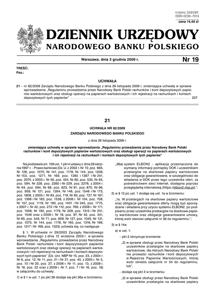 Indeks 35659X ISSN 0239–7013 cena 14,40 zł Warszawa, dnia 3 grudnia 2009 r. Nr 19 TREŚĆ: Poz.: UCHWAŁA 21 – n r 82/2009 Zarządu Narodowego Banku Polskiego z dnia 26 listopada 2009 r. zmieniająca uchwałę w sprawie wprowadzenia „Regulaminu prowadzenia przez Narodowy Bank Polski rachunków i kont depozytowych papierów wartościowych oraz obsługi operacji na papierach wartościowych i ich rejestracji na rachunkach i kontach depozytowych tych papierów” . . . . . . . . . . . . . . . . . . . . . . . . . . . . . . . . . . . . . . . . . . . . . . . . . . . . . . . . . . . . . . . . . 237 21 UCHWAŁA NR 82/2009 ZARZĄDU NARODOWEGO BANKU POLSKIEGO z dnia 26 listopada 2009 r. zmieniająca uchwałę w sprawie wprowadzenia „Regulaminu prowadzenia przez Narodowy Bank Polski rachunków i kont depozytowych papierów wartościowych oraz obsługi operacji na papierach wartościowych i ich rejestracji na rachunkach i kontach depozytowych tych papierów” Na podstawie art. 109 ust. 1 pkt 4 ustawy z dnia 29 sierpnia 1997 r. – Prawo bankowe (Dz. U. z 2002 r. Nr 72, poz. 665, Nr 126, poz. 1070, Nr 141, poz. 1178, Nr 144, poz. 1208, Nr 153, poz. 1271, Nr 169, poz. 1385 i 1387 i Nr 241, poz. 2074, z 2003 r. Nr 50, poz. 424, Nr 60, poz. 535, Nr 65, poz. 594, Nr 228, poz. 2260 i Nr 229, poz. 2276, z 2004 r. Nr 64, poz. 594, Nr 68, poz. 623, Nr 91, poz. 870, Nr 96, poz. 959, Nr 121, poz. 1264, Nr 146, poz. 1546 i Nr 173, poz. 1808, z 2005 r. Nr 83, poz. 719, Nr 85, poz. 727, Nr 167, poz. 1398 i Nr 183, poz. 1538, z 2006 r. Nr 104, poz. 708, Nr 157, poz. 1119, Nr 190, poz. 1401 i Nr 245, poz. 1775, z 2007 r. Nr 42, poz. 272 i Nr 112, poz. 769, z 2008 r. Nr 171, poz. 1056, Nr 192, poz. 1179, Nr 209, poz. 1315 i Nr 231, poz. 1546 oraz z 2009 r. Nr 18, poz. 97, Nr 42, poz. 341, Nr 65, poz. 545, Nr 71, poz. 609, Nr 127, poz. 1045, Nr 131, poz. 1075, Nr 144, poz. 1176, Nr 165, poz. 1316, Nr 166, poz. 1317 i Nr 168, poz. 1323) uchwala się, co następuje: „ 36a) s ystem ELBON2 – aplikacja przeznaczona do wymiany informacji pomiędzy DOK i uczestnikiem przetargów na skarbowe papiery wartościowe oraz obligacje gwarantowane, w szczególności do składania w DOK przez tego uczestnika ofert, za pośrednictwem sieci internet, dostępna poprzez przeglądarkę internetową (https://elbon2.nbp.pl),”; 2) w § 13 po ust. 1 dodaje się ust. 1a w brzmieniu: „ 1a. W przetargach na skarbowe papiery wartościowe oraz obligacje gwarantowane oferty mogą być sporządzane i składane przy użyciu systemu ELBON2, po podpisaniu przez uczestnika przetargów na skarbowe papiery wartościowe oraz obligacje gwarantowane umowy, której wzór stanowi załącznik nr 36 do regulaminu.”; 3) w § 14a: a) w ust. 1: § 1. W uchwale nr 29/2003 Zarządu Narodowego Banku Polskiego z dnia 12 września 2003 r. w sprawie wprowadzenia „Regulaminu prowadzenia przez Narodowy Bank Polski rachunków i kont depozytowych papierów wartościowych oraz obsługi operacji na papierach wartościowych i ich rejestracji na rachunkach i kontach depozytowych tych papierów” (Dz. Urz. NBP Nr 15, poz. 23, z 2004 r. Nr 6, poz. 12, Nr 11, poz. 21 i Nr 21, poz. 40, z 2005 r. Nr 5, poz. 10 i Nr 20, poz. 27, z 2006 r. Nr 11, poz. 13, z 2008 r. Nr 18, poz. 22 oraz z 2009 r. Nr 7, poz. 7 i Nr 16, poz. 18) w załączniku do uchwały: 1) w § 1 w ust. 1 po pkt 36 dodaje się pkt 36a w brzmieniu: – pkt 2 otrzymuje brzmienie: „2) w sprawie obsługi przez Narodowy Bank Polski uczestników przetargów na skarbowe papiery wartościowe, dla których Narodowy Bank Polski nie prowadzi rachunków i kont depozytowych w Rejestrze Papierów Wartościowych, której wzór określa załącznik nr 34 do regulaminu, lub”, – dodaje się pkt 3 w brzmieniu: „3) w sprawie obsługi przez Narodowy Bank Polski uczestników przetargów na skarbowe papiery poz. 21 – 238 – w okresie od dnia otrzymania listu do daty wejścia w życie zmian w regulaminie Uczestnik RPW złoży NBP pisemne oświadczenie o nieprzyjęciu zmienionego regulaminu, następuje rozwiązanie umowy – z dniem wejścia w życie wprowadzonych przez NBP zmian. Niezłożenie przez Uczestnika RPW takiego oświadczenia, w terminie określonym wyżej, traktowane będzie jako wyrażenie przez niego zgody na zmianę warunków regulaminu.”; wartościowe oraz obligacje gwarantowane użytkujących system ELBON2, której wzór określa załącznik nr 36 do regulaminu.”, b) ust. 2 otrzymuje brzmienie: „ 2. Do uczestników przetargów, wymienionych w ust. 1 pkt 2 i 3, mają zastosowanie wyłącznie postanowienia umów, o których mowa w tych przepisach.”; 4) w załączniku nr 2 do regulaminu w § 2 ust. 3 otrzymuje brzmienie: „ 3. NBP zobowiązuje się do powiadamiania Uczestnika RPW listem poleconym o każdorazowej zmianie regulaminu z co najmniej 10-dniowym wyprzedzeniem. Jeżeli DZIENNIK URZĘDOWY NBP NR 19 5) dodaje się załącznik nr 36 do regulaminu w brzmieniu określonym w załączniku do uchwały. § 2. Uchwała wchodzi w życie z dniem 10 grudnia 2009 r. Przewodniczący Zarządu Narodowego Banku Polskiego: S. S. Skrzypek DZIENNIK URZĘDOWY NBP NR 19 – 239 – poz. 21 Załącznik do uchwały nr 82/2009 Zarządu Narodowego Banku Polskiego z dnia 26 listopada 2009 r. (poz. 21) UMOWA w sprawie obsługi przez Narodowy Bank Polski uczestników przetargów na skarbowe papiery wartościowe oraz obligacje gwarantowane użytkujących system ELBON2 zawarta w dniu ........................................................ w Warszawie pomiędzy Narodowym Bankiem Polskim, zwanym dalej „NBP”, reprezentowanym przez: 1) ........................................................................................................................................................................................................................................., (imię i nazwisko oraz stanowisko służbowe) 2) ..................................................................................................