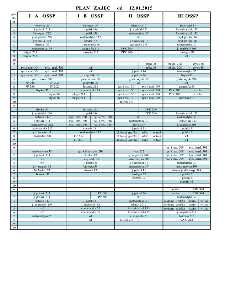 PLAN ZAJĘĆ godz. lek. 0 1 2 3 4 5 6 7 8 9 10 0 1 2 3 4 5 6 7 8 9 10 0 1 2 3 4 5 6 7 8 9 10 0 1 2 3 4 5 6 7 8 9 10 0 1 2 3 4 5 6 7 8 9 10 I A OSSP muzyka 36 j. polski 211 biologia 212 j. angielski 208 geografia 211 chemia 32 matematyka 38 religia 211 religia 211 rys. i mal. 301 rys. i mal. 301 rys. i mal. 301 rys. i mal. 301 rys. i mal. 301 rys. i mal. 301 godz. wych. 208 PP 206 PP 202 PP 206 PP 202 fizyka 37 etyka 36 etyka 36 I B OSSP biologia 37 j. polski 36 j. polski 36 matematyka 212 fizyka 37 j. francuski 36 geografia 211 muzyka 212 wf wf j. angielski 32 godz. wych. 32 geografia 37 historia 212 matematyka 38 religia 211 religia 211 fizyka 37 j. angielski 208 historia 212 j. polski 211 matematyka 212 matematyka 212 j. francuski 31 geografia 208 historia 212 j. polski 36 rys. i mal. 301 rys. i mal. 308 rys. i mal. 301 rys. i mal. 308 rys. i mal. 301 rys. i mal. 308 chemia 211 matematyka 212 PP 206 PP 206 matematyka 38 j. polski 211 wf wf j. francuski 31 biologia 37 chemia 32 język francuski 208 fizyka 37 j. angielski 32 j. polski 35 biologia 38 chemia 32 j. polski 211 j. polski 211 historia 212 j. angielski 208 wf wf matematyka 37 PP 206 PP 206 j. polski 31 j. angielski 32 matematyka 37 matematyka 37 wf wf od 12.01.2015 II OSSP III OSSP historia 212 j. angielski 31 matematyka 37 wf j. francuski 31 geografia 211 PPK 206 PPK 206 j. francuski 31 historia sztuki 32 historia sztuki 32 jezyk polski 36 jezyk polski 36 matematyka 37 j. angielski 208 biologia 38 wf etyka 38 etyka 38 j. polski 36 j. polski 36 godz. wych. 37 wf rys. i mal. 301 rys. i mal. 309 rys. i mal. 301 rys. i mal. 309 rys. i mal. 301 rys. i mal. 309 rys. i mal. 301 rys. i mal. 309 religia 211 PPK 206 PPK 206 wf matematyka 37 fizyka 37 j. polski 31 reklama grafika szkło reklama grafika szkło reklama grafika szkło wos 212 j. angielski 208 informatyka 304 j. francuski 31 matematyka 37 j. polski 31 biologia 37 chemia 32 j. polski 36 wf matematyka 37 historia 212 historia sztuki 35 historia sztuki 35 j. angielski 31 religia 211 witraż witraż witraż religia 208 etyka 38 religia 208 etyka 38 matematyka 37 fizyka 37 godz. wych. 206 wf geografia 35 PPK 206 rzeźba PPK 206 rzeźba historia 212 historia sztuki 32 matematyka 37 j. francuski 212 j. angielski 208 j. polski 31 j. polski 31 wf wf rys. i mal. 309 rys. i mal. 301 rys. i mal. 309 rys. i mal. 301 rys. i mal. 309 rys. i mal. 301 rys. i mal. 309 rys. i mal. 301 matematyka 37 informatyka 304 edukacja dla bezp. 208 j. polski 31 j. polski 31 chemia 32 rzeźba PPK 304 rzeźba PPK 304 matematyka 37 reklama grafika szkło witraż reklama grafika szkło witraż reklama grafika szkło witraż j. angielski 211 historia 212 WOS 212 PLAN ZAJĘĆ godz. lek. 0 1 2 3 4 5 6 7 8 9 10 0 1 2 3 4 5 6 7 8 9 10 0 1 2 3 4 5 6 7 8 9 10 0 1 2 3 4 5 6 7 8 9 10 0 1 2 3 4 5 6 7 8 9 10 IV OSSP j. polski 208 j. ang. R 208 j. ang. R 303 j. ang. R 208 j. ang. R 303 matematyka 38 foto 306 rzeźba foto 306 rzeźba rzeźba foto 306 rzeźba foto 306 biologia 306 historia 206 matematyka 37 edukacja dla bezp. 202 j. angielski 208 podstawy przeds. 304 podstawy przeds. 304 wf informatyka 304 matematyka 37 historia 212 j. francuski 35 j. polski 36 h. sztuki 35 fotografia 306 h. sztuki 35 fotografia 306 fotografia 306 h. sztuki 35 fotografia 306 h. sztuki 35 h. sztuki 35 j. polski 36 PPK 304 PPK 304 j. angielski 211 grafika szkło grafika szkło grafika szkło VI OSSP historia sztuki 35 matematyka 38 matematyka 38 rys. i mal. 301 rys. i mal. 309 rys. i mal. 301 rys. i mal. 309 rys. i mal. 301 rys. i mal. 309 rys. i mal. 301 rys. i mal. 309 wf przyroda (chemia I sem. 32, geog. II sem 37) PPK 206 rys. i mal. 309 rys. i mal. 308 rys. i mal. 309 rys. i mal. 308 rys. i mal. 309 rys. i mal. 308 rys. i mal. 309 rys. i mal. 308 godz. wych. 35 j. polski 31 matematyka 37 wos 212 geografia 37 PPK 206 rzeźba PPK 206 rzeźba wf wf fizyka 37 j. polski 31 j. polski 31 j. francuski 32 j. angielski 208 religia 304 etyka 303 chemia 32 religia 212 etyka 208 reklama reklama reklama 12.01.2015 V OSSP h. sztuki 35 rzeźba rzeźba od witraż witraż witraż h. sztuki 35 h. sztuki 35 j. polski 211 godz. wych. 31 reklama grafika szkło witraż reklama grafika szkło witraż j. ang. 208 j. ang. 211 historia 212 j. francuski 31 j. francuski 31 h. sztuki 35 h. sztuki 35 religia 211 h. sztuki 35 h. sztuki 35 j. francuski 38 j. francuski 38 etyka 38 przyroda (fizyka I sem. 37, biologia II sem 38) j. polski 211 j. polski 211 reklama reklama reklama reklama język angielski R 208 historia sztuki 35 godz. wych. 303 jezyk polski 36 język polski 36 grafika szkło witraż grafika szkło witraż grafika szkło witraż grafika szkło witraż PPK 206 jezyk angielski R 208 historia 212 język polski 36 język polski 36 wf wf przyroda (biologia I sem. 38, fizyka II sem 37) język francuski 31 przyroda (geografia I sem. 37, II sem chemia 32). h. sztuki 35 h. sztuki 35 wf j. ang. 208 j. ang. 212 matematyka 38 j. polski 211 rys. i mal. 308 rys. i mal. 301 rys. i mal. 308 rys. i mal. 301 rys. i mal. 308 rys. i mal. 301 rys. i mal. 308 rys. i mal. 301 religia 212 etyka 208 reklama grafika szkło witraż reklama grafika szkło witraż reklama grafika szkło witraż wf wf matematyka 38 matematyka 38 j. angielski 208 j. angielski 211 jezyk polski 36 język polski 36 reklama grafika szkło witraż reklama grafika szkło witraż reklama grafika szkło witraż język angielski 208 religia 212 etyka 208 religia 212 etyka 208 historia sztuki 35 historia sztuki 35 język francuski 31 język angielski 208 język angielski 208 matematyka 38 matematyka 38 PLAN ZAJĘĆ godz. lek. I LP 0 1 2 3 4 5 6 7 8 9 10 0 1 2 3 4 5 6 7 8 9 10 0 1 2 3 4 5 6 7 8 9 10 0 1 2 3 4 5 6 7 8 9 10 0 1 2 3 4 5 6 7 8 9 10 h. sztuki 32 informatyka 304 h. sztuki 32 historia 212 matematyka 38 j. francuski 211 j. francuski 31 biologia 32 edukacja dla bezp. 31 chemia 32 wf od II LP rys. i mal 309 rys. i mal. 308 rys. i mal. 301 rys. i mal 309 rys. i mal. 308 rys. i mal. 301 matematyka 37 j. fran