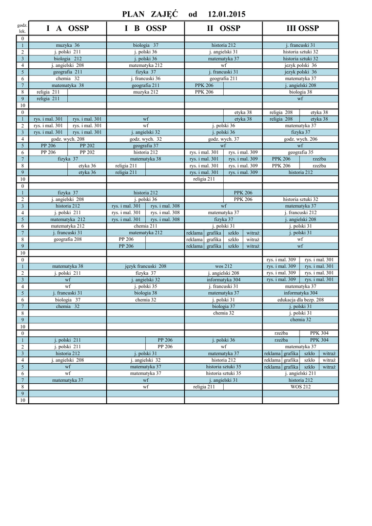 PLAN ZAJĘĆ od 12.01.2015 I A OSSP I B OSSP II OSSP III OSSP