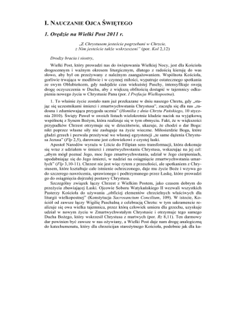 I. NAUCZANIE OJCA ŚWIĘTEGO 1. Orędzie na Wielki Post 2011 r. „Z Chrystusem jesteście pogrzebani w Chrzcie, z Nim jesteście także wskrzeszeni” (por. Kol 2,12) Drodzy bracia i siostry, Wielki Post, który prowadzi nas do świętowania Wielkiej Nocy, jest dla Kościoła drogocennym i ważnym okresem liturgicznym, dlatego z radością kieruję do was słowo, aby był on przeżywany z należnym zaangażowaniem. Wspólnota Kościoła, gorliwie trwająca w modlitwie i w czynnej miłości, wypatruje ostatecznego spotkania ze swym Oblubieńcem, gdy nadejdzie czas wiekuistej Paschy, intensyfikuje swoją drogę oczyszczenia w Duchu, aby z większą obfitością dostąpić w tajemnicy odkupienia nowego życia w Chrystusie Panu (por. I Prefacja Wielkopostna). 1. To właśnie życie zostało nam już przekazane w dniu naszego Chrztu, gdy „stając się uczestnikami śmierci i zmartwychwstania Chrystusa”, zaczęła się dla nas „radosna i zdumiewająca przygoda ucznia” (Homilia z dnia Chrztu Pańskiego, 10 stycznia 2010). Święty Paweł w swoich listach wielokrotnie kładzie nacisk na wyjątkową wspólnotę z Synem Bożym, która realizuje się w tym obmyciu. Fakt, że w większości przypadków Chrzest otrzymuje się w dzieciństwie, ukazuje, że chodzi o dar Boga: nikt poprzez własne siły nie zasługuje na życie wieczne. Miłosierdzie Boga, które gładzi grzech i pozwala przeżywać we własnej egzystencji „te same dążenia Chrystusa Jezusa” (Flp 2,5), darowane jest człowiekowi z czystej łaski. Apostoł Narodów wyraża w Liście do Filipian sens transformacji, która dokonuje się wraz z udziałem w śmierci i zmartwychwstaniu Chrystusa, wskazując na jej cel: „abym mógł poznać Jego, moc Jego zmartwychwstania, udział w Jego cierpieniach, upodabniając się do Jego śmierci, w nadziei na osiągnięcie zmartwychwstania umarłych” (Flp 3,10-11). Chrzest nie jest więc rytem z przeszłości, ale spotkaniem z Chrystusem, które kształtuje całe istnienie ochrzczonego, daje mu życie Boże i wzywa go do szczerego nawrócenia, sprawionego i podtrzymanego przez Łaskę, które prowadzi go do osiągnięcia dojrzałej postawy Chrystusa. Szczególny związek łączy Chrzest z Wielkim Postem, jako czasem dobrym do przeżycia zbawiającej Łaski. Ojcowie Soboru Watykańskiego II wezwali wszystkich Pasterzy Kościoła do używania „obficiej elementów chrzcielnych właściwych dla liturgii wielkopostnej” (Konstytucja Sacrosanctum Concilium, 109). W istocie, Kościół od zawsze łączy Wigilię Paschalną z celebracją Chrztu: w tym sakramencie realizuje się owa wielka tajemnica, przez którą człowiek umiera dla grzechu, uzyskuje udział w nowym życiu w Zmartwychwstałym Chrystusie i otrzymuje tego samego Ducha Bożego, który wskrzesił Chrystusa z martwych (por. Rz 8,11). Ten darmowy dar powinien być zawsze w nas ożywiany, a Wielki Post daje nam drogę analogiczną do katechumenatu, który dla chrześcijan starożytnego Kościoła, podobnie jak dla ka- 6 Nauczanie Ojca Świętego techumenów dzisiejszych, jest niezastąpioną szkołą wiary i życia chrześcijańskiego: oni naprawdę przeżywają Chrzest jako akt decydujący dla całej ich egzystencji. 2. Aby wejść na poważnie na drogę wiodącą do Wielkiej Nocy i przygotować się do świętowania Zmartwychwstania Pańskiego – najradośniejszego i najuroczystszego święta całego roku liturgicznego – cóż może być bardziej stosowne, niż pozwolić się prowadzić Słowu Bożemu? Dlatego Kościół, w tekstach ewangelicznych kolejnych niedziel Wielkiego Postu, prowadzi nas do szczególnie intensywnego spotkania z Panem, zapraszając nas do przebiegnięcia na nowo etapów chrześcijańskiego wtajemniczenia: dla katechumenów w perspektywie otrzymania sakramentu odrodzenia, dla ochrzczonych w perspektywie nowych i decydujących kroków w naśladowaniu Chrystusa i w jeszcze głębszym darze dla Niego. Pierwsza niedziela wielkopostnej drogi ukazuje naszą sytuację człowieka na tej ziemi. Zwycięska walka z pokusami, która rozpoczyna misję Jezusa, jest zaproszeniem do uświadomienia sobie własnej ułomności, aby przyjąć Łaskę, która uwalnia z grzechu i wlewa nową siłę w Chrystusie jako drodze, prawdzie i życiu (por. Obrzędy Chrześcijańskiego Wtajemniczenia Dorosłych, n. 25). Jest stanowczym wezwaniem by przypomnieć, jak wiara chrześcijańska implikuje, na wzór Chrystusa i w jedności z Nim, walkę „z władcami tego świata pogrążonego w ciemnościach” (Ef 6,12), w którym diabeł działa i nie ustaje, także i dzisiaj, w kuszeniu człowieka, który chce zbliżyć się do Pana: Chrystus wychodzi z niej zwycięski, aby otworzyć nasze serce na nadzieję i prowadzić nas do zwyciężania pokus zła. Ewangelia o Przemienieniu Pańskim stawia przed naszymi oczami chwałę Chrystusa, która antycypuje zmartwychwstanie i która zwiastuje przebóstwienie człowieka. Wspólnota chrześcijańska uświadamia sobie, że jest prowadzona, jak apostołowie Piotr, Jakub i Jan, „osobno, na wysoką górę” (Mt 17,1), aby przyjąć na nowo w Chrystusie, jako synowie w Synu, dar Łaski Bożej: „To jest mój Syn umiłowany, w którym sobie upodobałem. Słuchajcie Go” (w. 5). Jest to zaproszenie do oddalenia się od codziennego szumu, aby zanurzyć się w obecności Boga: On chce przekazać nam każdego dnia słowo, które przenika do głębin naszego ducha, gdzie rozróżnia dobro od zła (por. Hbr 4,12) i umacnia wolę pójścia za Panem. Prośba Jezusa do Samarytanki: „Daj mi pić” (J 4,7), która przekazana zostaje w liturgii trzeciej niedzieli, wyraża uczucie Boga do każdego człowieka i pragnie wzbudzić w naszym sercu pragnienie daru „wody, który tryska ku życiu wiecznemu” (w. 14): jest to dar Ducha Świętego, który czyni z chrześcijan „prawdziwych czcicieli”, którzy modlą się do Ojca „w duchu i prawdzie” (w. 23). Tylko ta woda może ugasić nasze pragnienie 