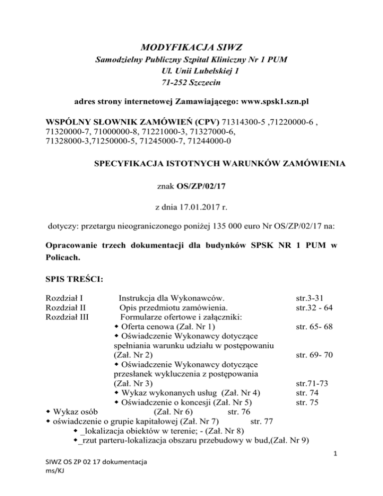 MODYFIKACJA SIWZ Samodzielny Publiczny Szpital Kliniczny Nr 1 PUM Ul. Unii Lubelskiej 1 71-252 Szczecin adres strony internetowej Zamawiającego: www.spsk1.szn.pl WSPÓLNY SŁOWNIK ZAMÓWIEŃ (CPV) 71314300-5 ,71220000-6 , 71320000-7, 71000000-8, 71221000-3, 71327000-6, 71328000-3,71250000-5, 71245000-7, 71244000-0 SPECYFIKACJA ISTOTNYCH WARUNKÓW ZAMÓWIENIA znak OS/ZP/02/17 z dnia 17.01.2017 r. dotyczy: przetargu nieograniczonego poniżej 135 000 euro Nr OS/ZP/02/17 na: Opracowanie trzech dokumentacji dla budynków SPSK NR 1 PUM w Policach. SPIS TREŚCI: Rozdział I Rozdział II Rozdział III Instrukcja dla Wykonawców. str.3-31 Opis przedmiotu zamówienia. str.32 - 64 Formularze ofertowe i załączniki: Oferta cenowa (Zał. Nr 1) str. 65- 68 Oświadczenie Wykonawcy dotyczące spełniania warunku udziału w postępowaniu (Zał. Nr 2) str. 69- 70 Oświadczenie Wykonawcy dotyczące przesłanek wykluczenia z postępowania (Zał. Nr 3) str.71-73 Wykaz wykonanych usług (Zał. Nr 4) str. 74 Oświadczenie o koncesji (Zał. Nr 5) str. 75 Wykaz osób (Zał. Nr 6) str. 76 oświadczenie o grupie kapitałowej (Zał. Nr 7) str. 77 _lokalizacja obiektów w terenie; - (Zał. Nr 8) _rzut parteru-lokalizacja obszaru przebudowy w bud,(Zał. Nr 9) 1 SIWZ OS ZP 02 17 dokumentacja ms/KJ zakres dokumentacji przebudowy BO, (Zał. Nr 10) zakres dokumentacji przebudowy OIOM, (Zał. Nr 11) mapa zasadnicza (Zał. Nr 12) Rozdział IV Projekt umowy. str. 78- 102 ……………….…………………. zatwierdził Kierownik Zamawiającego Podstawa prawna: Ustawa z dnia 29.01.2004 r. Prawo zamówień publicznych z późniejszymi zmianami. Podane w dalszej części SIWZ bez bliższego oznaczenia artykuły są artykułami tej ustawy. 2 SIWZ OS ZP 02 17 dokumentacja ms/KJ ROZDZIAŁ I INSTRUKCJA DLA WYKONAWCÓW 1. Opis sposobu przygotowania ofert 1.1. 1.2. 1.3. 1.4. 1.5. 1.6. 1.7. 1.8. 1.9. 1.10. 1.11. 1.12. 1.13. Oferta powinna być sporządzona na Formularzu Oferty, stanowiącym załącznik Nr 1 do Specyfikacji Istotnych Warunków Zamówienia. Treść oferty musi odpowiadać treści SIWZ. Cena podana w ofercie ma obejmować wszystkie upusty i rabaty. Do oferty muszą być dołączone wszystkie dokumenty wymienione w punkcie 4 instrukcji dla Wykonawców. W przypadku, gdy Wykonawca, jako załącznik do oferty, dołącza kopię jakiegoś dokumentu, każda strona tego dokumentu musi być potwierdzona za zgodność z oryginałem przez osoby upoważnione do reprezentowania Wykonawcy. Upoważnienie do podpisania oferty musi być dołączone do oferty, o ile nie wynika z innych dokumentów załączonych przez Wykonawcę. W przypadku wykonawców wspólnie ubiegających się o udzielenie zamówienia oraz w przypadku innych podmiotów, na zasobach których wykonawca polega na zasadach określonych w art. 26 ust. 2b ustawy, kopie dokumentów dotyczących odpowiednio wykonawcy lub tych podmiotów są poświadczane za zgodność z oryginałem odpowiednio przez wykonawcę lub te podmioty. Upoważnienie do podpisania tych dokumentów musi być dołączone do oferty, o ile nie wynika z innych dokumentów załączonych przez Wykonawcę. Oferta musi zawierać spis treści z podaniem stron na których znajdują się poszczególne dokumenty. Wykonawcy sporządzą oferty zgodnie z wymaganiami Specyfikacji Istotnych Warunków Zamówienia. Zamawiający nie dopuszcza możliwości złożenia oferty wariantowej. Wykonawcy mogą wspólnie ubiegać się o udzielenie zamówienia. Wykonawcy ustanawiają pełnomocnika do reprezentowania ich w postępowaniu o udzielenie zamówienia albo reprezentowania w postępowaniu i zawarcia umowy w sprawie zamówienia publicznego. Oferta musi być sporządzona w języku polskim na komputerze, ręcznie długopisem lub nieścieralnym atramentem. Dokumenty sporządzone w języku obcym są składane wraz z tłumaczeniem na język polski. 3 SIWZ OS ZP 02 17 dokumentacja ms/KJ 1.14. Wszelkie miejsca, w których Wykonawca naniósł zmiany, muszą być parafowane przez osoby upoważnione do reprezentacji Wykonawcy. 1.15. Zamawiający nie dopuszcza składania ofert częściowych. 1.16. Wykonawca zamieszcza ofertę wraz z wymaganymi dokumentami w kopercie posiadającej: - nazwę i adres Zamawiającego, - nazwę i adres Wykonawcy - oznaczenie: „przetarg nieograniczony Nr OS/ZP/02/17 – dokumentacje” nie otwierać przed 27.01.2017 r.(termin składania ofert) 1.17. Wykonawca może przed upływem do terminu do składania ofert, zmienić lub wycofać ofertę. 1.18. Zamawiający niezwłocznie zwróci ofertę która została złożona po terminie. 1.19. Rozliczenia pomiędzy Zamawiającym a Wykonawcą prowadzone będą w PLN. 1.20. Niniejsze postępowanie prowadzi się z zachowaniem formy pisemnej lub mailem. 1.21. Wykonawca ponosi wszelkie koszty związane z przygotowaniem i złożeniem oferty. 2. Odrzucenie ofert. 1. O udzielenie zamówienia ubiegać się mogą Wykonawcy, którzy złożą nie podlegającą odrzuceniu ofertę. 2. Ofertę odrzuca się, jeżeli: 1) jest niezgodna z ustawą; 2) jej treść nie odpowiada treści specyfikacji istotnych warunków zamówienia z zastrzeżeniem art. 87 ust.2 pkt 3 3) jej złożenie stanowi czyn nieuczciwej konkurencji w rozumieniu przepisów o zwalczaniu nieuczciwej konkurencji; 4) zawiera rażąco niską cenę lub koszt w stosunku do przedmiotu zamówienia; 5) została złożona przez Wykonawcę wykluczonego z udziału w postępowaniu o udzielenie zamówienia, 6) zawiera błędy w obliczeniu ceny lub kosztu; 7) Wykonawca w terminie 3 dni od dnia doręczenia zawiadomienia nie zgodził się na poprawienie omyłki, o której mowa w art. 87 ust. 2 pkt 3, 8) wykonawca nie wyraził zgody, o której mowa w art. 85 ust. 2, na przedłużenie terminu związania ofertą; 4 SIWZ OS ZP 02 17 dokumentacja ms/KJ 9) wadium nie zostało wniesione lub zostało wniesione w sposób nieprawidłowy, jeżeli zamawiający żądał wniesienia wadium; 10) jej przyjęcie naruszałoby bezpieczeństwo pub