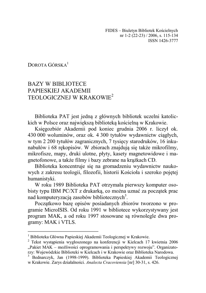 FIDES – Biuletyn Bibliotek Kościelnych nr 1-2 (22-23) / 2006, s. 115-134 ISSN 1426-3777 DOROTA GÓRSKA1 BAZY W BIBLIOTECE PAPIESKIEJ AKADEMII TEOLOGICZNEJ W KRAKOWIE2 Biblioteka PAT jest jedną z głównych bibliotek uczelni katolickich w Polsce oraz największą biblioteką kościelną w Krakowie. Księgozbiór Akademii pod koniec grudnia 2006 r. liczył ok. 430 000 woluminów, oraz ok. 4 300 tytułów wydawnictw ciągłych, w tym 2 200 tytułów zagranicznych, 7 tysięcy starodruków, 16 inkunabułów i 68 rękopisów. W zbiorach znajdują się także mikrofilmy, mikrofisze, mapy, druki ulotne, płyty, kasety magnetowidowe i magnetofonowe, a także filmy i bazy zebrane na krążkach CD. Biblioteka koncentruje się na gromadzeniu wydawnictw naukowych z zakresu teologii, filozofii, historii Kościoła i szeroko pojętej humanistyki. W roku 1989 Biblioteka PAT otrzymała pierwszy komputer osobisty typu IBM PC/XT z drukarką, co można uznać za początek prac nad komputeryzacją zasobów bibliotecznych3. Początkowo bazę opisów posiadanych zbiorów tworzono w programie MicroISIS. Od roku 1991 w bibliotece wykorzystywany jest program MAK, a od roku 1997 stosowane są równolegle dwa programy: MAK i VTLS. 1 Biblioteka Główna Papieskiej Akademii Teologicznej w Krakowie. Tekst wystąpienia wygłoszonego na konferencji w Kielcach 17 kwietnia 2006 „Pakiet MAK – możliwości oprogramowania i perspektywy rozwoju”. Organizatorzy: Wojewódzkie Biblioteki w Kielcach i w Krakowie oraz Biblioteka Narodowa. 3 Bednarczyk, Jan (1998-1999). Biblioteka Papieskiej Akademii Teologicznej w Krakowie. Zarys działalności. Analecta Cracoviensia [nr] 30-31, s. 426. 2 116 FIDES – Biuletyn Bibliotek Kościelnych 1-2/2006 Nowo nabywane książki są opracowywane w systemie VTLS/VIRTUA w formacie MARC 21. Baza ta liczyła w pod koniec 2006 roku 67 000 opisów bibliograficznych, 91 000 rekordów haseł wzorcowych, 2 500 opisów wydawnictw ciągłych oraz ponad 100 000 rekordów egzemplarzy. Program MAK jest nadal wykorzystywany w bibliotece i służy do tworzenia baz danych. Obecnie w bibliotece PAT utrzymywanych jest 8 baz MAK’owskich. Najważniejszą bazą jest codziennie uzupełniana BAZA GROMADZENIA druków zwartych. Baza ta założona w 1991 roku jest prowadzona w formacie MARC BN. Wpisywane są tutaj wszystkie nowości, opracowywane później w programie VIRTUA. W bazie znajduje się obecnie 33 700 dokumentów. Baza GROM zawiera opisy książek przechowywanych w bibliotece głównej. Bazę Gromadzenia można przeszukiwać według następujących indeksów: autorskiego, tytułowego, wydawnictw, serii, indeksu rzeczowego haseł przedmiotowych, sygnatur i lokalizacji. Dla potrzeb księgowych stworzono indeksy: sposób i źródło nabycia, numer akcesji, i numer inwentarzowy. Baza ta używana jest tylko dla wewnętrznych potrzeb biblioteki. Z ŻYCIA BIBLIOTEK : Górska D., Bazy… 117 Kolejną bazą tworzoną w programie MAK są bazy zawierające informacje o darach książkowych otrzymywanych przez bibliotekę – BAZA DARY. Najcenniejsze wśród opisanych zbiorów są dary pochodzące od ks. Rapacza – 11 000 dokumentów, dar biskupa Tadeusza Pieronka – 2 610 dok, dar pochodzący z kolekcji ks. prof. Józefa Tischnera – 745 pozycji, księgozbiór pochodzący z zapisu prof. Szpili – 883. 118 FIDES – Biuletyn Bibliotek Kościelnych 1-2/2006 W magazynach przechowywany jest także wciąż powiększający się dar przekazywany z Watykanu – ponad 7 000 pozycji. Razem w Bazie Darów znajduje się ok. 30 000 pozycji. Z ŻYCIA BIBLIOTEK : Górska D., Bazy… 119 W bibliotece znajduje się także specjalna BAZA danych poświęcona ZAWARTOŚCI WYBRANYCH CZASOPISM. Analizowane czasopisma to: „Analecta Cracoviensia”, „Cały Kościół jest Misyjny”, „Idźcie na cały świat”, „Informacje Misyjne”, „Mysterium Christi - Czasopismo Liturgiczne” (tytuł przedwojenny), „Notificationes e Curia Metropolitana Cracoviensia”, „Ruch Biblijny i Liturgiczny”, „Vita Academica” oraz „Znak”. Łącznie w bazie znajduje się ok. 10 000 dokumentów, które mogą być przeglądane według następujących indeksów: autorski, serii, tytułów artykułów i tytułów czasopism, indeksu rzeczowego i języków). 120 FIDES – Biuletyn Bibliotek Kościelnych 1-2/2006 W zbiorach biblioteki PAT przechowywanych jest około 7 tysięcy starych druków. Dla zbiorów specjalnych prowadzony jest tradycyjny katalog kartkowy. Od roku 2004 zbiory są katalogowane w programie MAK. Obecnie w bazie jest wpisanych 2 500 dokumentów. Są one wprowadzane w formacie MARC BN – z dodatkowymi polami stworzonymi dla potrzeb zbiorów specjalnych (pierwsza wersja formatu Marc 21 dla rekordu bibliograficznego starego druku opracowana przez panią Halinę Mieczkowską powstała w lipcu 2005). Obecnie trwają prace mające na celu konwersję zawartości bazy starych druków z formatu MARC BN do przygotowanego już formatu MARC 21. Najstarszy opisany dokument pochodzi z roku 1553 Z ŻYCIA BIBLIOTEK : Górska D., Bazy… 121 Bazę ZBIORÓW SPECJALNYCH można przeszukiwać według indeksu autorskiego, tytułowego, wydawnictw, serii, sygnatur, a także indeksu rzeczowego i haseł przedmiotowych. Ze strony domowej Biblioteki dostępny jest katalog on-line tworzony w programie VIRTUA oraz dwie bazy prowadzone w programie MAK WWW. Do organizacji tych baz stworzono w bibliotece unikatowe formaty. 122 FIDES – Biuletyn Bibliotek Kościelnych 1-2/2006 Pierwsza z nich to bardzo cenna, bo jedyna w Polsce, BAZA ŚWIĘTYCH I BŁOGOSŁAWIONYCH. Baza ta zawiera opisy bibliograficzne dokumentów dotyczących całego procesu beatyfikacyjnego i kanonizacyjnego. Opisywane publikacje, znajdujące się w zbiorach bibliotecznych, pochodzą z daru Kongregacji do Spraw Świętych (powołanej w 1588 roku). Są one napisane w języku łacińskim lub włoskim. Do tej pory w bazie można oglądać 483 opisy. Baza jest systematycznie uzupe