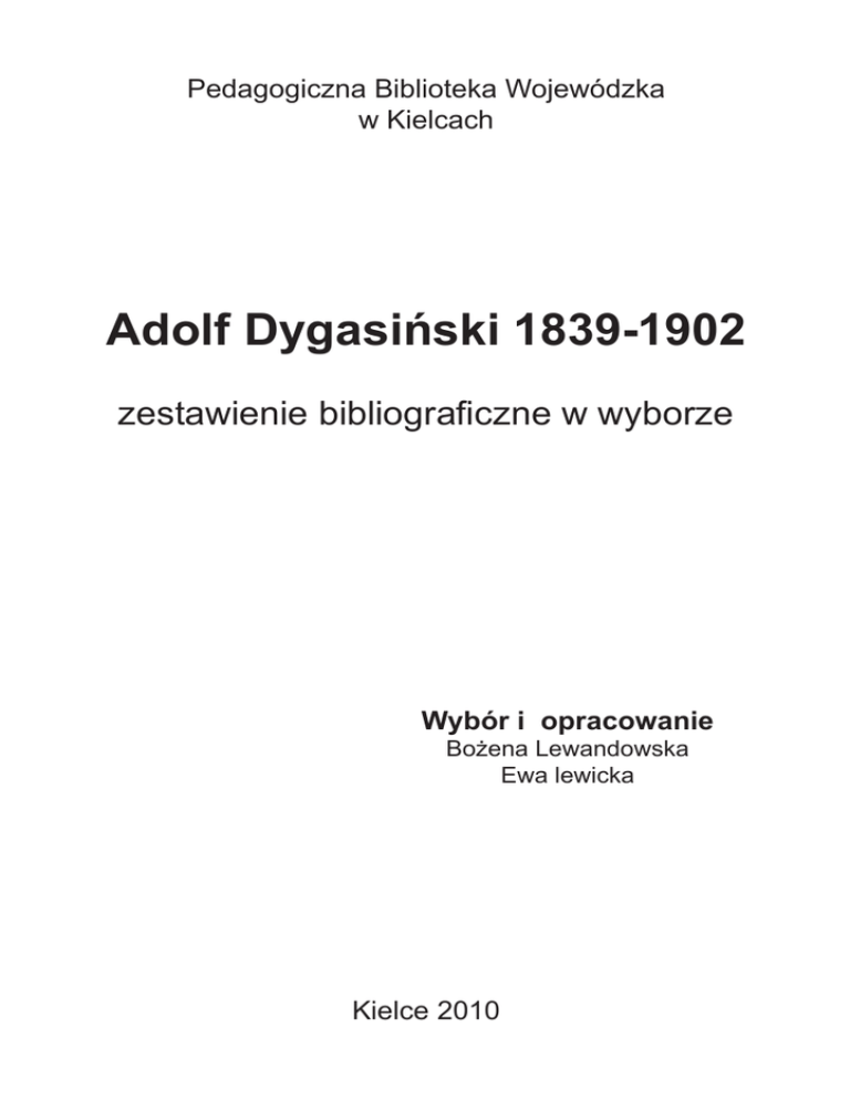 Pedagogiczna Biblioteka Wojewódzka w Kielcach Adolf Dygasiński 1839-1902 zestawienie bibliograficzne w wyborze Wybór i opracowanie Bożena Lewandowska Ewa lewicka Kielce 2010 2 Wydawnictwa zwarte 1. Brzozowska, Danuta : Adolf Dygasiński / Danuta Brzozowska. – Warszawa : Wiedza Powszechna, 1957 Wypożyczalnia 21742-21745 2. Brzozowska, Danuta : Adolf Dygasiński 1839-1902 // W : Obraz literatury polskiej XIX i XX wieku. Seria 4 : Literatura polska w okresie realizmu i naturalizmu. T. 4 / red. Janina Kulczycka-Saloni, Henryk Markiewicz, Zbigniew Żabicki. – Warszawa : Państwowe Wydawnictwo Naukowe, 1971. – S. 7-52 Czytelnia 85228 Wydział Informacyjno-Bibliograficzny 98979 Wypożyczalnia 85229-85230 3. Dawni pisarze polscy od początków piśmiennictwa do Młodej Polski : przewodnik biograficzny i bibliograficzny. ��������������������� T. 1 : A-H / red. Ta��� deusz Witczak i in. Warszawa : Wydawnictwa Szkolne i Pedagogiczne, 2000. – S. 258-262 : Dygasiński Adolf Wydział Informacyjno-Bibliograficzny 233973 4. Dygasińska-Wolertowa, Zofja : Z pamiętnika córki / Zofia Dygasińska-Wolertowa // W : Pamiętnik Koła Kielczan za 1932 rok. T. 5. – Kielce : Wydawn. Koła Kielczan, 1933. – S. 27-34 5. Czytelnia 21689 S, dział R 6. [Dygasiński Adolf] Adolf Dygasiński człowiek z Ponidzia : materiały z sesji popularnonaukowej zorganizowanej w 160 rocznicę urodzin Pisarza przez Muzeum Regionalne oraz Mijska i Gminną Bibliotekę im. Jana Olrycha Szanieckiego w Pińczowie. Pińczów 14 kwietnia 1999 / oprac. Andrzej Dziubiński i in. – Pińczów : Starostwo Powiatowe, 1999 Czytelnia 234260, dział 92 3 7. Dygasiński, Adolf : Listy / Adolf Dygasiński ; wstęp Jan Zygmunt Jakubowski ; komentarze biograficzne Andrzej Górski ; przygot. tekstów i red. Tadeusz Nuckowski. – Wrocław : Zakład Narod. im. Ossolińskich, 1972 Wypożyczalnia 88831-88832 8. Dygasiński, Adolf : W Kielcach : opowiadania i uwagi o czasach szkolnych / Adolf Dygasiński. – Warszawa : Biblioteka Polska, b.r. – (Pisma Adolfa Dygasińskiego. T. 30) Czytelnia 101776 S, dział R 9. Dygasiński, Adolf : W Kielcach : opowiadania i uwagi o czasach szkolnych. W Swojczy czyli żywot poczciwego włościanina / Adolf Dygasiński. – Warszawa : Książka i Wiedza, 1952. – (Pisma wybrane / pod red. B. Horodyskiego. T. 13) Wypożyczalnia 9632, 10828, 60458 10. Dygasiński, Adolf : W puszczy : (pół fantazji na tle wspomnień) / Adolf Dygasiński. – Wyd. 2. – Warszawa : Gebethner i Wolff, 1947. – (Biblioteczka Uniwersytetów Ludowych ; 36) Wypożyczalnia 54494, 101779 11. Górski, Andrzej : Człowiek z Rędzin : opowieść o Adolfie Dygasińskim / Andrzej Górski. – Warszawa : Pax, 1958 Biblioteka Główna Akademii Świętokrzyskiej Czytelnia Główna Akademii Świętokrzyskiej 12. Górski, Andrzej : Kleryk wędrujący : opowieść o Adolfie Dygasińskim / Andrzej Górski. – Pax , 1960 [Początek pt. „Człowiek z Rędzin”] Czytelnia 204785, dział R 92 Wypożyczalnia 26442, 26516 4 13. Jakubowski, Jan Zygmunt : Zapomniane ogniwo : studium o Adolfie Dygasińskim / Jan Zygmunt Jakubowski. – Warszawa : Ludowa Spółdzielnia Wydawnicza, 1967 [Monografia życia i twórczości] Czytelnia 48292, dział 92 Wypożyczalnia 48293-48296 14. Jakubowski, Jan Zygmunt : Zapomniane ogniwo : studium o Adolfie Dygasińskim. Wyd. 2 / Jan Zygmunt Jakubowski. – Warszawa : Ludowa Spółdzielnia Wydawnicza, 1978 [Monografia życia i twórczości] Wypożyczalnia 138735 15. Księga Pamiątkowa Kielczan 1856-1904 : wydana z okazji zjazdu wychowańców gimnazjum w Kielcach 7 i 8 września 1924 r. / pod red. Tomasza Ruśkiewicza – Warszawa : Nakł. Uczestników Zjazdu, 1925. – S. 208-209 : Adolf Dygasiński znakomity pedagog, krytyk i powieściopisarz Czytelnia 21691 S, dział R 37 16. Mijas, Stanisław : Świętokrzyskie szlaki literackie : szkice o pisarzach od Reja do Żeromskiego / Stanisław Mijas. – Łódź : Wydaw. Łódzkie, 1973. – S. 131-147 Czytelnia 97104, dział R 8 Wypożyczalnia 97102-97103, 224631 17. O Adolfie Dygasińskim : materiały z sesji naukowej w 75-lecie śmierci pisarza / red. Helena Wolny. – Kielce : IKNiBO, 1979 Czytelnia 152669, dział 92 Wypożyczalnia 189048 5 18. O twórczości i życiu Adolfa Dygasińskiego : materiały z sesji naukowej w 150 rocznicę urodzin pisarza / pod red. Heleny Wolny. – Kielce : OCDN, 1990 Czytelnia 208608, dział 92 Wypożyczalnia 208609 19. Wasilewski, Zygmunt : Współcześni : charakterystyki pisarzy i dzieł / Zygmunt Wasilewski. – Warszawa : Gebethner i Wolff, 1923. – S. 164-197 : Adolf Dygasiński Czytelnia 34843 S, dział 8 20. Wolert, Władysław : Dygasiński Tomasz Adolf // W : Polski Słownik Biograficzny. T.6 / red. Władysław Konopczyński. – Kraków : Polska Akademia Umiejętności, 1948. – S. 49-52. – Bibliogr. Czytelnia 99243, dział Sł. 92 21. Wolny, Helena : O zainteresowaniach Adolfa Dygasińskiego – pisarza i pedagoga (na podstawie jego księgozbioru) // W : Literatura i język polski : materiały pomocnicze dla nauczycieli / red. Aleksander Kozub. Cz. 3. – Kielce : Instytut Kształcenia Nauczycieli, 1984. – S. 75-107. – Bibliogr. Czytelnia 177388, dział Met. Jęz. Pol. Wypożyczalnia 189049, 195014 Wydawnictwa ciągłe 22. Adamczyk, Zdzisłąw J. : Pominięty list Adolfa Dygasińskiego / Zdzisłąw J. Adamczyk // „Przemiany”. – 1973, nr 2, s. 24-25 23. Borkiewicz, S. : Dobry przyczynek do życiorysu Dygasińskiego / S. Borkiewicz // „Radostowa”. – 1939, nr1/2, s. 7 24. Gębica, Jan : Adolf Dygasiński / Jan Gębica // „Radostowa”. – 1937, nr 3, s. 47-49, il. 6 25. Jakubowski, Jan Zymunt : Dzieje polskiego pisarza / Jan Zygmunt Jakubowski // „Przegląd Humanistyczny”. – 1959, nr 6, s. 1546 [Adolf Dygasiński w świetle korespondencji.] 26. Kwieciński, Zdzisław : O Adolfie Dygasińskim : w Kielcach i Pińczowie (sesja w 60-lecie śmierci 