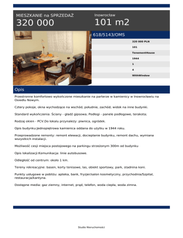 Inowrocław MIESZKANIE na SPRZEDAŻ 101 m2 320 000 618/5143/OMS 320 000 PLN 101 TenementHouse 1944 1 4 WithWindow Opis Przestronne komfortowo wykończone mieszkanie na parterze w kamienicy w Inowrocławiu na Osiedlu Nowym. Cztery pokoje, okna wychodzące na wschód, południe, zachód; widok na inne budynki. Standard wykończenia: Ściany - gładź gipsowa; Podłogi - panele podłogowe, terakota; Rodzaj okien - PCV.Do lokalu przynależy: piwnica, ogródek. Opis budynku:Jednopiętrowa kamienica oddana do użytku w 1944 roku. Przeprowadzone remonty: remont elewacji, docieplanie budynku, remont dachu, wymiana wszystkich instalacji. Możliwość cesji miejsca postojowego na parkingu strzeżonym 300m od budynku Opis lokalizacji:Komunikacja: linie autobusowe. Odległość od centrum: około 1 km. Tereny rekreacyjne: basen, korty tenisowe, las, obiekt sportowy, park, stadnina koni. Punkty usługowe w pobliżu: apteka, bank, fryzjer/salon kosmetyczny, przychodnia/Szpital, restauracja/kantyna. Dostępne media: gaz ziemny, internet, prąd, telefon, woda ciepła, woda zimna. Studio Nieruchomości tel. 793 585 793 email: [email protected] Studio Nieruchomości Powered by TCPDF (www.tcpdf.org)