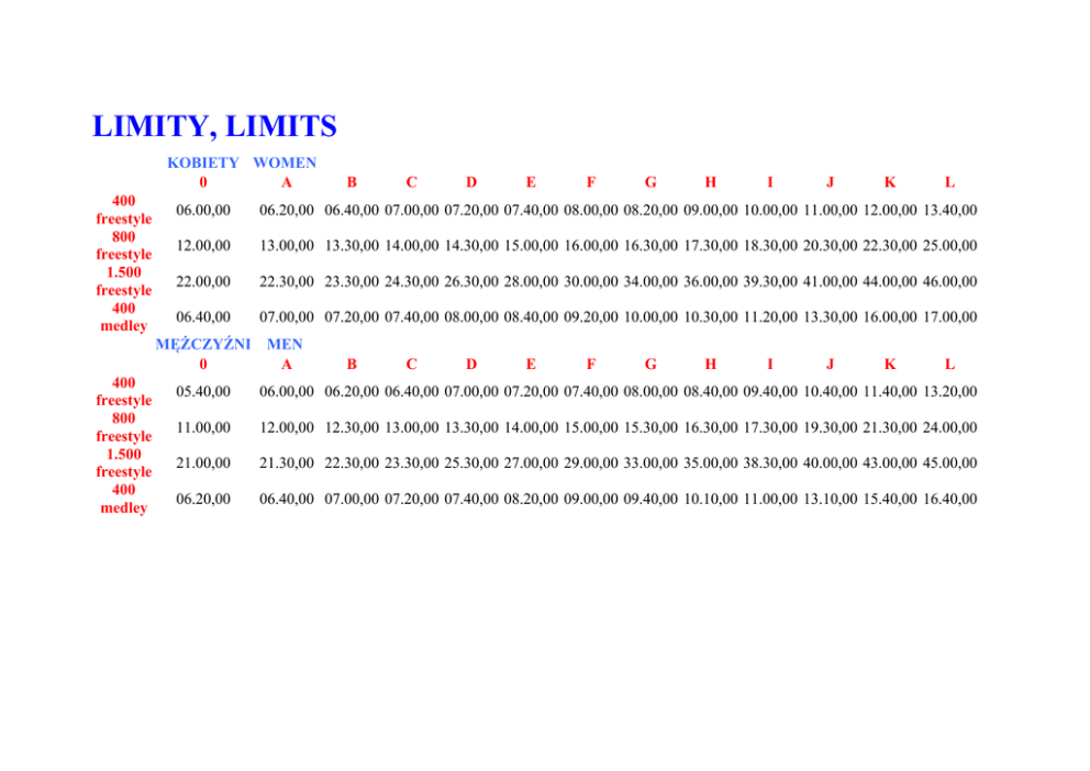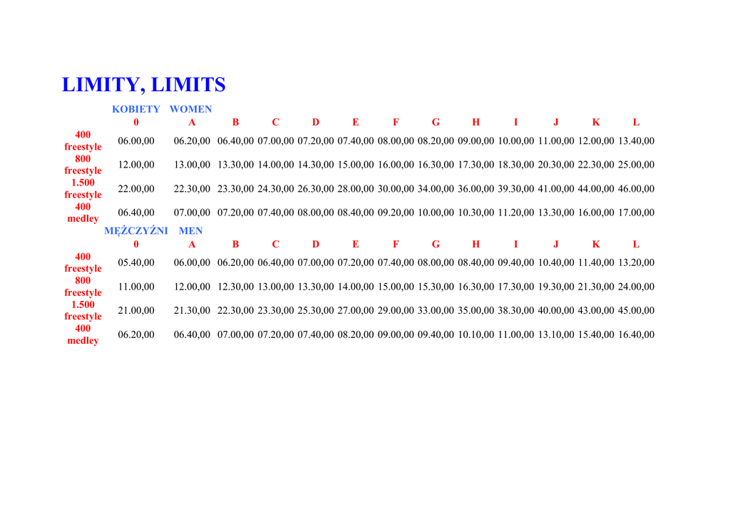 LIMITY, LIMITS KOBIETY WOMEN 0 A 400 freestyle 800 freestyle 1.500 freestyle 400 medley C D E F G H I J K L 06.00,00 06.20,00 06.40,00 07.00,00 07.20,00 07.40,00 08.00,00 08.20,00 09.00,00 10.00,00 11.00,00 12.00,00 13.40,00 12.00,00 13.00,00 13.30,00 14.00,00 14.30,00 15.00,00 16.00,00 16.30,00 17.30,00 18.30,00 20.30,00 22.30,00 25.00,00 22.00,00 22.30,00 23.30,00 24.30,00 26.30,00 28.00,00 30.00,00 34.00,00 36.00,00 39.30,00 41.00,00 44.00,00 46.00,00 06.40,00 07.00,00 07.20,00 07.40,00 08.00,00 08.40,00 09.20,00 10.00,00 10.30,00 11.20,00 13.30,00 16.00,00 17.00,00 MĘŻCZYŹNI MEN 0 A 400 freestyle 800 freestyle 1.500 freestyle 400 medley B B C D E F G H I J K L 05.40,00 06.00,00 06.20,00 06.40,00 07.00,00 07.20,00 07.40,00 08.00,00 08.40,00 09.40,00 10.40,00 11.40,00 13.20,00 11.00,00 12.00,00 12.30,00 13.00,00 13.30,00 14.00,00 15.00,00 15.30,00 16.30,00 17.30,00 19.30,00 21.30,00 24.00,00 21.00,00 21.30,00 22.30,00 23.30,00 25.30,00 27.00,00 29.00,00 33.00,00 35.00,00 38.30,00 40.00,00 43.00,00 45.00,00 06.20,00 06.40,00 07.00,00 07.20,00 07.40,00 08.20,00 09.00,00 09.40,00 10.10,00 11.00,00 13.10,00 15.40,00 16.40,00