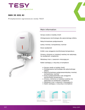 IWH 35 X01 KI Przepływowe ogrzewacze wody TESY Main information Gorąca woda w każdej chwili Zintegrowana technologia dla optymalnego efektu Natychmiastowe podgrzewanie Łatwy montaż, kompaktowy rozmiar Duża wydajność Krótki czas osiągania komfortowej temperatury Zmiany ciśnienia w instalacji wodnej nie wpływają na wydajność urządzenia Metalowy kran z zaworem mieszającym. Kabel zasilający z wtyczką w komplecie Gorąca woda w każdej chwili Zintegrowana technologia dla optymalnego efektu Natychmiastowe podgrzewanieŁatwy montaż, kompaktowy rozmiar Duża wydajnośćKrótki czas osiągania komfortowej temperatury Zmiany ciśnienia w instalacji wodnej nie wpływają na wydajność urządzenia Metalowy kran z zaworem mieszającym. Kabel zasilający z wtyczką w komplecie Kabel zasilający z wtyczką w komplecie 1/2 Gorąca woda w każdej chwili Metalowy kran z zaworem mieszającym tesy.com IWH 35 X01 KI Przepływowe ogrzewacze wody TESY Technical characteristics 2/2 Gwarancja 5 lat na zbiornik, 2 lata na części elektryczne (warunkiem 5 letniej gwarancji na zbiornik jest wymiana anody elektrycznej co 2 lata) Profil obciążenia XXS Klasa energetyczna A Roczne zużycie energii (AEC) 478 Instalacja Nad zlewem Waga netto [kg] 1.11 Wymiary Wys. /Szer. / Gł. [m] 0.200 x 0.130 x 0.076 Akcesoria Metalowy zawór mieszający Przepływ przy ∆t 25°C [l/min] 2.0 Średnica króćców przyłączeniowych [mm] 10 Zalecany rozmiar kabla [mm²] 2.5 Zalecana wartość bezpiecznika [A] 20 Moc znamionowa [W] 3500 Napięcie znamionowe [V/Hz] 230/50 tesy.com