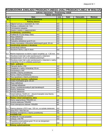 Załącznik Nr 1 ROZBUDOWA ZAKŁADU PRODUKCYJNEGO (HALI PRODUKCYJNEJ) W WAŁCZU zakres rzeczowo - finansowy robót Tabela elementów L.p. A. 1. 1.1 1.2 1.3 1.4 2. 2.1 2.2 2.3 2.4 2.5 3. 3.1 3.2 3.3 3.4 3.5 4. 4.1 4.2 4.3 4.4 4.5 4.6 5. 5.1 5.2 5.3 5.4 5.5 5.6 5.7 6. 6.1 6.2 6.3 6.4 6.5 6.6 7. 7.1 7.2 7.3 8. J.m. Opis Roboty budowlane Roboty ziemne Zdjęcie humusu z wywozem do 1 km Wykopy z odwozem do 1 km Formowanie nasypów Zasyka z piasku z zagszczeniem Fundamenty i podwaliny Podkład B-10 pod stopy i ławy Stopy żelbetowe Ławy żelbetowe Podwaliny żelbetowe grub15 cm Ściany murowane z bloczków betonowych grub. 24 cm Konstrukcja stalowa z obudową Konstrukcja stalowa Obudowa dachu z płyt X-deck Blacha trapezowa na dachu częsci socjalnej gr. 1,25 mm Obudowa ścian hali z płyt warstwowych z rdzeniem styropianowym 10 cm w układzie poziomym Obudowa ścian hali z płyt warstwowych z rdzeniem z wełny mineralnej 10 cm w układzie poziomym Dach - pokrycie Pokrycie dachu z foli Ocieplenie z wełny mineralnej 18 cm Paroizolacja z folii Obróbki z blachy powlekanej Rynny z blachy powlekanej Rury spustowe z blachy powlekanej Konstrukcje murowe i zelbetowe Ściany murowane grub. 25 cm Słupy zelbetowe Podciagi żelbetowe Stropy z prefabrykowabych płyt kanałowych Wieńce żelbetowe Schody żelbetowe Kanał kablowy 12x25 cm - okucie krawędzi oraz blachy przekrycia dostarcza Inwestor Bramy i drzwi zewnętrzne, okna Bramy segmentowe 700x450 cm Kurtyna paskowa 700x450 Drzwi zewnętrzne stalowe 100x200 Pasma okienne z PCV wys. 120 cm, co szóste otwierane Okna PCV 150x150 cm Parapety zewnętrzna z blachy powlekanej Posadzki hali Podkład B-10 pod posadzki Izolacja z folii PE Posadzka przemysłowa grub 15 cm ze zbrojeniem rozproszonym w hali Roboty wykończeniowe 1 m3 m3 m3 m3 m3 m3 m3 m2 m2 t m2 m2 m2 m2 m2 m2 m2 mb mb m2 m3 m3 m2 m3 m2 mb szt szt szt m2 szt mb m3 m2 m2 Ilość Cena jedn. Wartość Załącznik Nr 1 8.1 8.2 8.3 8.4 8.5 8.6 8.7 8.8 8.9 8.10 8.11 8.12 8.13 9. 9.1 9.2 9.3 9.4 9.5 9.6 B. 1. 1.1 1.2 1.3 1.4 2. 2.1 2.2 2.3 2.4 2.5 2.6 2.7 C. 2.1 2.2 2.3 Ścianki działowe murowane 12 cm Ścianki sanitariatów z laminatu z drzwiami - po stronie Inwestora Tynki ścian Glazura do wys. 2,0 m Malowanie ścian i sufitów Drzwi 90x200 Drzwi 90x200 EI 60 Izolacja z płynnej folii Szlichta cementowa Posadzka z płytek gres ( płytki Inwestora) Posadzka z płytek gres Obłożenie schodów płytkami gres (płytki Inwestora) Balustrada stalowa schodów Roboty zewnętrzne Ocieplenie podwalin i ścian fundamentowych styrodurem 10 cm+ siatka i klej Tynk mozaikowy na cokole Ocieplenie ścian styropianem 10 cm + tynk cienkowarstwowy Opaska z otoczaków Podesty wejściowe betonowe Wycieraczki stalowe 100x60 Instalacje sanitarne Sieci zewnętrzne Kanalizacja deszczowa Kanalizacja sanitarna Wodociąg z hydrantem ppoż Przyłącze gazu n/c Instalacje wewnętrzne Instalacja wodociągowa i instalacja cwu z armaturą i bateriami Kanalizacja podposadzkowa z urządzeniami Kotłownia co i cwu Wentylacja stołówki Instalacja centralnego ogrzewania części socjalnej Wentylacjamechaniczna nawiewno- wywiewna Ogrzewanie hali produkcyjnej Roboty elektryczne Linia kablowa zasilająca Al 175 m Rozdzielnie z wyłacznikami 3 szt Wewnętrzne linie zasilające do 2 rozdzielni m2 m2 m2 m2 m2 szt szt m2 m2 m2 m2 m2 mb m2 m2 m2 mb m2 szt kpl kpl kpl kpl kpl kpl kpl kpl kpl kpl kpl kpl kpl kpl RAZEM A+B+C WYKONAWCA GGGGGGGGGGGGG 2