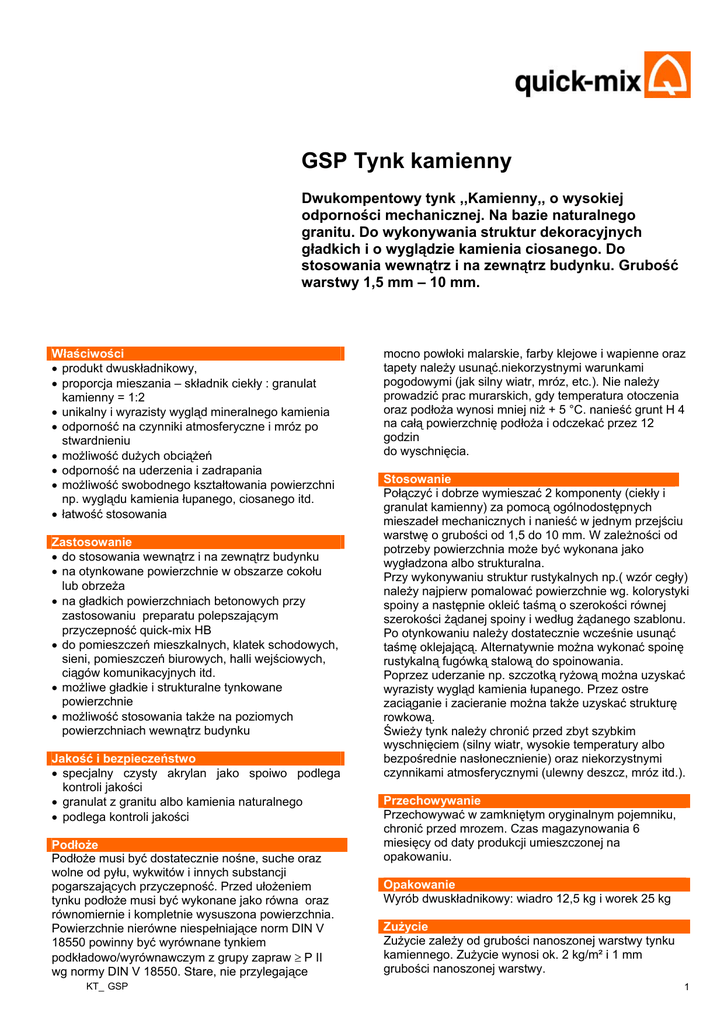 GSP Tynk kamienny Dwukompentowy tynk ,,Kamienny,, o wysokiej odporności mechanicznej. Na bazie naturalnego granitu. Do wykonywania struktur dekoracyjnych gładkich i o wyglądzie kamienia ciosanego. Do stosowania wewnątrz i na zewnątrz budynku. Grubość warstwy 1,5 mm – 10 mm. Właściwości • produkt dwuskładnikowy, • proporcja mieszania – składnik ciekły : granulat kamienny = 1:2 • unikalny i wyrazisty wygląd mineralnego kamienia • odporność na czynniki atmosferyczne i mróz po stwardnieniu • możliwość dużych obciążeń • odporność na uderzenia i zadrapania • możliwość swobodnego kształtowania powierzchni np. wyglądu kamienia łupanego, ciosanego itd. • łatwość stosowania Zastosowanie • do stosowania wewnątrz i na zewnątrz budynku • na otynkowane powierzchnie w obszarze cokołu lub obrzeża • na gładkich powierzchniach betonowych przy zastosowaniu preparatu polepszającym przyczepność quick-mix HB • do pomieszczeń mieszkalnych, klatek schodowych, sieni, pomieszczeń biurowych, halli wejściowych, ciągów komunikacyjnych itd. • możliwe gładkie i strukturalne tynkowane powierzchnie • możliwość stosowania także na poziomych powierzchniach wewnątrz budynku Jakość i bezpieczeństwo • specjalny czysty akrylan jako spoiwo podlega kontroli jakości • granulat z granitu albo kamienia naturalnego • podlega kontroli jakości Podłoże Podłoże musi być dostatecznie nośne, suche oraz wolne od pyłu, wykwitów i innych substancji pogarszających przyczepność. Przed ułożeniem tynku podłoże musi być wykonane jako równa oraz równomiernie i kompletnie wysuszona powierzchnia. Powierzchnie nierówne niespełniające norm DIN V 18550 powinny być wyrównane tynkiem podkładowo/wyrównawczym z grupy zapraw ≥ P II wg normy DIN V 18550. Stare, nie przylegające KT_ GSP mocno powłoki malarskie, farby klejowe i wapienne oraz tapety należy usunąć.niekorzystnymi warunkami pogodowymi (jak silny wiatr, mróz, etc.). Nie należy prowadzić prac murarskich, gdy temperatura otoczenia oraz podłoża wynosi mniej niż + 5 °C. nanieść grunt H 4 na całą powierzchnię podłoża i odczekać przez 12 godzin do wyschnięcia. Stosowanie Połączyć i dobrze wymieszać 2 komponenty (ciekły i granulat kamienny) za pomocą ogólnodostępnych mieszadeł mechanicznych i nanieść w jednym przejściu warstwę o grubości od 1,5 do 10 mm. W zależności od potrzeby powierzchnia może być wykonana jako wygładzona albo strukturalna. Przy wykonywaniu struktur rustykalnych np.( wzór cegły) należy najpierw pomalować powierzchnie wg. kolorystyki spoiny a następnie okleić taśmą o szerokości równej szerokości żądanej spoiny i według żądanego szablonu. Po otynkowaniu należy dostatecznie wcześnie usunąć taśmę oklejającą. Alternatywnie można wykonać spoinę rustykalną fugówką stalową do spoinowania. Poprzez uderzanie np. szczotką ryżową można uzyskać wyrazisty wygląd kamienia łupanego. Przez ostre zaciąganie i zacieranie można także uzyskać strukturę rowkową. Świeży tynk należy chronić przed zbyt szybkim wyschnięciem (silny wiatr, wysokie temperatury albo bezpośrednie nasłonecznienie) oraz niekorzystnymi czynnikami atmosferycznymi (ulewny deszcz, mróz itd.). Przechowywanie Przechowywać w zamkniętym oryginalnym pojemniku, chronić przed mrozem. Czas magazynowania 6 miesięcy od daty produkcji umieszczonej na opakowaniu. Opakowanie Wyrób dwuskładnikowy: wiadro 12,5 kg i worek 25 kg Zużycie Zużycie zależy od grubości nanoszonej warstwy tynku kamiennego. Zużycie wynosi ok. 2 kg/m² i 1 mm grubości nanoszonej warstwy. 1 Temperatura stosowania Podczas stosowania i całego czasu schnięcia temperatura powietrza, materiału i podłoża nie może spaść poniżej +5°C a oprócz tego musi być wyższa o 3 K od temperatury punktu rosy. Czas schnięcia W temperaturze powietrza 20 °C i wilgotności względnej powietrza 65 % w zależności od grubości warstwy, na 1 mm grubości nanoszonej warstwy ok. 1/2 doby. Duża wilgotność względna powietrza lub niższa temperatura spowalnia schnięcie. Utylizacja Numer klucza oznaczenia odpadów: 08 01 03 (odpady farb i lakierów na bazie wodnej) dla tynku kamiennego GSP. Do recyklingu oddawać tylko całkowicie opróżnione pojemniki. Resztki materiału można utylizować wg numeru klucza oznaczenia odpadów: 08 01 05 (stwardniałe farby i lakiery) albo zgodnie z lokalnymi przepisami administracyjnymi. (W razie potrzeby zasięgnąć informacji u lokalnego przedsiębiorstwa utylizacyjnego.) Uwagi Używać tylko nierdzewnych narzędzi. Środki pracy umyć wodą natychmiast po użyciu. Dokładnie przykryć posadzkę. Przed rozpoczęciem tworzenia się błony zdjąć taśmy oklejające. Ze względu na zastosowanie naturalnego dodatku ziarnistego niewielkie odchyłki barwy są zjawiskiem naturalnym. Dlatego zaleca się w miarę możliwości stosowanie materiału z tej samej partii produkcyjnej na jednej widocznej powierzchni. W przypadku powierzchni nadmiernie narażonych na działanie wilgoci jak np. czoła murów należy zastosować odpowiednie przykrycie. Nie wolno dodawać żadnych dodatków. Pojemniki z tworzywa sztucznego można po umyciu bez problemów dalej stosować albo przekazać do utylizacji. Dane dla celów transportu: produkt nie jest materiałem niebezpiecznym Klasa zagrożenia wód: 1 (klasyfikacja własna) Dane techniczne spoiwo - składnik ciekły: specjalny czysty akrylan odcienie barwy: piaskowiec, granit, kwarcyt, diabas, porfir, bazalt Temperatura > + 5° C stosowania: czas obróbki: ok. 30 minut (w zależności od grubości nanoszonej warstwy) grubość nanoszonej 1,5 do 10 mm warstwy: zużycie: ok. 2 kg/m² na 1 mm grubości nanoszonej warstwy przechowywanie: w chłodnym miejscu w zamkniętym oryginalnym pojemniku, chronić przed mrozem, 6 miesięcy od daty produkcji postać dostawy: wiadro 12,5 kg, worek 25 kg Stan: kwiecień 20