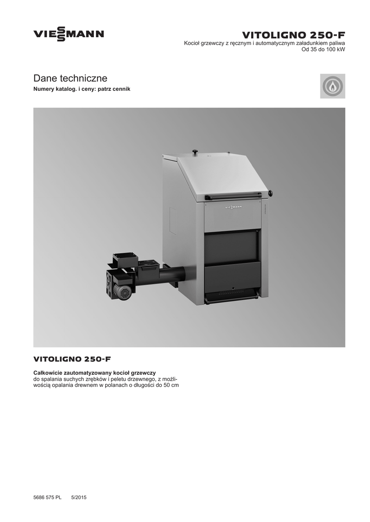 Viesmann Dane techniczne Numery katalog. i ceny: patrz cennik VITOLIGNO 250-F Całkowicie zautomatyzowany kocioł grzewczy do spalania suchych zrębków i peletu drzewnego, z możliwością opalania drewnem w polanach o długości do 50 cm 5686 575 PL 5/2015 VITOLIGNO 250-F Kocioł grzewczy z ręcznym i automatycznym załadunkiem paliwa Od 35 do 100 kW Opis wyrobu A Górne drzwiczki do napełniania z dużą komorą wsadową, stożkowe rozszerzenie w dół B Automatyczna dmuchawa zapłonowa C Pionowy rurowy wymiennik ciepła zapewniający najlepsze przekazywanie ciepła D Fabrycznie zamontowany układ podwyższania temperatury wody na powrocie, z pompą obiegu kotła, zawór do podnoszenia temperatury wody na powrocie, czujnik temperatury na zasilaniu i powrocie E Wentylator spalin z regulacją obrotów, z sondą lambda i czujnikiem temperatury spalin F Opatentowana komora spalania wykonana z betonu żaroodpornego, zapewnia optymalne odgazowanie paliwa G Automatyczne odpopielanie komory spalania H Podajnik ślimakowy K Ruszt odgazowujący z doprowadzeniem powietrza pierwotnego L Drzwiczki komory spalania z przepustnicą powietrza pierwotnego Kocioł Vitoligno 250-F jest dostosowany do ręcznego załadunku drewna w polanach oraz automatycznego załadunku peletu drzewnego, zrębków, brykietu drzewnego oraz odpadów drewnianych. Opatentowana, podwójna komora spalania zapewnia optymalną pracę kotła. Vitoligno 250-F posiada przed główną komorą spalania duży szyb zasypowy z pokrywą wsadową i oddzielnym rusztem, co w trybie ręcznym (opalanie drewnem w polanach) umożliwia łatwy załadunek polan. W trybie automatycznym kocioł grzewczy jest dostosowany do spalania wszystkich paliw, zarówno suchych, jak i wilgotnych (wióry, zrębki drewnianych odpadów/zrębki drewniane M35, P31S). W instalacji kotła znajduje się wbudowany regulator z okablowanymi wtykami czujników i silników. Umożliwia to szybkie i łatwe zainstalowanie urządzenia. Jeśli kocioł grzewczy posiada opcję automatycznego załadunku paliwa, zapłon następuje automatycznie dzięki dmuchawie zapłonowej. W połączeniu z podgrzewaczem buforowym wody grzewczej pozwala to na idealną regulację przy niskim obciążeniu (eksploatacja z wodą użytkową latem). Pionowe powierzchnie wymiennika ciepła są stale czyszczone przez spiralne, poruszane silnikowo sprężyny. Wysoki stopień sprawności Vitoligno 250-F wynika z długiego odcinka wypalania, optymalnego przewodzenia ciepła przez samoczyszczące ciągi w kotle oraz wykorzystanie zrzutu ciepła popiołu. Podczas pracy popiół jest automatycznie odprowadzany z głównej komory spalania do przedniej komory, gdzie może się całkowicie wyżarzyć. ■ Kocioł opalany drewnem na polana półmetrowe, charakteryzujący się maksymalnym komfortem obsługi dzięki napełnianiu od góry ■ Fabrycznie zamontowany układ podwyższania temperatury wody na powrocie (grupa kotłów) ■ Z okablowanymi wtykami ■ Stopień sprawności kotła: do 92% ■ Wentylator spalin o dużych wymiarach: cicha praca, długa żywotność ■ Stale regulujące przepustnice powietrza z optymalizacją rozpalania i wypalania 2 Viesmann ■ Precyzyjne rozwarstwienie termiczne w podgrzewaczu buforowym dzięki zastosowaniu zaworu regulacyjnego – brak możliwości zakłócania układu warstw wody w podgrzewaczu poprzez powrót (opcja) ■ Automatyczny zapłon za pomocą dmuchawy gorącego powietrza ■ Automatyczne czyszczenia wymiennika ciepła za pomocą sprężyn spiralnych ■ Niewymagane urządzenie dopływu dodatkowego powietrza ■ Regulator za pomocą sondy lambda zapewniający optymalne spalanie VITOLIGNO 250-F 5686 575 PL Podsumowanie zalet Opis wyrobu (ciąg dalszy) ■ Automatyczny załadunek peletu drzewnego lub zrębków drzewnych (M35, P31S) ■ Automatyczny układ odpopielania do zbiornika na popiół o pojemności 20 l (opcja) Zakres dostawy ■ Automatyczne urządzenie zapłonowe ■ Układ podwyższania temperatury wody na powrocie, kompletnie zamontowany na kołnierzu przyłączeniowym Układ podwyższania temperatury wody na powrocie składający się z następujących elementów: – pompa obiegu kotła (między 2 zaworami odcinającymi) – zawór podwyższania temperatury wody z nastawnikiem – czujnik temperatury wody na zasilaniu i powrocie, z elementami przyłączeniowymi ■ 3 czujniki temperatury wody w zasobniku buforowym z 3 tulejami zanurzeniowymi (R 1/2, dł. 280 mm), wspólnie okablowane z wtykiem ■ 4-biegunowy przełącznik główny (do zamontowania w pobliżu modułu obsługowego) 5686 575 PL ■ Kocioł grzewczy z następującymi elementami: – podwójna komora spalania – ładownik popiołu – urządzenie do odżużlowywania i czyszczenia – spiralne sprężyny czyszczące wymiennik ciepła – mechaniczny napęd z czujnikiem pozycji do odpopielania głównej komory spalania ■ Wentylator spalin z okablowanymi wtykami ■ Wbudowany układ sterowania instalacją Ecotronic (zdecentralizowany system mikroprocesorowy poprzez magistralę CAN) składający się z następujących elementów: – moduł kotła (płytka instalacyjna wbudowana w kotle) – moduł obsługowy do montażu, optymalnie na ścianie – przewód magistrali prowadzący do silników napędowych, z okablowaniem z wtykiem wyjściowym ■ Podajnik: – podajnik ślimakowy z barierą blokującą – napęd do łagodnego rozruchu przez magistralę CAN (z przewodem danych) – automatyczne odwracanie kierunku ruchu i zabezpieczenie przed przeciążeniem – fotokomórki do komory spalania i pojemnika dozującego VITOLIGNO 250-F Viesmann 3 Dane techniczne Vitoligno 250-F Wymiary Długość Szerokość Wysokość Dane dot. mocy przy eksploatacji z drewnem w kawałkach Znamionowa moc cieplna (QN) Maks. długość polan Pojemność komory wsadowej Stopień sprawności kotła Średnia temperatura spalin Głębokość komory wsadowej Wysokość napełniania Wysokość przy otwartej pokrywie wsa