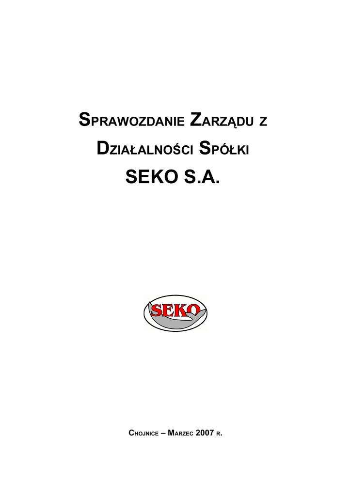 SPRAWOZDANIE ZARZĄDU Z DZIAŁALNOŚCI SPÓŁKI SEKO S.A. CHOJNICE – MARZEC 2007 R. Spis treści 1. ISTOTNE ZDARZENIE WPŁYWAJĄCE NA DZIAŁALNOŚĆ SPÓŁKI W 2006 ROKU ORAZ DO DNIA ZATWIERDZENIA SPRAWOZDANIA.................................................................................................. 4 2. OMÓWIENIE AKTUALNEJ I PRZEWIDYWANEJ SYTUACJI FINANSOWEJ ORAZ OMÓWIENIE PERSPEKTYW ROZWOJU DZIAŁALNOŚCI SPÓŁKI....................................................... 5 3. CHARAKTERYSTYKA CZYNNIKÓW RYZYKA I ZAGROŻEŃ ISTOTNYCH DLA ROZWOJU PRZEDSIĘBIORSTWA......................................................................................................................................... 6 4. DZIAŁALNOŚĆ BADAWCZO – ROZWOJOWA......................................................................................... 7 5. INFORMACJA O NABYCIU UDZIAŁÓW (AKCJI) WŁASNYCH........................................................... 7 6. INFORMACJA O POSIADANYCH ODDZIAŁACH.................................................................................... 7 7. INSTRUMENTY FINANSOWE....................................................................................................................... 7 8. ZATRUDNIENIE................................................................................................................................................ 7 9. INFORMACJE O PODSTAWOWYCH PRODUKTACH, TOWARACH.................................................. 8 10. INFORMACJE O RYNKACH ZBYTU PRODUKTÓW I TOWARÓW SPÓŁKI................................... 9 11. INFORMACJE O ZAWARTYCH ZNACZĄCYCH UMOWACH I UMOWACH ZAWARTYCH POMIĘDZY AKCJONARIUSZAMI.................................................................................................................. 10 12. POWIĄZANIA ORGANIZACYJNE I KAPITAŁOWE SEKO S.A......................................................... 11 13. TRANSAKCJE Z PODMIOTAMI POWIĄZANYMI................................................................................ 11 14. ZACIĄGNIĘTE KREDYTY, UMOWY POŻYCZKI, UDZIELONE I OTRZYMANE PORĘCZENIA I GWARANCJE.................................................................................................................................................... 12 15. INFORMACJA O UDZIELONYCH POŻYCZKACH I PORĘCZENIACH Z UWZGLĘDNIENIEM TERMINU ICH WYMAGALNOŚCI................................................................................................................. 13 16. EMISJA PAPIERÓW WARTOŚCIOWYCH W OKRESIE OBJĘTYM RAPORTEM........................ 13 17. RÓŻNICE POMIĘDZY WYNIKAMI FINANSOWYMI WYKAZANYMI W RAPORCIE ROCZNYM A WCZEŚNIEJ PUBLIKOWANYMI PROGNOZAMI............................................................ 13 18. OCENA ZARZĄDZANIA ZASOBAMI FINANSOWYMI........................................................................ 13 19. OCENA MOŻLIWOŚCI REALIZACJI ZAMIERZEŃ INWESTYCYJNYCH..................................... 16 20. CZYNNIKI I NIETYPOWE ZDARZENIA MAJĄCE WPŁYW NA OSIĄGNIĘTY WYNIK............. 17 21. CHARAKTERYSTYKA ZEWNĘTRZNYCH I WEWNĘTRZNYCH CZYNNIKÓW ISTOTNYCH DLA ROZWOJU PRZEDSIĘBIORSTWA EMITENTA ORAZ OPIS PERSPEKTYW ROZWOJU DZIAŁALNOŚCI.................................................................................................................................................. 17 22. ZMIANY PODSTAWOWYCH ZASAD ZARZĄDZANIA PRZEDSIĘBIORSTWEM......................... 17 23. ZMIANY W SKŁADZIE OSÓB ZARZĄDZAJĄCYCH I NADZORUJĄCYCH................................... 17 24. UMOWY ZAWARTE POMIĘDZY EMITENTEM A OSOBAMI ZARZĄDZAJĄCYMI....................18 25. WYNAGRODZENIA, NAGRODY LUB KORZYŚCI OSÓB ZARZĄDZAJĄCYCH I NADZORUJĄCYCH............................................................................................................................................ 18 26. LICZBA I WARTOŚĆ NOMINALNA AKCJI SEKO S.A. BĘDĄCYCH W POSIADANIU OSÓB ZARZĄDZAJĄCYCH I NADZORUJĄCYCH................................................................................................. 18 27. LISTA AKCJONARIUSZY POSIADAJĄCYCH POWYŻEJ 5% GŁOSÓW NA NWZA.................... 19 28. UMOWY, W WYNIKU KTÓRYCH MOGĄ W PRZYSZŁOŚCI NASTĄPIĆ ZMIANY W PROPORCJACH AKCJI POSIADANYCH PRZEZ GŁÓWNYCH AKCJONARIUSZY.......................... 20 29. POSIADACZE PAPIERÓW WARTOŚCIOWYCH DAJĄCYCH SPECJALNE UPRAWNIENIA KONTROLNE W STOSUNKU DO EMITENTA............................................................................................. 20 30. SYSTEM KONTROLI PROGRAMÓW AKCJI PRACOWNICZYCH................................................... 20 31. OGRANICZENIA DOTYCZĄCE PAPIERÓW WARTOŚCIOWYCH.................................................. 20 32. INFORMACJE DOTYCZĄCE PODMIOTU UPRAWNIONEGO DO BADANIA SPRAWOZDAŃ FINANSOWYCH.................................................................................................................................................. 20 SPRAWOZDANIE ZARZĄDU Z DZIAŁALNOŚCI SPÓŁKI SEKO S.A. 3 1. Istotne zdarzenie wpływające na działalność Spółki w 2006 roku oraz do dnia zatwierdzenia sprawozdania Rok 2006 był dla Spółki rokiem bardzo ważnym. Zostały w nim podjęte przełomowe decyzje, które będą miały istotny wpływ na jej przyszłość. Pierwszym z tych wydarzeń była zmiana formy prawnej prowadzonej działalności: ze spółki z ograniczoną odpowiedzialnością w spółkę akcyjną. W dniu 20 marca 2006 r. na podstawie uchwały Nadzwyczajnego Zgromadzenia Wspólników spółki SEKO spółka z ograniczoną odpowiedzialnością nastąpiło podniesienie kapitału zakładowego Spółki o kwotę 300 tys. zł do poziomu 500 tys. zł. Podwyższenie kapitału nastąpiło poprzez utworzenie 600 nowych udziałów o wartości nominalnej 500 zł każdy. Podwyższony kapitał zakładowy został pokryty środkami z kapitału zapasowego Spółki. Udziały w podwyższonym kapitale objęli dotychczasowi wspólnicy: Złot