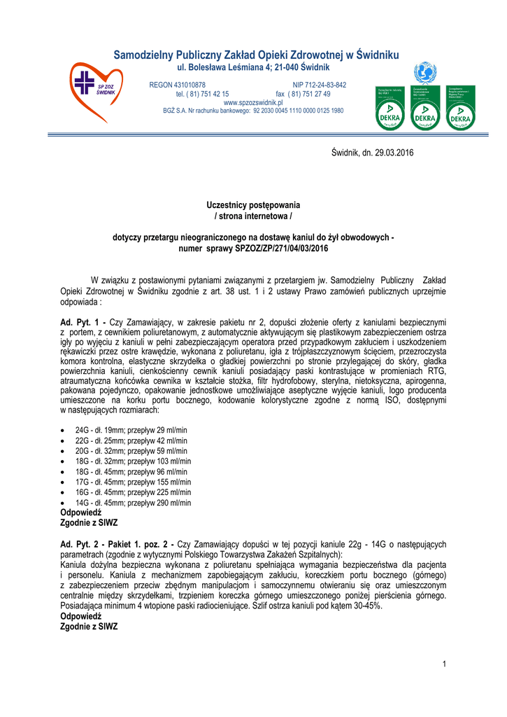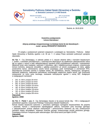 Samodzielny Publiczny Zakład Opieki Zdrowotnej w Świdniku ul. Bolesława Leśmiana 4; 21-040 Świdnik REGON 431010878 NIP 712-24-83-842 tel. ( 81) 751 42 15 fax ( 81) 751 27 49 www.spzozswidnik.pl BGŻ S.A. Nr rachunku bankowego: 92 2030 0045 1110 0000 0125 1980 Świdnik, dn. 29.03.2016 Uczestnicy postępowania / strona internetowa / dotyczy przetargu nieograniczonego na dostawę kaniul do żył obwodowych numer sprawy SPZOZ/ZP/271/04/03/2016 W związku z postawionymi pytaniami związanymi z przetargiem jw. Samodzielny Publiczny Zakład Opieki Zdrowotnej w Świdniku zgodnie z art. 38 ust. 1 i 2 ustawy Prawo zamówień publicznych uprzejmie odpowiada : Ad. Pyt. 1 - Czy Zamawiający, w zakresie pakietu nr 2, dopuści złożenie oferty z kaniulami bezpiecznymi z portem, z cewnikiem poliuretanowym, z automatycznie aktywującym się plastikowym zabezpieczeniem ostrza igły po wyjęciu z kaniuli w pełni zabezpieczającym operatora przed przypadkowym zakłuciem i uszkodzeniem rękawiczki przez ostre krawędzie, wykonana z poliuretanu, igła z trójpłaszczyznowym ścięciem, przezroczysta komora kontrolna, elastyczne skrzydełka o gładkiej powierzchni po stronie przylegającej do skóry, gładka powierzchnia kaniuli, cienkościenny cewnik kaniuli posiadający paski kontrastujące w promieniach RTG, atraumatyczna końcówka cewnika w kształcie stożka, filtr hydrofobowy, sterylna, nietoksyczna, apirogenna, pakowana pojedynczo, opakowanie jednostkowe umożliwiające aseptyczne wyjęcie kaniuli, logo producenta umieszczone na korku portu bocznego, kodowanie kolorystyczne zgodne z normą ISO, dostępnymi w następujących rozmiarach: 24G - dł. 19mm; przepływ 29 ml/min 22G - dł. 25mm; przepływ 42 ml/min 20G - dł. 32mm; przepływ 59 ml/min 18G - dł. 32mm; przepływ 103 ml/min 18G - dł. 45mm; przepływ 96 ml/min 17G - dł. 45mm; przepływ 155 ml/min 16G - dł. 45mm; przepływ 225 ml/min 14G - dł. 45mm; przepływ 290 ml/min Odpowiedź Zgodnie z SIWZ Ad. Pyt. 2 - Pakiet 1. poz. 2 - Czy Zamawiający dopuści w tej pozycji kaniule 22g - 14G o następujących parametrach (zgodnie z wytycznymi Polskiego Towarzystwa Zakażeń Szpitalnych): Kaniula dożylna bezpieczna wykonana z poliuretanu spełniająca wymagania bezpieczeństwa dla pacjenta i personelu. Kaniula z mechanizmem zapobiegającym zakłuciu, koreczkiem portu bocznego (górnego) z zabezpieczeniem przeciw zbędnym manipulacjom i samoczynnemu otwieraniu się oraz umieszczonym centralnie między skrzydełkami, trzpieniem koreczka górnego umieszczonego poniżej pierścienia górnego. Posiadająca minimum 4 wtopione paski radiocieniujące. Szlif ostrza kaniuli pod kątem 30-45%. Odpowiedź Zgodnie z SIWZ 1 Ad. Pyt. 3 - Pakiet 1. poz. 1 - Czy Zamawiający dopuści kaniulę wykonaną z biokompatybilnego poliuretanu, bez skrzydełek, ze zdejmowanym uchwytem? Pozostałe parametry zgodne z SIWZ. Odpowiedź Zgodnie z SIWZ Ad. Pyt. 4 - Pakiet 1. poz. 1 - Czy Zamawiający dopuści kaniulę wykonaną z biokompatybilnego poliuretanu, o przepływie 10 ml/min? Pozostałe parametry zgodne z SIWZ. Odpowiedź Zgodnie z SIWZ Ad. Pyt. 5 - Pakiet 1. poz. 1 - Czy Zamawiający dopuści kaniulę wykonaną z FEP, o przepływie 10 ml/min? Pozostałe parametry zgodne z SIWZ. Odpowiedź Zgodnie z SIWZ Ad. Pyt. 6 - Pakiet 1. poz. 2 - Czy Zamawiający dopuści kaniule ze standardowym zamykaniem portu bocznego, z 4 paskami radiocieniującymi, w sterylnym opakowaniu blister-pack? Pozostałe parametry zgodne z SIWZ. Odpowiedź Zgodnie z SIWZ Ad. Pyt. 7 - Pakiet 2. poz. 1 - Czy Zamawiający dopuści kaniule ze standardowym zamykaniem portu bocznego, z zastawką antyzwrotną, pełniącą funkcję filtra hydrofobowego, z plastikowym zatrzaskiem automatycznie zabezpieczającym ostry koniec igły, trzpień koreczka umieszczony powyżej jego krawędzi? Pozostałe parametry zgodne z SIWZ. Odpowiedź Zgodnie z SIWZ Z poważaniem inż. Stanisław Podniesiński Główny Specjalista ds. Administracyjno – Techniczno – Eksploatacyjnych 2