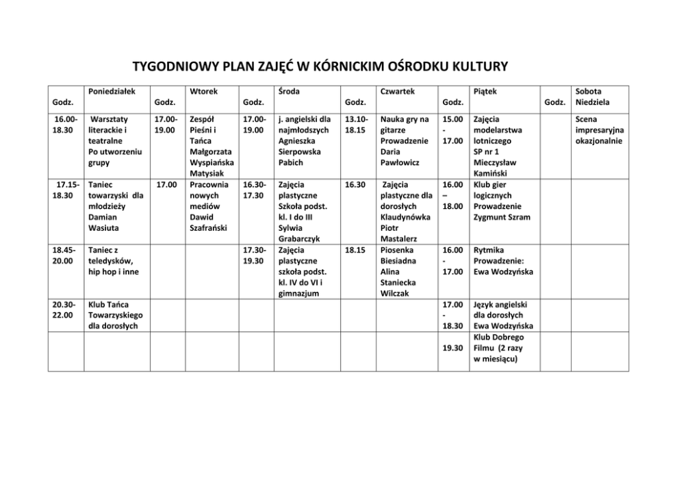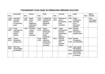 TYGODNIOWY PLAN ZAJĘĆ W KÓRNICKIM OŚRODKU KULTURY Poniedziałek Godz. 16.0018.30 Wtorek Godz. Warsztaty literackie i teatralne Po utworzeniu grupy 17.0019.00 17.15- Taniec 18.30 towarzyski dla młodzieży Damian Wasiuta 17.00 18.4520.00 Taniec z teledysków, hip hop i inne 20.3022.00 Klub Tańca Towarzyskiego dla dorosłych Środa Godz. Zespół Pieśni i Tańca Małgorzata Wyspiańska Matysiak Pracownia nowych mediów Dawid Szafrański Czwartek Godz. Piątek Godz. 17.0019.00 j. angielski dla najmłodszych Agnieszka Sierpowska Pabich 13.1018.15 Nauka gry na gitarze Prowadzenie Daria Pawłowicz 15.00 17.00 16.3017.30 Zajęcia plastyczne Szkoła podst. kl. I do III Sylwia Grabarczyk Zajęcia plastyczne szkoła podst. kl. IV do VI i gimnazjum 16.30 Zajęcia plastyczne dla dorosłych Klaudynówka Piotr Mastalerz Piosenka Biesiadna Alina Staniecka Wilczak 16.00 – 18.00 17.3019.30 18.15 Godz. Zajęcia modelarstwa lotniczego SP nr 1 Mieczysław Kamiński Klub gier logicznych Prowadzenie Zygmunt Szram 16.00 17.00 Rytmika Prowadzenie: Ewa Wodzyńska 17.00 18.30 Język angielski dla dorosłych Ewa Wodzyńska Klub Dobrego Filmu (2 razy w miesiącu) 19.30 Sobota Niedziela Scena impresaryjna okazjonalnie