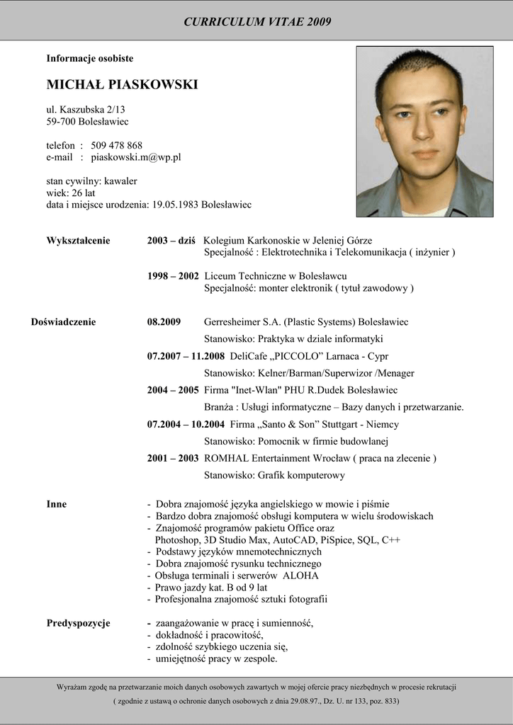 CURRICULUM VITAE 2009 Informacje osobiste MICHAŁ PIASKOWSKI ul. Kaszubska 2/13 59-700 Bolesławiec telefon : 509 478 868 e-mail : [email protected] stan cywilny: kawaler wiek: 26 lat data i miejsce urodzenia: 19.05.1983 Bolesławiec Wykształcenie 2003 – dziś Kolegium Karkonoskie w Jeleniej Górze Specjalność : Elektrotechnika i Telekomunikacja ( inŜynier ) 1998 – 2002 Liceum Techniczne w Bolesławcu Specjalność: monter elektronik ( tytuł zawodowy ) Doświadczenie 08.2009 Gerresheimer S.A. (Plastic Systems) Bolesławiec Stanowisko: Praktyka w dziale informatyki 07.2007 – 11.2008 DeliCafe „PICCOLO” Larnaca - Cypr Stanowisko: Kelner/Barman/Superwizor /Menager 2004 – 2005 Firma "Inet-Wlan" PHU R.Dudek Bolesławiec BranŜa : Usługi informatyczne – Bazy danych i przetwarzanie. 07.2004 – 10.2004 Firma „Santo & Son” Stuttgart - Niemcy Stanowisko: Pomocnik w firmie budowlanej 2001 – 2003 ROMHAL Entertainment Wrocław ( praca na zlecenie ) Stanowisko: Grafik komputerowy Inne - Dobra znajomość języka angielskiego w mowie i piśmie - Bardzo dobra znajomość obsługi komputera w wielu środowiskach - Znajomość programów pakietu Office oraz Photoshop, 3D Studio Max, AutoCAD, PiSpice, SQL, C++ - Podstawy języków mnemotechnicznych - Dobra znajomość rysunku technicznego - Obsługa terminali i serwerów ALOHA - Prawo jazdy kat. B od 9 lat - Profesjonalna znajomość sztuki fotografii Predyspozycje - zaangaŜowanie w pracę i sumienność, dokładność i pracowitość, zdolność szybkiego uczenia się, umiejętność pracy w zespole. WyraŜam zgodę na przetwarzanie moich danych osobowych zawartych w mojej ofercie pracy niezbędnych w procesie rekrutacji ( zgodnie z ustawą o ochronie danych osobowych z dnia 29.08.97., Dz. U. nr 133, poz. 833)
