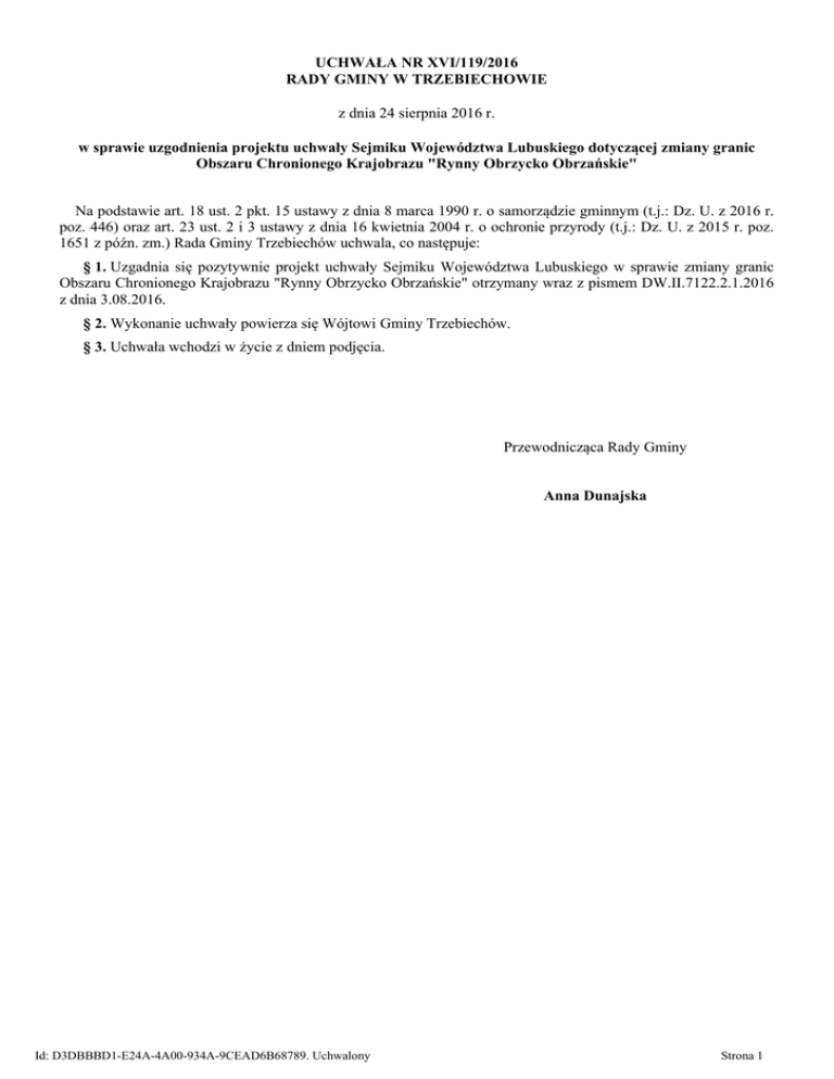 UCHWAŁA NR XVI/119/2016 RADY GMINY W TRZEBIECHOWIE z dnia 24 sierpnia 2016 r. w sprawie uzgodnienia projektu uchwały Sejmiku Województwa Lubuskiego dotyczącej zmiany granic Obszaru Chronionego Krajobrazu "Rynny Obrzycko Obrzańskie" Na podstawie art. 18 ust. 2 pkt. 15 ustawy z dnia 8 marca 1990 r. o samorządzie gminnym (t.j.: Dz. U. z 2016 r. poz. 446) oraz art. 23 ust. 2 i 3 ustawy z dnia 16 kwietnia 2004 r. o ochronie przyrody (t.j.: Dz. U. z 2015 r. poz. 1651 z późn. zm.) Rada Gminy Trzebiechów uchwala, co następuje: § 1. Uzgadnia się pozytywnie projekt uchwały Sejmiku Województwa Lubuskiego w sprawie zmiany granic Obszaru Chronionego Krajobrazu "Rynny Obrzycko Obrzańskie" otrzymany wraz z pismem DW.II.7122.2.1.2016 z dnia 3.08.2016. § 2. Wykonanie uchwały powierza się Wójtowi Gminy Trzebiechów. § 3. Uchwała wchodzi w życie z dniem podjęcia. Przewodnicząca Rady Gminy Anna Dunajska Id: D3DBBBD1-E24A-4A00-934A-9CEAD6B68789. Uchwalony Strona 1 Uzasadnienie Urząd Marszałkowski Województwa Lubuskiego pismem DW.II.7122.2.1.2016 z dnia 3.08.2016 r. przekazał do uzgodnienia projekt uchwały Sejmiku Województwa Lubuskiego dotyczącej zmiany granic Obszaru Chronionego Krajobrazu "Rynny Obrzycko Obrzańskie". Konieczność przedłożenia załączonej wersji w/w rozporządzenia podyktowana została uwzględnieniem opinii i poglądów właściwych miejscowo rad gmin i organów administracji samorządowych. Proponowana uchwała zastąpi obowiązujące aktualnie rozporządzenie nr 3 Wojewody Lubuskiego z dnia 17 lutego 2005 r. w sprawie obszarów chronionego krajobrazu (Dz. Urz. Woj. Lub. Nr 9, poz. 172), zmienionym rozporządzeniem nr 24/08 Wojewody Lubuskiego z dnia 9 września 2008 r. (Dz. Urz. Woj. Lub. Nr 91, poz. 1373), rozporządzeniem nr 1/09 WojewodyLubuskiego z dnia 13 stycznia 2009 r. (Dz. Urz. Woj. Lub. Nr 4, poz. 99). Zgodnie art. 23 ust. 3 ustawy z dnia 16 kwietnia 2004 r. o ochronie przyrody projekt uchwały zmniejszającej obszar chroniony wymaga uzgodnienia z właściwą miejscowo rada gminy, zmniejszenie uwarunkowane jest bezpowrotną utratą wyróżniającego się krajobrazu o zróżnicowanych ekosystemach i możliwości zaspokajania potrzeb związanych z turystyką i wypoczynkiem. Sejmik Województwa Lubuskiego po dokonaniu analizy przebiegu granicy obszaru chronionego krajobrazu stwierdził że konieczna jest zmiana przebiegu granicy, a tym samym zmiana powierzchni obszaru tj. zmniejszenie o 4 459,64 ha (także na obszarze gm. Trzebiechów). Na wyłączanych terenach nie stwierdzono wyróżniającego się krajobrazu o zróżnicowanych ekosystemach, wartościowych ze względu na możliwość zaspokojenia potrzeb związanych z turystyką i wypoczynkiem. Jest to obszar zurbanizowany - tereny przede wszystkim o funkcji gospodarczej, usługowej oraz mieszkaniowej, nie mający charakteru rekreacyjnego oraz turystycznego. Przez przedmiotowy teren nie przebiega żaden z wymienionych wyżej korytarzy ekologiczny. Propozycje przedstawione w niniejszym projekcie uchwały są w pełni uzasadnione i prowadzić będą do zwiększenia swobody w zakresie zagospodarowania i użytkowania terenu. Wprowadzone zmiany nie wpłyną na funkcje, jakie pełni obszar chronionego krajobrazu Rynny Obrzycko-Obrzańskie tj. zaspokajania potrzeb związanych z turystyką, wypoczynkiem oraz korytarzem ekologicznym. W świetle powyższego zasadnym jest uzgodnienie projektu uchwały w sprawie Obszaru Chronionego Krajobrazu "Rynny Obrzycko Obrzańskie" w zakresie dotyczącym zmiany granic. Id: D3DBBBD1-E24A-4A00-934A-9CEAD6B68789. Uchwalony Strona 1