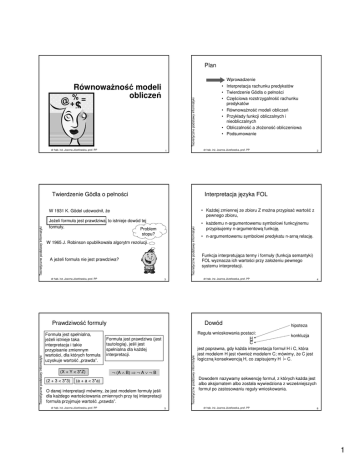 Plan modeli oblicze dr hab. in . Joanna Józefowska, prof. PP Teoretyczne podstawy informatyki Równowa no dr hab. in . Joanna Józefowska, prof. PP Teoretyczne podstawy informatyki Teoretyczne podstawy informatyki A je eli formuła nie jest prawdziwa? formuły ¬ (A ∧ B) ¬A∨¬B (a + a < 3*a) O danej interpretacji mówimy, e jest modelem formuły je li dla ka dego warto ciowania zmiennych przy tej interpretacji formuła przyjmuje warto „prawda”. dr hab. in . Joanna Józefowska, prof. PP • ka demu n-argumentowemu symbolowi funkcyjnemu przypisujemy n-argumentow funkcj , • n-argumentowemu symbolowi predykatu n-arn relacj . Funkcja interpretuj ca termy i formuły (funkcja semantyki) FOL wyznacza ich warto ci przy zało eniu pewnego systemu interpretacji. Dowód Formuła jest prawdziwa (jest tautologi ), je li jest spełnialna dla ka dej interpretacji. 5 z dr hab. in . Joanna Józefowska, prof. PP 3 Teoretyczne podstawy informatyki Teoretyczne podstawy informatyki stopu? W 1965 J. Robinson opublikowała algorytm rezolucji. (2 + 3 < 3*3) 2 • Ka dej zmiennej ze zbioru Z mo na przypisa warto pewnego zbioru, Je eli formuła jest prawdziwa, to istnieje dowód tej formuły. Problem (X + Y < 3*Z) • • Interpretacja j zyka FOL W 1931 K. Gödel udowodnił, e Formuła jest spełnialna, je eli istnieje taka interpretacja i takie przypisanie zmiennym warto ci, dla których formuła uzyskuje warto „prawda”. • • Wprowadzenie Interpretacja rachunku predykatów Twierdzenie Gödla o pełno ci Cz ciowa rozstrzygalno rachunku predykatów Równowa no modeli oblicze Przykłady funkcji obliczalnych i nieobliczalnych Obliczalno a zło ono obliczeniowa Podsumowanie dr hab. in . Joanna Józefowska, prof. PP 1 Twierdzenie Gödla o pełno ci Prawdziwo • • • • 4 hipoteza Reguła wnioskowania postaci: konkluzja H C jest poprawna, gdy ka da interpretacja formuł H i C, która jest modelem H jest równie modelem C; mówimy, e C jest logiczn konsekwencj H, co zapisujemy H = C. Dowodem nazywamy sekwencj formuł, z których ka da jest albo aksjomatem albo została wywiedziona z wcze niejszych formuł po zastosowaniu reguły wnioskowania. dr hab. in . Joanna Józefowska, prof. PP 6 1 Twierdzenie o pełno ci Plan Jest ona oczywi cie prawdziwa! • • • • Teoretyczne podstawy informatyki • Z twierdzenia o pełno ci dla FOL (K. Gödel) wynika, e formuła jest dowiedlna wtedy i tylko wtedy, gdy jest prawdziwa. dr hab. in . Joanna Józefowska, prof. PP ciowa rozstrzygalno FOL Czyli istniej formuły, których nie mo na ani udowodni , ani obali . Teoretyczne podstawy informatyki Poj cie obliczalno ci Maszyna Turinga, rachunek predykatów, rachunek λ, ... dr hab. in . Joanna Józefowska, prof. PP • • • • • • • • Wprowadzenie Interpretacja rachunku predykatów Twierdzenie Gödla o pełno ci Cz ciowa rozstrzygalno rachunku predykatów Równowa no modeli oblicze Przykłady funkcji obliczalnych i nieobliczalnych Obliczalno a zło ono obliczeniowa Podsumowanie dr hab. in . Joanna Józefowska, prof. PP 9 10 Modele oblicze kroki, dane: we- i wyj ciowe, dobrze okre lony, sko czony, wykonywalny... Algorytm Model oblicze 8 Plan Dowodzenie twierdze w FOL ogranicza własno cz ciowej rozstrzygalno ci tej logiki, tzn. nie istnieje automatyczna procedura rozstrzygaj ca, czy dana formuła jest twierdzeniem, czy te nie, mimo e istnieje procedura znajduj ca dowód, je li formuła jest prawdziwa. dr hab. in . Joanna Józefowska, prof. PP • • Wprowadzenie Interpretacja rachunku predykatów Twierdzenie Gödla o pełno ci Cz ciowa rozstrzygalno rachunku predykatów Równowa no modeli oblicze Przykłady funkcji obliczalnych i nieobliczalnych Obliczalno a zło ono obliczeniowa Podsumowanie dr hab. in . Joanna Józefowska, prof. PP 7 Teoretyczne podstawy informatyki Teoretyczne podstawy informatyki Cz • • Teoretyczne podstawy informatyki Teoretyczne podstawy informatyki • Je li formuła α jest dowiedlna (posiada dowód), to nazywamy j twierdzeniem (co zapisujemy – α). J zyk programowania 11 • • • • • • Rachunek lambda (λ) Churcha Maszyna Turinga Maszyna RAM Rachunek predykatów pierwszego rz du Funkcje rekurencyjne ... dr hab. in . Joanna Józefowska, prof. PP 12 2 Rachunek λ Autor: Alonzo Church Maszyna Turinga Rok: 1936 http://pobox.com/~oleg/ftp/Scheme/index.html#lambda-calc Definicja obliczalno ci: Funkcja jest obliczalna, je eli odpowiadaj ce jej wyra enie λ jest redukowalne. dr hab. in . Joanna Józefowska, prof. PP Teoretyczne podstawy informatyki Teoretyczne podstawy informatyki Odejmowanie w rachunku λ: Maszyna RAM Działanie: ci g konfiguracji wynikaj cy z zastosowania kolejnych instrukcji 0 1 zapisz 0 w prawo 0 1 0 zapisz 1w prawo zapisz 1 w prawo 0 0 1 1 zapisz 1w prawo stop 1 0 0 0 Definicja obliczalno ci: Funkcja jest obliczalna w sensie Turinga, je eli dla dowolnego zapisu pocz tkowego ta my maszyna Turinga zatrzyma si po wykonaniu sko czonej liczby kroków. dr hab. in . Joanna Józefowska, prof. PP 13 14 Instrukcje maszyny RAM Autor: M. Minsky(?) Rok: 1967 Typ Instrukcja Opis działania Model: zbiór rejestrów 1j. E addj Y dodanie litery aj na prawym ko cu słowa w rejestrze Y Działanie: program czyli ci g instrukcji (ze sko czonego zbioru) 2. E del Y usuni cie jednej litery z lewego ko ca słowa w rejestrze Y 3. E clr Y wymazanie zawarto ci rejestru Y (wpisanie ε) 4. EY←Z skopiowanie słowa z rejestru Z do Y 5. E jmp E’ skok do najblizszej instrukcji etykietowanej: Ea (w gór ) Eb (w dół) 6j. E Y jmpj E’ skok do E’, o ile słowo w rejestrze Y rozpoczyna si liter aj Definicja obliczalno ci: Funkcja jest obliczalna, je eli mo na j obliczy za pomoc maszyny RAM (maszyna RAM zatrzyma si dla dowolnego ci gu danych i wynik jest w rejestrze R1). dr hab. in . Joanna Józefowska, prof. PP Rachunek predykatów 15 7. Autor: Julia Robinson Rok: 1965 α ∨ β , ¬β ∨ γ α ∨γ Definicja obliczalno ci: Formuła jest prawdziwa, je eli istnieje dowód te