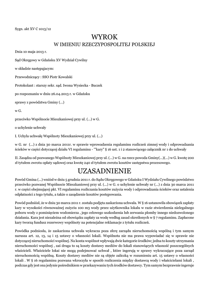 Sygn. akt XV C 1013/12 WYROK W IMIENIU RZECZYPOSPOLITEJ POLSKIEJ Dnia 10 maja 2013 r. Sąd Okręgowy w Gdańsku XV Wydział Cywilny w składzie następąjacym: Przewodniczący : SSO Piotr Kowalski Protokolant : starszy sekr. sąd. Iwona Wysiecka - Buczek po rozpoznaniu w dniu 26.04.2013 r. w Gdańsku sprawy z powództwa Gminy (...) w G. przeciwko Wspólnocie Mieszkaniowej przy ul. (...) w G. o uchylenie uchwały I. Uchyla uchwałę Wspólnoty Mieszkaniowej przy ul. (...) w G. nr (...) z dnia 30 marca 2011r. w sprawie wprowadzenia regulaminu rozliczeń zimnej wody i odprowadzania ścieków w części dotyczącej działu VI regulaminu - '"kary" § 16 ust. 1 i 2 stanowiącego załącznik nr 1 do uchwały II. Zasądza od pozwanego Wspólnoty Mieszkaniowej przy ul. (...) w G. na rzecz powoda Gminy(...)(...) w G. kwotę 200 zł tytułem zwrotu opłaty sądowej oraz kwotę 240 zł tytułem zwrotu kosztów zastępstwa procesowego. UZASADNIENIE Powód Gmina (...) wniósł w dniu 5 grudnia 2011 r. do Sądu Okręgowego w Gdańsku I Wydziału Cywilnego powództwo przeciwko pozwanej Wspólnocie Mieszkaniowej przy ul. (...) w G. o uchylenie uchwały nr (...) z dnia 30 marca 2011 r. w części obejmującej pkt. VI regulaminu rozliczania kosztów zużycia wody i odprowadzania ścieków oraz ustalenia odpłatności z tego tytułu, a także o zasądzenie kosztów postępowania. Powód podniósł, że w dniu 30 marca 2011 r. została podjęta zaskarżona uchwała. W § 16 ustanowiła obowiązek zapłaty kary w wysokości równoważnej zużyciu 100 m3 wody przez użytkownika lokalu w razie stwierdzenia nielegalnego poboru wody z pominięciem wodomierza , jego celowego uszkodzenia lub zerwania plomby innego niedozwolonego działania. Kara jest niezależna od obowiązku zapłaty za wodę według zasad określonych w § 7 regulaminu. Zapłacone kary tworzą fundusz rezerwowy wspólnoty na potencjalne reklamacje z tytułu rozliczeń. Powódka podniosła, że zaskarżona uchwała wykracza poza sferę zarządu nieruchomością wspólną i tym samym narusza art. 12, 13, 14 i 15 ustawy o własności lokali. Wspólnota nie ma prawa wypowiadać się w sprawie nie dotyczącej nieruchomości wspólnej. Na konta wspólnot wpływają dwie kategorie środków; jedna to koszty utrzymania nieruchomości wspólnej , zaś druga to są koszty dostawy mediów do lokali stanowiących własność poszczególnych właścicieli. Właściciele lokai nie mogą podejmować uchwał , które ingerują w sprawy wykraczające poza zarząd nieruchomością wspólną. Koszty dostawy mediów nie są objęte zaliczką w rozumieniu art. 15 ustawy o własności lokali . W § 16 regulaminu pozwana wkroczyła w sposób rozliczenia między dostawcą wody i właścicielami lokali , podczas gdy jest ona jedynie pośrednikiem w przekazywaniu tych środków dostawcy. Tym samym bezprawnie ingeruje w stosunki między właścicielami lokali i dostawcą mediów. Poza tym regulamin jest sprzeczny z art. 26 ust. 2 ustawy z dnia 7 czerwca 2001 r. o zbiorowym zaopatrzeniu w wodę i zbiorowym odprowadzaniu ścieków. Stanowi on, że zarządca budynku wielolokalowego jest obowiązany do rozliczania kosztów usług dostawy wody. Suma obciążeń za wodę i ścieki nie może być wyższa od ponoszonych przez właściciela lub zarządcę na rzecz przedsiębiorstwa wodno-kanalizacyjnego. Realizacja regulaminu powoduje , że w wypadku stwierdzenia nielegalnego poboru wody lub uszkodzenia wodomierza właściciel miałby zapłacić za równowartość 100 m3 wody . Wskazana kara stanowiłaby nadwyżkę , która miałaby trafić na fundusz rezerwowy. Taka sytuacja zakłada istnienie rezerwy tj. nadwyżki co sprzeczne jest z definicji z art. 26 ust. 2 cytowanej wyżej ustawy. Pozwana Wspólnota Mieszkaniowa przy ul. (...) w G. w odpowiedzi na pozew z dnia 2 kwietnia 2013 r. wniosła o oddalenie powództwa i zasądzenie kosztów postępowania. Pozwana wskazała, że podjęta uchwała i przyjęty regulamin ma zapewnić prawidłowy zarząd nieruchomością - brak długów i płynność finansową oraz rozsądnego i sprawiedliwego podziału tych kosztów na poszczególne podmioty . Chodzi w szczególności o podział kosztów zużycia wody. Pozwana wskazała, że jest ona pośrednikiem w przekazywaniu środków na dostawę wody i dlatego jest władna do uchwalenia zasad rozdziału tych kosztów między właścicieli. Poza tym pozwana nie może akceptować sytuacji, gdy tolerowany jest nielegalny pobór wody przez niektórych mieszkańców be konsekwencji takiego zachowania. , gdyż narazi to innych członków wspólnoty na niesłuszne ponoszenie kosztów związanych z takim postępowaniem. Jeżeli odbiorca wody jest wyłącznie właściciel budynku wielolokalowego, tj wspólnota mieszkaniowa to jest on zobowiązany do rozliczenia kosztów tych usług. Dokonuje on wyboru metody rozliczania kosztów różnicy wskazań pomiędzy wodomierzem głównym a sumą wodomierzy indywidualnych. Regulamin dla swojej powagi winien zawierać również sankcje za jego łamanie . Inaczej nie odnosi on swojego skutku wychowawczego . Nielegalny pobór wody jest czynnością naganną i powinien być ukarany poprze sankcję w postaci kary . Pobrane kary zaś tworzą fundusz rezerwowy na pokrycie ewentualnych niedoborów. Utworzony fundusz rezerwowy nie służy do pokrywania żadnych , innych kosztów nieruchomości wspólnej jak tylko zużycia wody. Wspólnota mieszkaniowa zapewnia pomoc mieszkańcom w zakresie prawidłowego opomiarowania i koordynuje wymianę oraz plombowanie wodomierzy w lokalach. Przy stwierdzeniu nieprawidłowości wodomierzy zapewnia wstępną ocenę przyczyn takiego stanu rzeczy wykonywaną przez służby techniczne wspólnoty. Nie przewiduje sankcji za nieprawidłowe działanie wodomierz niezależnie od woli mieszkańca. Natomiast przy umyślnym unikaniu obciążania właściciela za zużyta wodę zakłada nałożenie kary finansowej. W innym przypadku koszty nielegalnie p