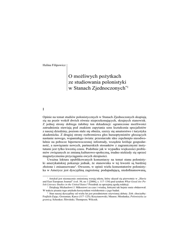 Halina Filipowicz O możliwych pożytkach ze studiowania polonistyki w Stanach Zjednoczonych*1 I Opinie na temat studiów polonistycznych w Stanach Zjednoczonych skupiają się na pozór wokół dwóch równie nieprzekonujących, skrajnych stanowisk. Z jednej strony dobiega żałobny ton dekadencji: ograniczone możliwości zatrudnienia stawiają pod znakiem zapytania sens kształcenia specjalistów z naszej dziedziny, poziom stale się obniża, szerzy się amatorstwo i turystyka akademicka. Z drugiej strony rozbrzmiewa głos huraoptymistów głoszących nastanie nowego, wspaniałego świata: przestarzałe idee zepchnięto nieodwołalnie na pobocze hipernowoczesnej infostrady, wszędzie króluje gospodarność, a nawiązanie nowych, partnerskich stosunków z zagranicznymi instytutami jest tylko kwestią czasu. Podobnie jak w wypadku większości problemów związanych ze zmianą kulturowo-społeczną, trudno niekiedy się oprzeć magnetycznemu przyciąganiu owych skrajności. Uważna lektura opublikowanych komentarzy na temat stanu polonistyki amerykańskiej pokazuje jednak, że stanowiska w tej kwestii są bardziej złożone i zniuansowane2. Owszem, w opinii wielu komentatorów polonistyka w Ameryce jest dyscypliną zagrożoną: podupadającą, niedofinansowaną, ∗ Artykuł jest nieznacznie zmienioną wersją tekstu, który ukazał się pierwotnie w „Slavic and East European Journal” (vol. 50, no 1 [2006], s. 117–134) pod tytułem What Good Are Polish Literary Studies in the United States? Przedruk za uprzejmą zgodą redakcji. 1 Dziękuję Michaelowi J. Mikosiowi za czas i wiedzę, którymi tak hojnie mnie obdarował. W trakcie pisania tego artykułu korzystałam wielokrotnie z jego badań. 2 Stan naszej dyscypliny od wielu lat jest przedmiotem ożywionej debaty. Zob. chociażby: Frajlich-Zając; Grossman; Karcz (117–125); Krzyżanowski; Maurer; Miodunka; Polonistyka za granicą; Schenker; Śliwiński; Thompson; Wilczek. 26 Halina Filipowicz nierozumianą, wymagającą wsparcia i ochrony. Nie brak jednak tych, którzy przekonują, że ten posępny obraz jest znakomitym kamuflażem, przesłaniającym podstawową, skrzętnie skrywaną prawdę: drugorzędny status polonistyki amerykańskiej, hamujący jej rozwój, wynika stąd, że jest ona dyscypliną zamkniętą, skoncentrowaną na sobie i zadufaną. Inni zgadzają się wprawdzie z tą diagnozą, ale podkreślają zarazem, że kryzys można przezwyciężyć dzięki współpracy z komparatystyką i innymi dyscyplinami humanistycznymi. Jeszcze inni potwierdzają potrzebę wykazania większej transkulturowej i interdyscyplinarnej aktywności, zachowują jednak sceptycyzm: w czasach niepokojącego obniżania publicznych nakładów na szkolnictwo wyższe trudno oczekiwać, aby polityka finansowa na amerykańskich uczelniach pozwoliła polonistyce obronić się przed niebezpieczną marginalizacją, jakiej podlega obecnie w amerykańskich strukturach akademickich. U podłoża tych sceptycznych opinii tkwi świadomość, że przez większą część nowożytnej historii Europa Środkowo-Wschodnia traktowana była nie jak partner Zachodu, ale jak jej „zacofany” lub przednowoczesny Inny. W rezultacie dominująca w cywilizacji światowej zachodnia narracja upodrzędnia historię i kulturę krajów Europy Środkowo-Wschodniej. Tak skromna dziedzina jak polonistyka nie może liczyć na wnikliwe zainteresowanie Zachodu, który starannie dozuje swoją uwagę i dba przede wszystkim o tych, którzy posiadają już pewien kapitał symboliczny. Wśród uczestników dyskusji są jednak i tacy, którzy twierdzą, że stan amerykańskiej polonistyki nie jest aż tak beznadziejny. Z ich punktu widzenia polonistyka jawi się jako skromna, ale prężna dyscyplina wiedzy, walcząca dzielnie o swoje prawo do istnienia we współczesnym życiu akademickim, mimo coraz skromniejszych środków finansowych, redukcji zatrudnienia i presji ze strony studentów polskiego pochodzenia, a także ich rodziców, którzy domagają się, aby propagowała ona wyłącznie pozytywny, czy wręcz wyidealizowany obraz polskiej kultury. Niektórzy twierdzą nawet, że polonistyka amerykańska jest dynamiczną dyscypliną wytyczającą nowe trendy w nauce, że nie tylko dostarcza pilnie potrzebnych interpretacji, alternatywnych wobec tych, których dokonują poloniści w Polsce, ale przyczynia się także do pogłębiania dialogu między bardzo różnymi tradycjami europejskich i amerykańskich studiów literaturoznawczych. Dla wielu badaczy wszystkie te argumenty i kontrargumenty nie mają jednak żadnego znaczenia, ponieważ uznają oni polonistyczny matecznik – polonistykę w Polsce – za uprzywilejowane miejsce kulturowego doświadczenia i naukowego autorytetu. Twierdzą, że polonistyka w Stanach Zjednoczonych powinna oferować naukę języka, przygotowywać studentów do podjęcia studiów w Polsce oraz pełnić funkcję ośrodka informacyjnego, dostarczającego ogólnej wiedzy na temat polskiej kultury i literatury. Nie trzeba chyba dodawać, że każde z wymienionych stanowisk pociąga za sobą pośrednią lub bezpośrednią odpowiedź na pytanie o możliwe pożytki ze studiowania polonistyki w Stanach Zjednoczonych. Za każdą z tych roz- O możliwych pożytkach ze studiowania polonistyki w Stanach Zjednoczonych 27 maicie uzasadnianych opinii stoi jednak milczące przekonanie, że naprawdę jest się o co spierać. Istnieją wszelkie podstawy, by przyjąć, że przekonanie to musi mieć związek z dziełami takich pisarzy, jak Witold Gombrowicz, Zbigniew Herbert, Czesław Miłosz, Tadeusz Różewicz, Bruno Schulz, Wisława Szymborska czy Adam Zagajewski, którzy, przynajmniej w kategoriach geopolitycznych, wywodzą się z peryferii, a dziś należą do literackiego klubu skupiającego gwiazdy pierwszej wielkości, które niemądrze byłoby ignorować. Intensywność dyskusji na temat stanu polonistyki amerykańskiej uświadamia dobitnie, że nasza dyscyplina 
