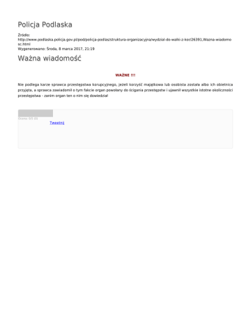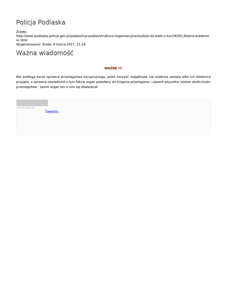 Policja Podlaska Źródło: http://www.podlaska.policja.gov.pl/pod/policja-podlas/struktura-organizacyjna/wydzial-do-walki-z-kor/26391,Wazna-wiadomo sc.html Wygenerowano: Środa, 8 marca 2017, 21:19 Ważna wiadomość WAŻNE !!! Nie podlega karze sprawca przestępstwa korupcyjnego, jeżeli korzyść majątkowa lub osobista została albo ich obietnica przyjęta, a sprawca zawiadomił o tym fakcie organ powołany do ścigania przestępstw i ujawnił wszystkie istotne okoliczności przestępstwa - zanim organ ten o nim się dowiedział Ocena: 0/5 (0) Tweetnij