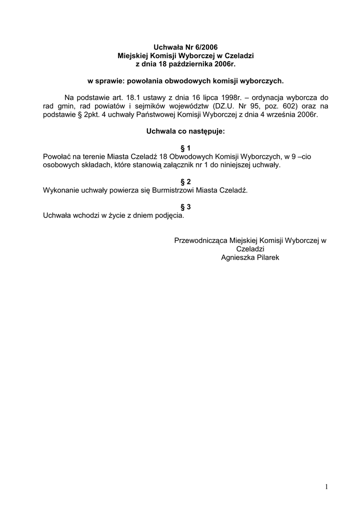 Uchwała Nr 6/2006 Miejskiej Komisji Wyborczej w Czeladzi z dnia 18 października 2006r. w sprawie: powołania obwodowych komisji wyborczych. Na podstawie art. 18.1 ustawy z dnia 16 lipca 1998r. – ordynacja wyborcza do rad gmin, rad powiatów i sejmików województw (DZ.U. Nr 95, poz. 602) oraz na podstawie § 2pkt. 4 uchwały Państwowej Komisji Wyborczej z dnia 4 września 2006r. Uchwala co następuje: §1 Powołać na terenie Miasta Czeladź 18 Obwodowych Komisji Wyborczych, w 9 –cio osobowych składach, które stanowią załącznik nr 1 do niniejszej uchwały. §2 Wykonanie uchwały powierza się Burmistrzowi Miasta Czeladź. §3 Uchwała wchodzi w Ŝycie z dniem podjęcia. Przewodnicząca Miejskiej Komisji Wyborczej w Czeladzi Agnieszka Pilarek 1 Załącznik do uchwały nr 6/2006 z dnia 18 października 2006r. Obwodowa Komisja Wyborcza Nr 1 – Miejski Zespól Szkól, ul. Szkolna 6. 1. Gabriela Guca 2. Katarzyna Misiak 3. Ewa Zawiązalec 4. Marek Gajda 5. Aneta Bryła 6. Karol Kuzak 7. Jolanta Gruszczyńska 8. Dominik Horyń 9. Anna Bijak Obwodowa Komisja Wyborcza Nr 2 – Przedszkole Nr 7, ul. Waryńskiego 19. 1. BoŜena Wróbel 2. Anna Arwaj 3. Agnieszka Kopiec 4. Monika Pomorska - Wesołowska 5. Rafał Moskwian 6. Paweł Klepacz 7. ElŜbieta Torbus 8. Agnieszka Jarusz 9. Mirosława Doroszko Obwodowa Komisja Wyborcza Nr 3 – Miejski Ośrodek Pomocy Społecznej, ul. 17 Lipca 27. 1. Dorota Domagała 2. Adam Zdunek 3. Julia Stobrawa 4. Monika Jamrocha 5. Małgorzata DroŜniak 6. Michał Piskorz 7. Izabela Cebrat 8. Aneta Kondratko 9. Beata Cichy Obwodowa Komisja Wyborcza Nr 4 – Przedszkole Nr 4, ul. Miasta Auby 14. 1. Julita Strojniak 2. Aneta Rychter 3. Iwona Korycka 4. Marcin Świst 5. Izabela Kwiatkowska 6. Bartosz Śmiechowski 7. Agnieszka Nowacka 8. Marta Cebrat 9. Iwona Cygnarowska 2 Obwodowa Komisja Wyborcza Nr 5 – Przedszkole Nr 11, ul. Kombatantów 2. 1. Katarzyna Popielska 2. Maciej Jastrząb 3. Magdalena Rokita 4. Marzena Świst 5. Ewa Maćkowska 6. Klaudyna Tryner 7. Jolanta Chabior – Gay 8. Justyna Swoboda 9. ElŜbieta Kostoń Obwodowa Komisja Wyborcza Nr 6 – Ośrodek Integracyjny „Senior”, ul. Szpitalna 5a. 1. Eryk Kumur 2. GraŜyna Firman 3. Bogumiła Ziętek 4. Ewelina Walczak 5. Ewa Oberska 6. Tamara Kurek 7. Ewa Lipowska 8. Teresa Przybyłek 9. Cecylia Kamińska Obwodowa Komisja Wyborcza Nr 7 – Gimnazjum Nr 2, ul. Katowicka 42. 1. Magdalena Czekajska 2. Bartłomiej Sikora 3. Janusz Najbor 4. Dominika Feruś 5. Barbara Krasoń 6. Monika Duda 7. Paulina Wójcikiewicz 8. Wiesława Szczepanik 9. ElŜbieta Suwart Obwodowa Komisja Wyborcza Nr 8 – Szkoła Podstawowa Nr 1, ul. Reymonta 80. 1. Ryszard Jagoda 2. Iwona Skora 3. Anna Abram 4. Iwona Maciaś – Ciszek 5. Renata Kuźbik 6. Olga Szewczyk 7. Magdalena Boduch 8. Alicja Opielak 9. Małgorzata Szewczyk 3 Obwodowa Komisja Wyborcza Nr 9 – Przedszkole Nr 9, ul. 35 Lecia PRL 8. 1. Ewa Świnoga 2. Joanna Jaworek 3. Krystyna Wrótniak 4. Ilona Obradowić 5. Katarzyna Kot 6. Marianna Binko 7. Beata Szcześniak 8. Przemysław Krysa 9. GraŜyna Pilc Obwodowa Komisja Wyborcza Nr 10 – Przedszkole Nr 12, ul. 35 lecia PRL 6. 1. Magdalena Nykiel 2. Anna Krzyś 3. Michalina Raczyńska 4. Anna Skiba 5. Daniela Krupa 6. Magdalena Piekoszewska 7. Marzena Rywacka 8. Wojciech Jaworek 9. Małgorzata Janowicz Obwodowa Komisja Wyborcza Nr 11 – Pałac Ślubów, ul. Dehnelów 10. 1. Marianna Maślanka 2. Wioletta Czerkies 3. Ilona Duda 4. BoŜena Jurkowska 5. Aneta Nowak 6. Barbara Buchta 7. Beata Burczyk 8. Marian Juszczak 9. Halina Swoboda Obwodowa Komisja Wyborcza Nr 12 - Pałac Ślubów, ul. Dehnelów 10. 1. Anna Skamel 2. Wioletta Jewiarz 3. Renata Kowalska 4. Mariola Szewczyk 5. Katarzyna Szczerba 6. Łukasz Wojciechowski 7. Agnieszka Szałańska 8. Jadwiga Zimoch – Kośnik 9. Tomasz Zygmuntowski 4 Obwodowa Komisja Wyborcza Nr 13 – Przedszkole nr 10, ul. śeromskiego 19. 1. Hanna Olszewska 2. Piotr Pasek 3. Rafał Klimczyk 4. Joanna Trząska 5. Anna Koseda 6. Dominika GłaŜewska 7. BoŜena Jemielity 8. Łukasz Chróślicki 9. Jolanta Owczarek Obwodowa Komisja Wyborcza Nr 14 – Gimnazjum Nr 3, ul. Lwowska 2. 1. Mateusz Ambroziak 2. Irena Paradzińska 3. Jolanta Kozłowska 4. Katarzyna Pajerska 5. Edyta Domagała 6. Katarzyna Trząska 7. Bogdan Jasiczek 8. Wojciech Ruciński 9. Dorota Strączek Obwodowa Komisja Wyborcza Nr 15 – Szkoła Podstawowa Nr 7, ul. Spacerowa 2. 1. Dorota Banaśkiewicz 2. Marta Gracz 3. Mateusz Flasz 4. Danuta Malicka 5. Katarzyna Rucińska 6. Iwona Marzec 7. Justyna Puławska 8. Małgorzata Sowa 9. Renata Hilarowicz Obwodowa Komisja Wyborcza Nr 16 – Przedszkole Nr 5, ul. Krótka 1. 1. Małgorzata Matczak 2. Rafał Kidawa 3. Jolanta Wójcikiewicz 4. Anna Szydło 5. Anna Włodarczyk 6. Henryk Kasprzyk 7. Wiesława KsiąŜek 8. Joanna Bojarska 9. Barbara Praszkiewicz 5 Obwodowa Komisja Wyborcza Nr 17 - Szkoła Podstawowa Nr 7, ul. Spacerowa 2. 1. Aleksandra Kot 2. Danuta Kalarus 3. Przemysław Wojtasik 4. Jan Ryk 5. Teresa Pytel 6. Jakub śak 7. Stanisława Lasota 8. Agata Terpińska 9. Danuta Nowak - Wójcik Obwodowa Komisja Wyborcza Nr 18 – Obwód Zamknięty – Szpital, ul. Szpitalna 40. 1. Renata Chrobak 2. Regina Banaś 3. ElŜbieta Zielecka 4. Ewelina Jurkowska 5. Katarzyna Snoch 6. Adrian Chrząstek 7. Kinga Petryka 8. Barbara Rebeta 9. Małgorzata Osowska 6