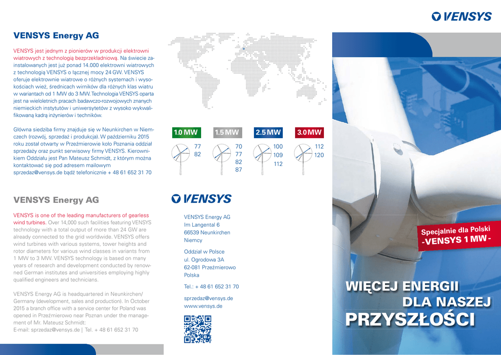 VENSYS Energy AG VENSYS jest jednym z pionierów w produkcji elektrowni wiatrowych z technologią bezprzekładniową. Na świecie zainstalowanych jest już ponad 14.000 elektrowni wiatrowych z technologią VENSYS o łącznej mocy 24 GW. VENSYS oferuje elektrownie wiatrowe o różnych systemach i wysokościach wież, średnicach wirników dla różnych klas wiatru w wariantach od 1 MW do 3 MW. Technologia VENSYS oparta jest na wieloletnich pracach badawczo-rozwojowych znanych niemieckich instytutów i uniwersytetów z wysoko wykwalifikowaną kadrą inżynierów i techników. Główna siedziba firmy znajduje się w Neunkirchen w Niemczech (rozwój, sprzedaż i produkcja). W październiku 2015 roku został otwarty w Przeźmierowie koło Poznania oddział sprzedaży oraz punkt serwisowy firmy VENSYS. Kierownikiem Oddziału jest Pan Mateusz Schmidt, z którym można kontaktować się pod adresem mailowym [email protected] bądź telefonicznie + 48 61 652 31 70 1.0 MW 1.5 MW 77 82 70 77 82 87 2.5 MW 100 109 112 3.0 MW 112 120 VENSYS Energy AG VENSYS is one of the leading manufacturers of gearless wind turbines. Over 14,000 such facilities featuring VENSYS technology with a total output of more than 24 GW are already connected to the grid worldwide. VENSYS offers wind turbines with various systems, tower heights and rotor diameters for various wind classes in variants from 1 MW to 3 MW. VENSYS technology is based on many years of research and development conducted by renowned German institutes and universities employing highly qualified engineers and technicians. VENSYS Energy AG Im Langental 6 66539 Neunkirchen Niemcy Oddział w Polsce ul. Ogrodowa 3A 62-081 Przeźmierowo Polska Tel.: + 48 61 652 31 70 VENSYS Energy AG is headquartered in Neunkirchen/ Germany (development, sales and production). In October 2015 a branch office with a service center for Poland was opened in Przeźmierowo near Poznan under the management of Mr. Mateusz Schmidt: E-mail: [email protected] | Tel. + 48 61 652 31 70 [email protected] www.vensys.de ki Specjalnie dla Pols - VENSYS 1 MW - WIECEJ ENERGII DLA NASZEJ PRZYSZŁOŚCI Foto: U. Mertens VENSYS Energy AG VENSYS ist einer der führenden Hersteller getriebeloser Windenergieanlagen. Weltweit befinden sich bereits über 12.000 dieser Anlagen mit VENSYS-Technologie und mehr als 20 Gigawatt Gesamtleistung am Netz. 2 Die Technologie von VENSYS gründet auf langjähriger Forschungs- und Entwicklungsarbeit namhafter deutscher Institute und Universitäten, mit hoch qualifizierten Ingenieuren und Technikern. 1 Mit der Konstruktion und Herstellung getriebeloser Megawatt-Windenergieanlagen leistet VENSYS einen großen Beitrag zum Umwelt- und Klimaschutz. Das Ergebnis sind Windenergieanlagen, die bei ihrem weltweiten Einsatz bei höchster Effizienz mit einem Minimum an Verschleißteilen auskommen. 4 3 VENSYS Energy AG VENSYS is one of the leading manufacturers of gearless wind turbines. Worldwide over 12,000 turbines of that type featuring VENSYS technology with a total output of more than 20 gigawatts are already connected to the grid. VENSYS technology is based on many years of research and development by renowned German institutes and universities conducted by highly qualified engineers and technicians. By designing and manufacturing gearless wind turbines in the megawatt class VENSYS makes a major contribution to the protection of our climate and environment, resulting in wind turbines that in locations all over the globe keep the number of wear parts to an absolute minimum and yet operate at the highest level of efficiency. 2,5 MW, Titting, Germany 1 Napęd bezprzekładniowy Rezygnacja z przekładni oznacza redukcję kosztów napraw i konserwacji oraz zwiększa wydajność, zwłaszcza w zakresie częściowego obciążenia. 2 Technologia magnesów trwałych Wysokiej jakości magnesy trwałe eliminują potrzebę wzbudzenia, co wpływa na wzrost wydajności energetycznej. 3 VENSYS pitch system System ustawienia łopat z napędem pasów zębatych pracuje bez smarowania oraz ogranicza zużycie i konserwację do minimum. 4 Chłodzenie powietrzem System chłodzenia generatora powietrzem zmniejsza liczbę elementów i eliminuje potrzebę stosowania środków chłodzących i prac konserwacyjnych. 5 Pełny konwerter energii (zlokalizowany jest w podstawie wieży elektrowni wiatrowej) Wyposażony w system przetworników częstotliwości spełnia wymagania i wytyczne różnych operatorów sieci. 1 Direct Drive Technology Dispensing with a gearbox reduces repair and maintenance costs and increases the yield, especially in the partial-load range. 2 Permanent Magnet Technology High-quality permanent magnets save excitation power, resulting in an even higher yield. 3 VENSYS Pitch System The blade pitch system with a toothed belt drive works without lubrication and keeps wear and maintenance to a minimum. 4 Air Cooling The air cooling of the generator further reduces the number of components and cooling agents and cuts down on maintenance work. 5 Full Power Converter Systems (placed in the tower base of the turbine) They feature power plant properties and comply with the requirements and guidelines of various grid operators.