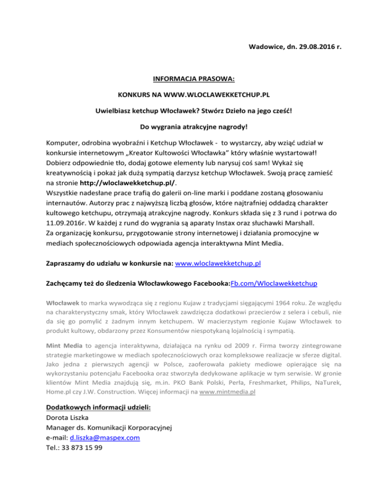 Wadowice, dn. 29.08.2016 r. INFORMACJA PRASOWA: KONKURS NA WWW.WLOCLAWEKKETCHUP.PL Uwielbiasz ketchup Włocławek? Stwórz Dzieło na jego cześć! Do wygrania atrakcyjne nagrody! Komputer, odrobina wyobraźni i Ketchup Włocławek - to wystarczy, aby wziąć udział w konkursie internetowym „Kreator Kultowości Włocławka” który właśnie wystartował! Dobierz odpowiednie tło, dodaj gotowe elementy lub narysuj coś sam! Wykaż się kreatywnością i pokaż jak dużą sympatią darzysz ketchup Włocławek. Swoją pracę zamieść na stronie http://wloclawekketchup.pl/. Wszystkie nadesłane prace trafią do galerii on-line marki i poddane zostaną głosowaniu internautów. Autorzy prac z najwyższą liczbą głosów, które najtrafniej oddadzą charakter kultowego ketchupu, otrzymają atrakcyjne nagrody. Konkurs składa się z 3 rund i potrwa do 11.09.2016r. W każdej z rund do wygrania są aparaty Instax oraz słuchawki Marshall. Za organizację konkursu, przygotowanie strony internetowej i działania promocyjne w mediach społecznościowych odpowiada agencja interaktywna Mint Media. Zapraszamy do udziału w konkursie na: www.wloclawekketchup.pl Zachęcamy też do śledzenia Włocławkowego Facebooka:Fb.com/Wloclawekketchup Włocławek to marka wywodząca się z regionu Kujaw z tradycjami sięgającymi 1964 roku. Ze względu na charakterystyczny smak, który Włocławek zawdzięcza dodatkowi przecierów z selera i cebuli, nie da się go pomylić z żadnym innym ketchupem. W macierzystym regionie Kujaw Włocławek to produkt kultowy, obdarzony przez Konsumentów niespotykaną lojalnością i sympatią. Mint Media to agencja interaktywna, działająca na rynku od 2009 r. Firma tworzy zintegrowane strategie marketingowe w mediach społecznościowych oraz kompleksowe realizacje w sferze digital. Jako jedna z pierwszych agencji w Polsce, zaoferowała pakiety mediowe opierające się na wykorzystaniu potencjału Facebooka oraz stworzyła dedykowane aplikacje w tym serwisie. W gronie klientów Mint Media znajdują się, m.in. PKO Bank Polski, Perła, Freshmarket, Philips, NaTurek, Home.pl czy J.W. Construction. Więcej informacji na www.mintmedia.pl Dodatkowych informacji udzieli: Dorota Liszka Manager ds. Komunikacji Korporacyjnej e-mail: [email protected] Tel.: 33 873 15 99