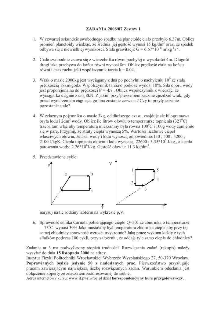 ZADANIA 2006/07 Zestaw 1. 1. W czwartej sekundzie swobodnego spadku na planetoidę ciało przebyło 6.37m. Oblicz promień planetoidy wiedząc, Ŝe średnia jej gęstość wynosi 15 kg/dm3 oraz, Ŝe spadek odbywa się z niewielkiej wysokości. Stała grawitacji: G = 6.67*10-11m3kg-1s-2. 2. Ciało swobodnie zsuwa się z wierzchołka równi pochyłej o wysokości 4m. Długość drogi jaką przebywa do końca równi wynosi 8m. Oblicz prędkość ciała na końcu równi i czas ruchu jeśli współczynnik tarcia k = 0.04. 3. Wrak o masie 2000kg jest wyciągany z dna po pochylni o nachyleniu 100 ze stałą prędkością 18km/godz. Współczynnik tarcia o podłoŜe wynosi 10%. Siła oporu wody jest proporcjonalna do prędkości F = -kv . Oblicz współczynnik k wiedząc, Ŝe wyciągarka ciągnie z siłą 8kN. Z jakim przyśpieszeniem zacznie zjeŜdŜać wrak, gdy przed wynurzeniem ciągnąca go lina zostanie zerwana? Czy to przyśpieszenie pozostanie stałe? 4. W Ŝelaznym pojemniku o masie 3kg, od dłuŜszego czasu, znajduje się kilogramowa bryła lodu i 2dm3 wody. Oblicz ile litrów ołowiu o temperaturze topnienia (3270C) trzeba tam wlać aby temperatura mieszaniny była równa 1000C i 100g wody zamieniło się w parę. Przyjmij, Ŝe straty ciepła wynoszą 5%. Wartości liczbowe ciepeł właściwych ołowiu, Ŝelaza, wody i lodu wynoszą odpowiednio:130 ; 500 ; 4200 ; 2100 J/kgK. Ciepła topnienia ołowiu i lodu wynoszą: 22600 ; 3.35*105 J/kg , a ciepło parowania wody: 2.26*106J/kg. Gęstość ołowiu: 11.3 kg/dm3. 5. Przedstawione cykle: V p 1 2 3 5 1 4 2 1 1 4 T 3 T narysuj na tle rodziny izoterm na wykresie p,V. 6. Sprawność silnika Carnota pobierającego ciepło Q=50J ze zbiornika o temperaturze – 730C wynosi 30% Jaka musiałaby być temperatura zbiornika ciepła aby przy tej samej chłodnicy sprawność wzrosła trzykrotnie? Jaką pracę wykona kaŜdy z tych silników podczas 100 cykli, przy załoŜeniu, Ŝe oddają tyle samo ciepła do chłodnicy? Zadanie nr 3 ma podwyŜszony stopień trudności. Rozwiązania zadań (rękopis) naleŜy wysyłać do dnia 15 listopada 2006 na adres: Instytut Fizyki Politechniki Wrocławskiej WybrzeŜe Wyspiańskiego 27, 50-370 Wrocław. Poprawianych będzie jedynie 50 z nadesłanych prac. Pierwszeństwo przysługuje pracom zawierającym największą liczbę rozwiązanych zadań. Warunkiem odesłania jest dołączenie koperty ze znaczkiem zaadresowanej do siebie. Adres internetowy kursu: www.if.pwr.wroc.pl dział korespondencyjny kurs przygotowawczy.