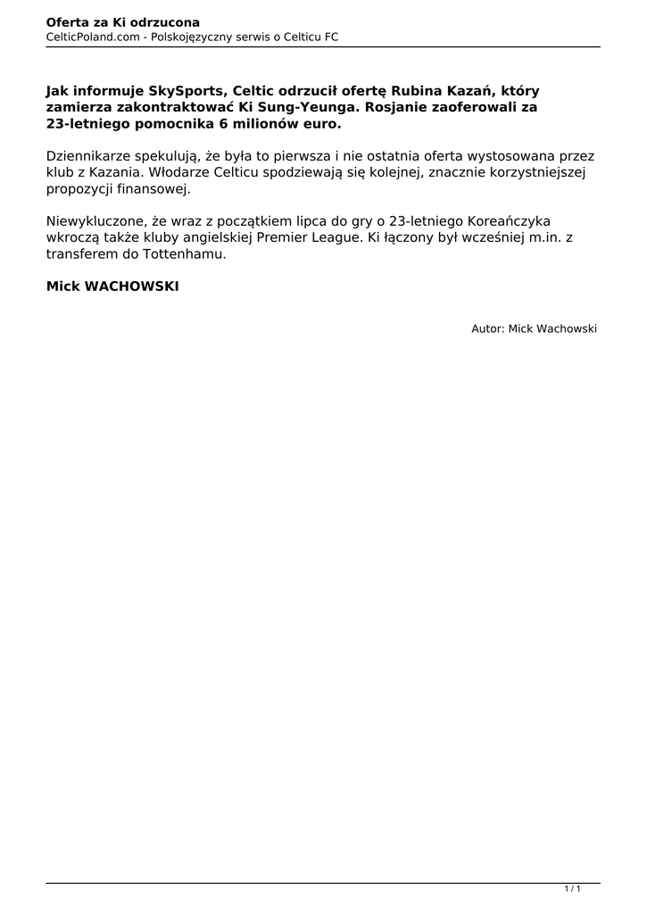 Oferta za Ki odrzucona CelticPoland.com - Polskojęzyczny serwis o Celticu FC Jak informuje SkySports, Celtic odrzucił ofertę Rubina Kazań, który zamierza zakontraktować Ki Sung-Yeunga. Rosjanie zaoferowali za 23-letniego pomocnika 6 milionów euro. Dziennikarze spekulują, że była to pierwsza i nie ostatnia oferta wystosowana przez klub z Kazania. Włodarze Celticu spodziewają się kolejnej, znacznie korzystniejszej propozycji finansowej. Niewykluczone, że wraz z początkiem lipca do gry o 23-letniego Koreańczyka wkroczą także kluby angielskiej Premier League. Ki łączony był wcześniej m.in. z transferem do Tottenhamu. Mick WACHOWSKI Autor: Mick Wachowski 1/1 Powered by TCPDF (www.tcpdf.org)