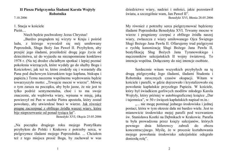II Piesza Pielgrzymka Śladami Karola Wojtyły Robotnika dziedzictwo wiary, nadziei i miłości, jakie pozostawił światu, a szczególnie wam, Jan Paweł II”. Benedykt XVI, Błonia 28.05.2006 7.10.2006 1. Stacja w kościele Pieśń.... Niech będzie pochwalony Jezus Chrystus! „Bardzo pragnąłem tej wizyty w Kraju i pośród ludu, z którego wywodził się mój umiłowany Poprzednik, Sługa Boży Jan Paweł II. Przybyłem, aby przejść jego śladami, prześledzić drogę jego życia od dzieciństwa, aż do wyjazdu na niezapomniane konklawe 1978 r. (Na tej drodze chciałbym spotkać i lepiej poznać pokolenia wierzących, które wydały go do służby Bogu i Kościołowi, jak też te, które zrodziły się i wzrastały dla Pana pod duchowym kierunkiem tego kapłana, biskupa i papieża.) Temu naszemu wspólnemu wędrowaniu będzie towarzyszyło motto: „Trwajcie mocni w wierze”. Mówię o tym zaraza na początku, aby było jasne, że nie jest to tylko podróż sentymentalna, choć i to ma swoje znaczenie, ale wędrówka wiary, wpisana w misję, jaką powierzył mi Pan w osobie Piotra apostoła, który został powołany, aby utwierdzać braci w wierze. Jak również pragnę zaczerpnąć z obfitego źródła waszej wiary, które bije nieprzerwanie od ponad tysiąca lat”. My również z potrzeby serca pielgrzymować będziemy śladami Poprzednika Benedykta XVI. Trwamy mocno w wierze i pragniemy czerpać z obfitego źródła naszej wiary, zwłaszcza z wiary umiłowanego Ojca Świętego Sługi Bożego Jana Pawła II. Ofiarujemy trud pielgrzymi o rychłą kanonizację Sługi Bożego Jana Pawła II, beatyfikację Sług Bożych Jana Tyranowskiego i męczenników salezjańskich II wojny światowej. To intencja wspólna. Dołączamy do niej intencje osobiste. „Na początku drugiego roku mojego Pontyfikatu przybyłem do Polski i Krakowa z potrzeby serca, w pielgrzymce śladami mojego Poprzednika. ... Chciałem też z tego miejsca prosić Boga, by zachował w was Serdecznie witam wszystkich przybyłych na tę drugą pielgrzymkę Jego śladami, śladami Studenta i Robotnika mrocznych czasów okupacji. Witam w kościele i parafii, w gdzie dojrzewało i krystalizowało się powołanie kapłańskie przyszłego Papieża. W kościele, który był świadkiem gorliwych modlitw młodego Karola Wojtyły, który później w autobiograficznej książce „Dar i tajemnica”, w 50 r święceń kapłańskich napisał m.in.: „... nie mogę pominąć jednego środowiska i jednej postaci, która w tym okresie dała mi bardzo wiele. Jest to mianowicie środowisko mojej parafii pod wezwaniem św. Stanisława Kostki na Dębnikach w Krakowie. Parafia ta była prowadzona przez księży salezjanów, których pewnego dnia hitlerowcy zabrali do obozu koncentracyjnego. Myślę, że w procesie kształtowania mojego powołania środowisko salezjańskie odegrało doniosłą rolę”. 1 2 Benedykt XVI, Okęcie 25.05.2006 Gorąco witam wszystkich parafian, którzy cieszą się, że przez 6 lat współtworzył tę parafię największy z nas Karol Wojtyła. Witam serdecznie wszystkich pielgrzymów z Krakowa i z poza Krakowa: pielgrzymów z Lublina, parafia Najświętszej Maryi Panny Wspomożycielki Wiernych z ks. proboszczem Edwardem Lisowskim, pielgrzymów z parafii św. Jadwigi Królowej z Kielc, z ks. wikariuszem Grzegorzem Pańczykiem, pielgrzymów ze Staniątek z ks. Grzegorzem Muchą, salezjanów, siostry zakonne. Trasa pielgrzymki jest podobna do ubiegłorocznej, z małą korektą. Przystanki: ul. Różana 11, dom Sługi Bożego Jana Tyranowskiego; ul. Tyniecka 10 dom Sługi Bożego Jana Pawła II; ul. Szwedzka 12 dom przyjaciół Karola Wojtyły p. Szkockich i Poźniaków; przy końcu ul. Twardowskiego rozpoczniemy Drogę Krzyżową, którą poprowadzą aktorzy Teatru Hagiograf z p. dyrektor Izabelą Drobotowicz-Orkusz na czele. Dojdziemy do Kamieniołomu, z którego udamy się odmawiając Różaniec św. do Sanktuarium Bożego Miłosierdzia, gdzie o 13.00 odprawimy uroczystą Mszę św. Formujemy kolumnę: przewodził nam będzie krzyż. Szczęść Boże! - foldery i śpiewniczki przy wyjściu; pamiątki przed Mszą św. w sanktuarium. Lato 1938. II Stacja ul. Różana 11 Sługa Boży p. Jan Tyranowski 3 Było to w pierwszy roku wojny. Już w lutym xx. Salezjanie prowadzący parafię św. Stanisława Kostki na Dębnikach w Krakowie urządzili rekolekcje wielkopostne dla młodzieży męskiej. Ująwszy zaś takim sposobem znaczną jej część, zapowiedzieli, że odtąd w sobotę odbywać się będą w kaplicy ochotnicze zebrania dla tych wszystkich, których zajmują zagadnienia religijne. Zebrania te ściągały stale około 20-30 młodych ludzi, w wieku 16-25 lat. Wykładowca, znany biblista, ks. Jan Mazerski, docent UJ (zginął w powstaniu warszawskim) – był świetny, a miejsce zebrań, kaplic, bynajmniej nie przeszkadzało mu wzywać uczestników do dyskusji, a nawet do wygłaszania referatów, przez co oczywiści cała rzecz stawała się bardziej pociągająca. Wtedy to po raz pierwszy dał się poznać dębnickiej młodzieży człowiek, o którym mówić będą niniejsze wspomnienia. Będziemy go nazywać imieniem Jan. .... Raziły nas nieraz słowa, nie dlatego, żeby były jakieś nieodpowiednie, ale że były nieoryginalne, miłość własna cierpiała przeczuwając tę różnicę poziomów, jaka dzieliła jego i nasze życie wewnętrzne. ... On ukazywał Boga dużo bezpośredniej, aniżeli kazania i księgi, on dowodził, że o Bogu można się nie tylko dowiadywać, że Bogiem można żyć. ... Apostolstwo Jana nie było masowe. Jan najwięcej czynił przez osobiste rozmowy i konferencje, podczas których nie wykładał, nie nauczał, ale wszystkiego dokonywał tym jakimś ciążeniem swego życia wewnętrznego. ... Głównym jednak żywiołem jego życia wewnętrznego było rozmyślanie... nawet 4 godziny dziennie... Rozmyślanie było dla Jana przede wszystkim szukaniem Boga wprost, nie zaś s
