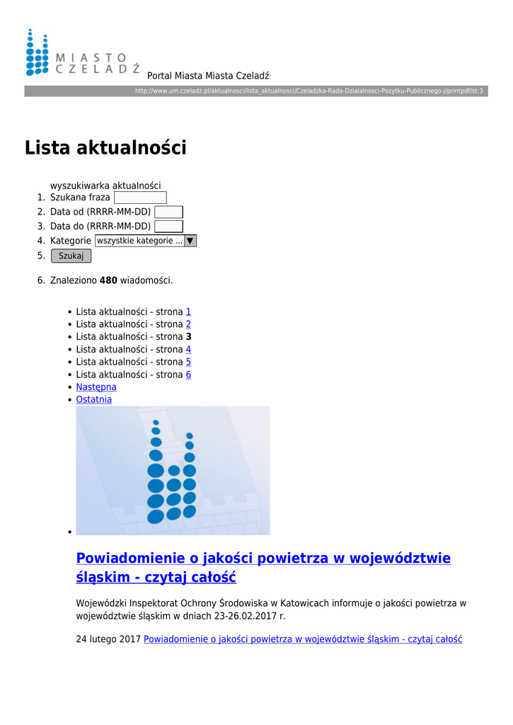 Portal Miasta Miasta Czeladź http://www.um.czeladz.pl/aktualnosci/lista_aktualnosci/Czeladzka-Rada-Dzialalnosci-Pozytku-Publicznego-j/printpdf/st:3 Lista aktualności wyszukiwarka aktualności 1. Szukana fraza 2. Data od (RRRR-MM-DD) 3. Data do (RRRR-MM-DD) 4. Kategorie wszystkie kategorie ... ▼ 5. Szukaj 6. Znaleziono 480 wiadomości. Lista aktualności - strona 1 Lista aktualności - strona 2 Lista aktualności - strona 3 Lista aktualności - strona 4 Lista aktualności - strona 5 Lista aktualności - strona 6 Następna Ostatnia Powiadomienie o jakości powietrza w województwie śląskim - czytaj całość Wojewódzki Inspektorat Ochrony Środowiska w Katowicach informuje o jakości powietrza w województwie śląskim w dniach 23-26.02.2017 r. 24 lutego 2017 Powiadomienie o jakości powietrza w województwie śląskim - czytaj całość Pamięci "Żołnierzy Wyklętych" - czytaj całość W najbliższą środę, 1 marca obchodzimy Narodowy Dzień Pamięci "Żołnierzy Wyklętych". W południe w kościele św. Stanisława B.M. nastąpi odsłonięcie tablicy, poświęconej bohaterom antykomunistycznego i niepodległościowego podziemia. 24 lutego 2017 Pamięci "Żołnierzy Wyklętych" - czytaj całość Prognoza niebezpiecznych zjawisk meteorologicznych silny wiatr, oblodzenie - czytaj całość Prognoza niebezpiecznych zjawisk meteorologicznych - silny wiatr i oblodzenie. 24 lutego 2017 Prognoza niebezpiecznych zjawisk meteorologicznych - silny wiatr, oblodzenie czytaj całość Ostrzeżenie meteorologiczne nr 35 - silny wiatr - czytaj całość Instytut Meteorologii i Gospodarki Wodnej prognozuje wystąpienie silnego wiatru o średniej prędkości od 30 km/h do 45 km/h, z porywami do 90 km/h, z zachodu. 23 lutego 2017 Ostrzeżenie meteorologiczne nr 35 - silny wiatr - czytaj całość Powiadomienie o jakości powietrza w województwie śląskim - czytaj całość Wojewódzki Inspektorat Ochrony Środowiska w Katowicach informuje o jakości powietrza w województwie śląskim w dniach 22-24.02.2017 r. 23 lutego 2017 Powiadomienie o jakości powietrza w województwie śląskim - czytaj całość Czeladź oczyma mieszkańców - czytaj całość Jak się żyje w Czeladzi? Odpowiedzi na to i wiele innych pytań poznaliśmy podczas środowego spotkania w Kopalni Kultury. 23 lutego 2017 Czeladź oczyma mieszkańców - czytaj całość Powiadomienie o jakości powietrza w województwie śląskim - czytaj całość Wojewódzki Inspektorat Ochrony Środowiska w Katowicach informuje o jakości powietrza w województwie śląskim w dniach 21-22/23.02.2017 r. 22 lutego 2017 Powiadomienie o jakości powietrza w województwie śląskim - czytaj całość Grzegorz Niemczuk znów w Saturnie - czytaj całość W najbliższy piątek, 24 lutego w Muzeum Saturn wystąpi z recitalem fortepianowym znakomity pianista klasyczny Grzegorz Niemczuk. 22 lutego 2017 Grzegorz Niemczuk znów w Saturnie - czytaj całość Nabór do przedszkoli publicznych - czytaj całość W środę, 1 marca 2017 r. rusza nabór do czeladzkich przedszkoli publicznych na rok szkolny 2017/2018. Druki wniosków o przyjęcie będą dostępne w każdym przedszkolu. 22 lutego 2017 Nabór do przedszkoli publicznych - czytaj całość Pociąg do kultury dla czeladzkich seniorów - czytaj całość Kolejny rok Miasto Czeladź serdecznie zaprasza czeladzkich seniorów na comiesięczne, jednodniowe wycieczki w ramach projektu „Wycieczki dla osób po 60 roku życia – Pociąg do kultury”. 22 lutego 2017 Pociąg do kultury dla czeladzkich seniorów - czytaj całość Lista aktualności - strona 1 Lista aktualności - strona 2 Lista aktualności - strona 3 Lista aktualności - strona 4 Lista aktualności - strona 5 Lista aktualności - strona 6 Następna Ostatnia