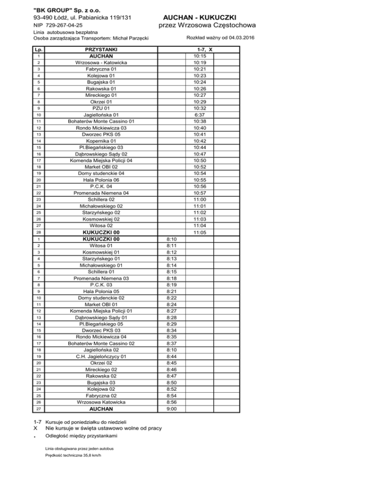 "BK GROUP" Sp. z o.o. 93-490 Łódź, ul. Pabianicka 119/131 NIP 729-267-04-25 AUCHAN - KUKUCZKI przez Wrzosowa Częstochowa Linia autobusowa bezpłatna Osoba zarządzająca Transportem: Michał Parzęcki Lp. PRZYSTANKI 1 AUCHAN 2 Wrzosowa - Katowicka Fabryczna 01 Kolejowa 01 Bugajska 01 Rakowska 01 Mireckiego 01 Okrzei 01 PZU 01 Jagiellońska 01 Bohaterów Monte Cassino 01 Rondo Mickiewicza 03 Dworzec PKS 05 Kopernika 01 Pl.Biegańskiego 03 Dąbrowskiego Sądy 02 Komenda Miejska Policji 04 Market OBI 02 Domy studenckie 04 Hala Polonia 06 P.C.K. 04 Promenada Niemena 04 Schillera 02 Michałowskiego 02 Starzyńskego 02 Kosmowskiej 02 Witosa 02 3 4 5 6 7 8 9 10 11 12 13 14 15 16 17 18 19 20 21 22 23 24 25 26 27 28 1 KUKUCZKI 00 KUKUCZKI 00 26 Witosa 01 Kosmowskiej 01 Starzyńskego 01 Michałowskiego 01 Schillera 01 Promenada Niemena 03 P.C.K. 03 Hala Polonia 05 Domy studenckie 02 Market OBI 01 Komenda Miejska Policji 01 Dąbrowskiego Sądy 01 Pl.Biegańskiego 05 Dworzec PKS 03 Rondo Mickiewicza 04 Bohaterów Monte Cassino 02 Jagiellońska 02 C.H. Jagielończycy 01 Okrzei 02 Mireckiego 02 Rakowska 02 Bugajska 03 Kolejowa 02 Fabryczna 02 Wrzosowa Katowicka 27 AUCHAN 2 3 4 5 6 7 8 9 10 11 12 13 14 15 16 17 18 19 20 21 22 23 24 25 1-7 Kursuje od poniedziałku do niedzieli X Nie kursuje w święta ustawowo wolne od pracy . Odległość między przystankami Linia obsługiwana przez jeden autobus Prędkość techniczna 35,8 km/h Rozkład ważny od 04.03.2016 8:10 8:11 8:12 8:13 8:14 8:15 8:18 8:19 8:21 8:22 8:24 8:27 8:28 8:29 8:34 8:35 8:37 8:10 8:44 8:45 8:46 8:47 8:50 8:52 8:54 8:56 9:00 1-7, X 10:15 10:19 10:21 10:23 10:24 10:26 10:27 10:29 10:32 6:37 10:38 10:40 10:41 10:42 10:44 10:47 10:50 10:52 10:54 10:55 10:56 10:57 11:00 11:01 11:02 11:03 11:04 11:05 13:15 13:16 13:17 13:18 13:19 13:20 13:23 13:24 13:26 13:27 13:29 13:32 13:33 13:34 13:39 13:40 13:42 8:39 13:49 13:50 13:51 13:52 13:55 13:57 13:59 14:01 14:05 0:00 0:04 0:06 0:08 0:09 0:11 0:12 0:14 0:17 0:23 0:25 0:26 0:27 0:29 0:32 0:35 0:37 0:39 0:40 0:41 0:42 0:45 0:46 0:47 0:48 0:49 0:50 0:00 0:01 0:01 0:02 0:02 0:03 0:03 0:04 0:04 0:05 0:05 0:08 0:07 0:09 0:08 0:11 0:10 0:12 0:11 0:14 0:12 0:17 0:14 0:18 0:15 0:19 0:16 0:24 0:20 0:25 0:21 0:27 0:23 0:34 0:28 0:35 0:29 0:36 0:30 0:37 0:31 0:40 0:32 0:42 0:34 0:44 0:36 0:46 0:38 0:50 0:41