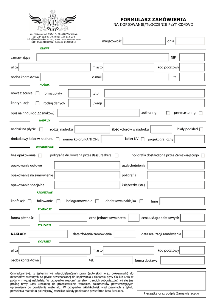 FORMULARZ ZAMÓWIENIA NA KOPIOWANIE/TŁOCZENIE PŁYT CD/DVD ul. Mokotowska 15A/1B, 00-640 Warszawa tel. 22/ 592 47 70, mob: 724 614 018 [email protected], www.bassbreakers.com NIP: PL5321808932, Regon: 142506117 miejscowość dnia KLIENT zamawiający NIP ulica miasto osoba kontaktowa e-mail kod pocztowy tel. NOŚNIK nowe zlecenie format płyty tytuł kontynuacja rodzaj danych uwagi authoring opis na ringu (do 22 znaków) pre-mastering NADRUK nadruk na płycie rodzaj nadruku dodatkowy kolor w nadruku biały podkład ilość kolorów w nadruku lakier UV numer koloru PANTONE projekt graficzny OPAKOWANIE bez opakowania poligrafia drukowana przez BassBreakers poligrafia dostarczona przez Zamawiającego opakowania gotowe uszlachetnienia opakowania na zamówienie poligrafia opakowania specjalne książeczka (str.) PAKOWANIE konfekcja foliowanie hologramowanie dodatkowa naklejka Inne PŁATNOŚĆ forma płatności cena jednostkowa netto cena usług dodatkowych RELIZACJA NAKŁAD: data złożenia zamówienia data realizacji zamówienia DOSTAWA ulica osoba kontaktowa miasto tel. Oświadczam(y), iż jestem(śmy) właścicielem(ami) praw (autorskich oraz pokrewnych) do materiałów zawartych na płycie przeznaczonej do kopiowania / tłoczenia płyty CD lub DVD w podanym wyżej nakładzie. W przypadku roszczeń ze stron trzecich zobowiązuję(my) się (na prośbę firmy Bass Breakers) do przedstawienia wszelkich dokumentów potwierdzających uprawnienia do powielenia materiału. W przypadku jakichkolwiek wad prawnych z tytułu powielenia materiału pokryję(my) wszelkie szkody poniesione przez firme Bass Breakers. kod pocztowy forma dostawy Pieczątka oraz podpis Zamawiającego