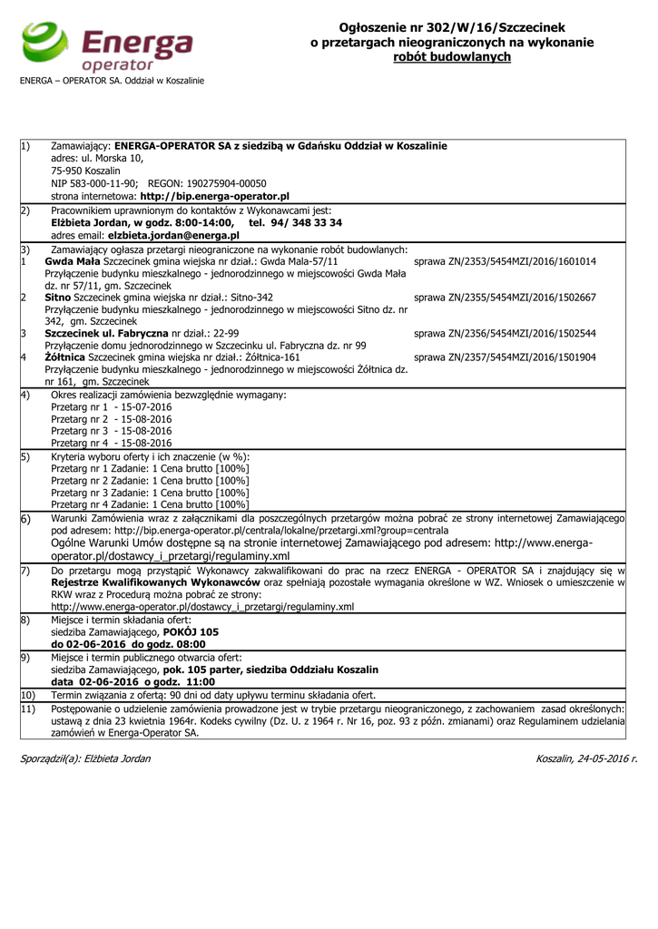 Ogłoszenie nr 302/W/16/Szczecinek o przetargach nieograniczonych na wykonanie robót budowlanych ENERGA – OPERATOR SA. Oddział w Koszalinie 1) 2) 3) 1 2 3 4 4) 5) 6) Zamawiający: ENERGA-OPERATOR SA z siedzibą w Gdańsku Oddział w Koszalinie adres: ul. Morska 10, 75-950 Koszalin NIP 583-000-11-90; REGON: 190275904-00050 strona internetowa: http://bip.energa-operator.pl Pracownikiem uprawnionym do kontaktów z Wykonawcami jest: Elżbieta Jordan, w godz. 8:00-14:00, tel. 94/ 348 33 34 adres email: [email protected] Zamawiający ogłasza przetargi nieograniczone na wykonanie robót budowlanych: Gwda Mała Szczecinek gmina wiejska nr dział.: Gwda Mala-57/11 sprawa ZN/2353/5454MZI/2016/1601014 Przyłączenie budynku mieszkalnego - jednorodzinnego w miejscowości Gwda Mała dz. nr 57/11, gm. Szczecinek Sitno Szczecinek gmina wiejska nr dział.: Sitno-342 sprawa ZN/2355/5454MZI/2016/1502667 Przyłączenie budynku mieszkalnego - jednorodzinnego w miejscowości Sitno dz. nr 342, gm. Szczecinek Szczecinek ul. Fabryczna nr dział.: 22-99 sprawa ZN/2356/5454MZI/2016/1502544 Przyłączenie domu jednorodzinnego w Szczecinku ul. Fabryczna dz. nr 99 Żółtnica Szczecinek gmina wiejska nr dział.: Żółtnica-161 sprawa ZN/2357/5454MZI/2016/1501904 Przyłączenie budynku mieszkalnego - jednorodzinnego w miejscowości Żółtnica dz. nr 161, gm. Szczecinek Okres realizacji zamówienia bezwzględnie wymagany: Przetarg nr 1 - 15-07-2016 Przetarg nr 2 - 15-08-2016 Przetarg nr 3 - 15-08-2016 Przetarg nr 4 - 15-08-2016 Kryteria wyboru oferty i ich znaczenie (w %): Przetarg nr 1 Zadanie: 1 Cena brutto [100%] Przetarg nr 2 Zadanie: 1 Cena brutto [100%] Przetarg nr 3 Zadanie: 1 Cena brutto [100%] Przetarg nr 4 Zadanie: 1 Cena brutto [100%] Warunki Zamówienia wraz z załącznikami dla poszczególnych przetargów można pobrać ze strony internetowej Zamawiającego pod adresem: http://bip.energa-operator.pl/centrala/lokalne/przetargi.xml?group=centrala Ogólne Warunki Umów dostępne są na stronie internetowej Zamawiającego pod adresem: http://www.energaoperator.pl/dostawcy_i_przetargi/regulaminy.xml 7) 8) 9) 10) 11) Do przetargu mogą przystąpić Wykonawcy zakwalifikowani do prac na rzecz ENERGA - OPERATOR SA i znajdujący się w Rejestrze Kwalifikowanych Wykonawców oraz spełniają pozostałe wymagania określone w WZ. Wniosek o umieszczenie w RKW wraz z Procedurą można pobrać ze strony: http://www.energa-operator.pl/dostawcy_i_przetargi/regulaminy.xml Miejsce i termin składania ofert: siedziba Zamawiającego, POKÓJ 105 do 02-06-2016 do godz. 08:00 Miejsce i termin publicznego otwarcia ofert: siedziba Zamawiającego, pok. 105 parter, siedziba Oddziału Koszalin data 02-06-2016 o godz. 11:00 Termin związania z ofertą: 90 dni od daty upływu terminu składania ofert. Postępowanie o udzielenie zamówienia prowadzone jest w trybie przetargu nieograniczonego, z zachowaniem zasad określonych: ustawą z dnia 23 kwietnia 1964r. Kodeks cywilny (Dz. U. z 1964 r. Nr 16, poz. 93 z późn. zmianami) oraz Regulaminem udzielania zamówień w Energa-Operator SA. Sporządził(a): Elżbieta Jordan Koszalin, 24-05-2016 r.
