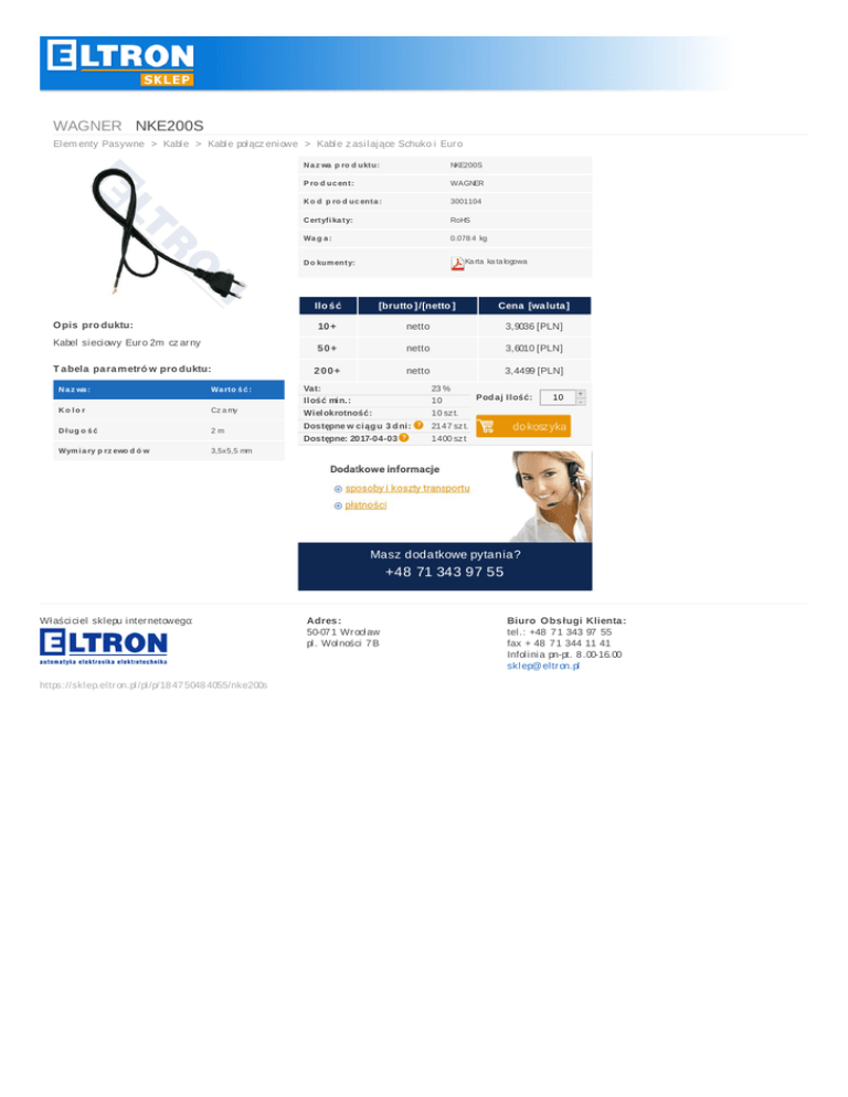 WAGNERNKE200S El em entyPasywne > Kabl e > Kabl epoł ącz eni owe > Kabl ez asi l aj ąceSchukoi Eur o N a z wa p ro d u ktu : NKE200S P ro d u c en t: WAGNER K o d p ro d u c en ta : 3001104 C ertyfi ka ty: RoHS Wa g a : 0.078 4 kg Ka rta ka ta logowa D o ku m en ty: O pis pro duktu: Kabel si eci owyEur o2m cz ar ny T a bela pa ra m etró wpro duktu: N a z wa : Wa rto ś ć : Ko lo r Cz a rny D ł ug o ś ć 2m Wym i a ryp rz ewo d ó w 3,5x5,5mm Ilo ś ć [brutto ] /[netto ] Cena [wa luta ] 10 + netto 3,9036[PLN] 50+ netto 3,6010[PLN] 200+ netto 3,4499[PLN] Vat: Ilośćmin.: Wielokrotność: 23% 10 10sz t. Dostępnewciąg u 3d ni: Dostępne:2017-04-03 2147sz t. 1400sz t Pod ajIlość: 10 + - dokosz yka Maszdodatkowepytania? +48713439755 Wł aści ci el skl epui nter netowego: https://skl ep.el tr on.pl /pl /p/18 47 5048 4055/nke200s Adres : 50-07 1Wr ocł aw pl .Wol ności 7 B Biuro O bs ługiKlienta : tel .:+48 7 134397 55 fax+48 7 13441141 Infol i ni apn-pt.8 .00-16.00 skl ep@ el tr on.pl