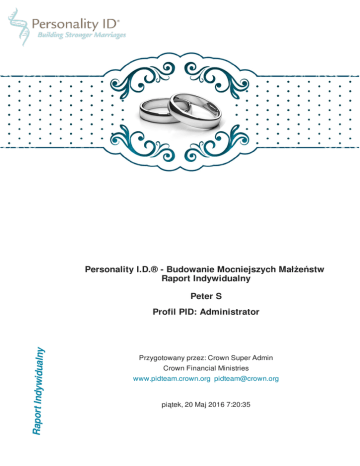 Personality I.D.® - Budowanie Mocniejszych Małżeństw Raport Indywidualny Peter S Raport Indywidualny Profil PID: Administrator Przygotowany przez: Crown Super Admin Crown Financial Ministries www.pidteam.crown.org [email protected] piątek, 20 Maj 2016 7:20:35 Raport Indywidualny Peter S: Administrator Wyniki pomiaru osobowości osoby badanej jaką jest Peter S są zobrazowane na poniższym diagramie linią ciągłą. Należy zwrócić uwagę także na widoczną na diagramie linię przerywaną, która reprezentuje profil podstawowy najbardziej zbliżony do profilu badanej osoby. Ten system profilowania wyróżnia siedemnaście profili podstawowych. Stanowią one bazę do interpretacji różnych kombinacji wyników, mierzonych w czterech zasadniczych wymiarach osobowości. Informacje zawarte w niniejszej sekcji są zaczerpnięte z charakterystyki profilu podstawowego typu Administrator. Zazwyczaj im bardziej linia ciągła diagramu jest dopasowana do profilu podstawowego, tym dokładniej opis słowny odzwierciedla to, jak w normalnych warunkach zachowuje się Peter S. Tak jak sugeruje nazwa profilu, Administrator łączy zdolność do współdziałania z ludźmi (i angażowania ich do procesu osiągania rezultatów) z determinacją do odniesienia sukcesu w ważnych sprawach. To połączenie silnych stron osobowości sprawia że masz możliwość sprawnego nadzorowania przedsięwzięć, które wymagają współpracy z innymi. Idealne otoczenie Realizujesz swój największy potencjał mając możliwości do: dawania przykładu - do konsekwentności - do tworzenia - do obserwowania całego procesu realizacji projektu aż do ukończenia - do nadzorowania - do czynienia stabilnego postępu - do demonstrowania lojalności - do osiągania celów - do inicjowania rozwiązań. Typowe silne dziedziny Administratorzy tacy jak ty mają tendencje do bycia stałymi i zorientowanymi na cel. Proponują oni rodzinie i przyjaciołom współpracę i podejmowanie działań wspólnie jako zespół. Możesz być dobrym liderem, bo łączysz cierpliwość ze stanowczością. Typowe dziedziny zmagań Z powodu twojego wysokiego oddania osiąganiu celów możesz czasami robić wrażenie osoby opornej, nieotwartej na inne opcje i oceniającej w kategoriach czarnych lub białych, bez żadnych opcji pośrednich. Peter S Przygotowany przez: Crown Super Admin, Crown Financial Ministries, www.pidteam.crown.org piątek, 20 Maj 2016 7:20:35 1/6 Administratorzy w domu i pracy: Preferowane czynności Aby maksymalizować wykorzystanie twoich talentów szukaj sytuacji, w których możesz osiągać cele, przewodzić, określać cele osobiste i rodzinne oraz budować możliwości do osiągania obopólnych korzyści. Wkład w relacje Masz tendencję do bycia osobą bardzo konsekwentną i zdeterminowaną w osiąganiu celów, wiernie realizujesz to co zostało przez ciebie rozpoczęte. Styl przewodzenia Przewodzisz najbardziej efektywnie wtedy, kiedy możesz dawać przykład i osiągać cele. Twój wysoki poziom etyki pracy może zachęcać znajomych i rodzinę do skutecznego podejmowania wysiłku. Prawdopodobnie posiadasz zdolność traktowania ludzi w sposób spokojny i jednocześnie zdecydowany. Nastawienie na zadania lub na relacje Posiadasz naturalną zdolność do utrzymywania dobrych relacji z innymi znajdując przy tym dobrą równowagę pomiędzy nastawieniem na relacje i na zadania zarówno w pracy jak i w domu. Styl komunikacji Zazwyczaj budujesz dobre relacje, które wykorzystujesz do powierzania obowiązków, do przydzielania zadań i do utrzymywania innych w odpowiedzialności za rezultaty. Administratorzy a Problemy Czynniki stabilności, elastyczności Pragniesz skupić się na projekcie i pracować bez przeszkód przez długi okres czasu, nie posiadasz potrzeby przenoszenia uwagi na coś innego. Czynniki stresu Masz tendencje do doświadczania stresu wtedy, gdy inni ludzie spowalniają twoje osiągnięcia lub postępy i kiedy znajdujesz się pośród ludzi zbyt rozmownych, zbyt konfrontacyjnych lub wchodzących w twój obszar odpowiedzialności. Sugestie odnośnie poprawiania jakości relacji Możesz doświadczyć poprawy swoich relacji, kiedy skupisz się na eliminacji zbytniej wrażliwości, gdy nauczysz się przyjmować konstruktywne sugestie ze strony innych, gdy inne dziedziny życia Uczynisz równie ważnymi jak twe osobiste pragnienie odnoszenia sukcesów. Czynniki współpracy i kontroli Zazwyczaj bardzo dobrze wspierasz osoby z przywództwa. Lubisz też mieć kontrolę nad własnym zakresem odpowiedzialności i cenisz sobie wolność podejmowania decyzji, które pozwolą ci osiągnąć właściwe rezultaty. Obszary wewnętrznej troski Silnym demotywatorem może być dla ciebie strach przed porażką w realizacji osobistych celów czy niezdolność do czynienia konkretnych postępów w sprawach osobistych i zawodowych. Administratorzy a Finanse Styl zarządzania finansami Lubisz mieć kontrolę nad finansami, ale potrzebujesz czasu na aktualizowanie danych. Najlepiej ci się pracuje gdy nadzorujesz osobę, dokonującą wpisów finansowych. Budżet i sprawy finansowe Masz tendencje do wykorzystywania pieniędzy jako narzędzia do cierpliwego osiągania celu, ale nie zawsze trzymasz się swego planu finansowego, kiedy finalny cel wydaje się być zagrożony. Peter S Przygotowany przez: Crown Super Admin, Crown Financial Ministries, www.pidteam.crown.org piątek, 20 Maj 2016 7:20:35 2/6 Tendencje zakupowe Wiesz czego chcesz, ale możesz mieć trudności w powiedzeniu sprzedawcy "nie". Możesz również zwlekać z zakupem do ostatniej chwili. Styl dawania Ponieważ pieniądze są ważne dla twego osobistego bezpieczeństwa to czasem niechętnie, dajesz na cele charytatywne, chyba że masz pewność rzeczywistej potrzeby lub powodu. Hojność może sprawiać ci trudności i potrzebujesz więcej zachęty i wiedzy w dziedzinie dawania z poświęceniem. Stosunek do oszczędzania Pragniesz odkładać pieniądze