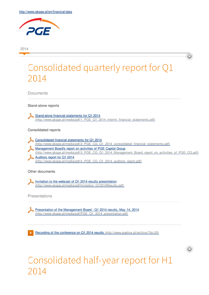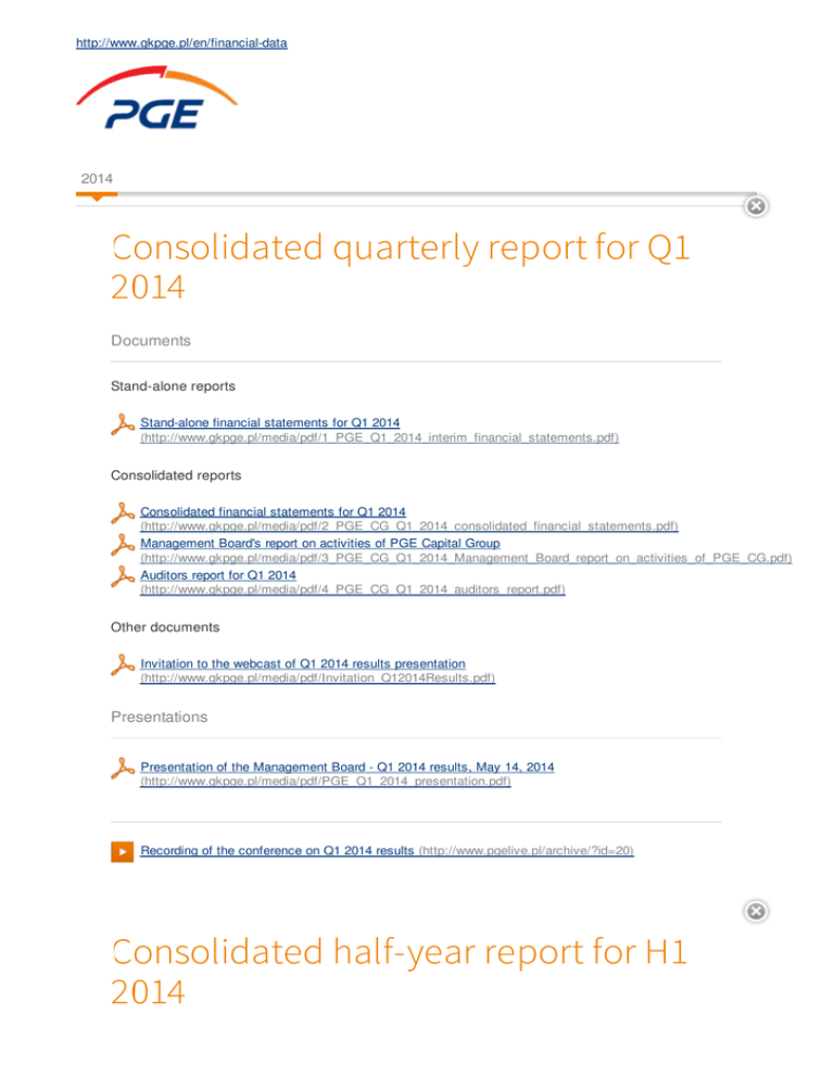 http://www.gkpge.pl/en/financial-data 2014 Consolidated quarterly report for Q1 2014 Documents Stand-alone reports Stand-alone financial statements for Q1 2014 (http://www.gkpge.pl/media/pdf/1_PGE_Q1_2014_interim_financial_statements.pdf) Consolidated reports Consolidated financial statements for Q1 2014 (http://www.gkpge.pl/media/pdf/2_PGE_CG_Q1_2014_consolidated_financial_statements.pdf) Management Board's report on activities of PGE Capital Group (http://www.gkpge.pl/media/pdf/3_PGE_CG_Q1_2014_Management_Board_report_on_activities_of_PGE_CG.pdf) Auditors report for Q1 2014 (http://www.gkpge.pl/media/pdf/4_PGE_CG_Q1_2014_auditors_report.pdf) Other documents Invitation to the webcast of Q1 2014 results presentation (http://www.gkpge.pl/media/pdf/Invitation_Q12014Results.pdf) Presentations Presentation of the Management Board - Q1 2014 results, May 14, 2014 (http://www.gkpge.pl/media/pdf/PGE_Q1_2014_presentation.pdf) Recording of the conference on Q1 2014 results (http://www.pgelive.pl/archive/?id=20) Consolidated half-year report for H1 2014 Documents CEO’s comment on H1 2014 results. H1 2014 results presentation. (http://www.gkpge.pl/media/pdf/PGE_H1_2014.pdf) Stand-alone reports Selected stand-alone financial data for PGE Polska Grupa Energetyczna S.A. for the first half of 2014 (http://www.gkpge.pl/media/pdf/1_Selected_standalone_financial_data_for_PGE_20140630.pdf) Half-year financial statements of PGE Polska Grupa Energetyczna S.A. for the first half of 2014 (http://www.gkpge.pl/media/pdf/2_PGE_HY_2014_interim_financial_statements.pdf) Auditor's report on financial statements of PGE Polska Grupa Energetyczna S.A. for the first half of 2014 (http://www.gkpge.pl/media/pdf/3_PGE_HY_2014_auditors_report.pdf) Consolidated reports Selected consolidated financial data for PGE Capital Group for the first half of 2014 (http://www.gkpge.pl/media/pdf/4_Selected_consolidated_financial_data_of_PGE_CG_20140630.pdf) Half-year consolidated financial statements of PGE Capital Group for the first half of 2014 (http://www.gkpge.pl/media/pdf/5_PGE_CG_HY_2014_interim_financial_statements.pdf) Auditor's report on consolidated financial statements of PGE Capital Group for the first half of 2014 (http://www.gkpge.pl/media/pdf/6_PGE_CG_HY_2014_auditors_report.pdf) Management Board's report on activities of PGE Capital Group for first half of 2014 (http://www.gkpge.pl/media/pdf/7_PGE_CG_HY_2014_Management_Board_report_on_activities_of_PGE_CG.pdf) Other documents Invitation for the webcast - H1 2014 results (http://www.gkpge.pl/media/pdf/Invitation_HY2014Results.pdf) Presentations H1 2014 results presentation (http://www.gkpge.pl/media/pdf/PGE_H1_2014.pdf) Recording of the conference on H1 2014 results (http://pgelive.pl/archive/?id=21) Consolidated quarterly report for Q3 2014 Documents CEO’s comment on Q3 2014 results. Q3 2014 results presentation. (http://www.gkpge.pl/media/pdf/video/2014/PGE_Q3_2014_presentat ion.pdf) Stand-alone reports Stand-alone financial statements for Q3 2014 (http://www.gkpge.pl/media/pdf/1_PGE_Q3_2014_interim_financial_statements.pdf) Consolidated reports Consolidated financial statements for Q3 2014 (http://www.gkpge.pl/media/pdf/2_PGE_CG_Q3_2014_interim_consolidated_financial_statements.pdf) Management Board's report on activities of PGE Capital Group for Q3 2014 (http://www.gkpge.pl/media/pdf/3_PGE_CG_Q3_2014_Management_Board_report_on_activities_of_PGE_CG.pdf) Other documents Invitation to the webcast of Q3 2014 results presentation (http://www.gkpge.pl/media/pdf/PGE_Invitation_Q32014Results.pdf) Presentations Presentation of the Management Board - Results for Q3 2014; November 13, 2014 (http://www.gkpge.pl/media/pdf/PGE_Q3_2014_presentation.pdf) Recording of the conference on Q3 2014 results (http://pgelive.pl/archive/?id=22) Annual reports for year 2014 Documents PGE assets and operational performance in 2014 CEO’s comment on FY 2014 results. Stand-alone reports Letter of the President of the Management Board (http://www.gkpge.pl/media/pdf/Letter_of_President_of_the_Management_Board_report_2014.pdf) Financial statements of PGE Polska Grupa Energetyczna S.A. for 2014 (http://www.gkpge.pl/media/pdf/PGE_Financial_Statements_2014.pdf) Management Board's report on activities of PGE Polska Grupa Energetyczna S.A. for 2014 (http://www.gkpge.pl/media/pdf/Mngmnt_Board_report_PGE_2014.pdf) Opinion of independent auditor on financial statements of PGE Polska Grupa Energetyczna S.A. for 2014 (http://www.gkpge.pl/media/pdf/Opinion_FS_PGE_2014.pdf) Selected stand-alone financial data for 2014 (http://www.gkpge.pl/media/pdf/Selected_financial_data_PGE_2014.pdf) Consolidated reports Consolidated financial statements of PGE Capital Group for 2014 (http://www.gkpge.pl/media/pdf/PGE_CG_consolidated_Financial_Statements_2014.pdf) Management Board's report on activities of PGE Capital Group for 2014 (http://www.gkpge.pl/media/pdf/Mngmnt_Board_consolidated_report_PGE_CG_2014.pdf) Opinion of independent auditor on consolidated financial statements of PGE Capital Group for 2014 (http://www.gkpge.pl/media/pdf/Opinion_consolidated_FS_PGE_CG_2014.pdf) Selected consolidated financial data for 2014 (http://www.gkpge.pl/media/pdf/Selected_consolidated_data_2014.pdf) Other documents Estimates of selected financials for year 2014 and information on non-cash one-off items’ impact on the consolidated results of PGE Group for year 2014 (http://www.gkpge.pl/media/pdf/CR_1_2015.pdf) Changes in the land reclamation accounting policy - presentation (http://www.gkpge.pl/media/pdf/PGE_Land_reclamation_accounting_20150129.pdf) Invitation for the webcast of FY 2014 results (http://www.gkpge.pl/media/pdf/PGE_Invitation_FY2014Results.pdf) Presentations Presentation - FY 2014 Results (http://www.gkpge.pl/media/pdf/PGE_FY2014_presentation.pdf) Recording of the conference on FY 2014 results (http://pgelive.pl/archive/?id=23) PGE compared to electric utilities Revenues Source: own work based on information publish