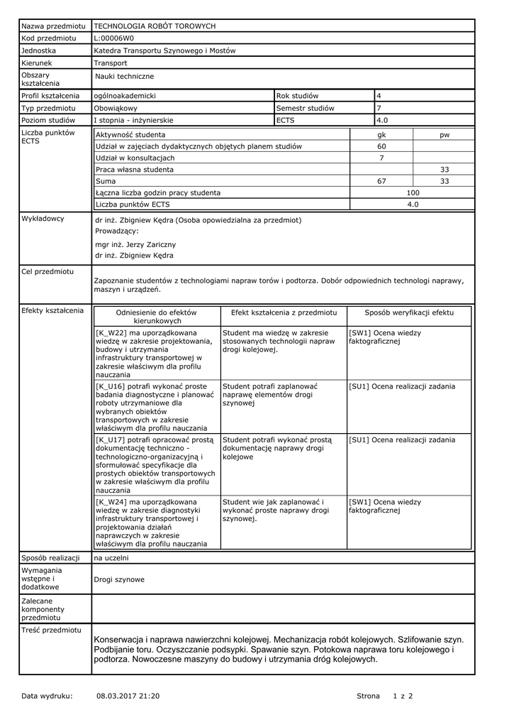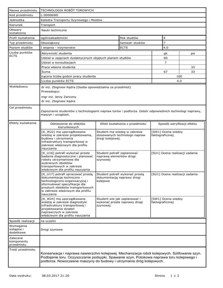 Nazwa przedmiotu TECHNOLOGIA ROBÓT TOROWYCH Kod przedmiotu L:00006W0 Jednostka Katedra Transportu Szynowego i Mostów Kierunek Transport Obszary kształcenia Nauki techniczne Profil kształcenia ogólnoakademicki Rok studiów 4 Typ przedmiotu Obowiąkowy Semestr studiów 7 Poziom studiów I stopnia - inżynierskie ECTS 4.0 Liczba punktów ECTS Aktywność studenta gk Udział w zajęciach dydaktycznych objętych planem studiów 60 Udział w konsultacjach pw 7 Praca własna studenta 33 Suma Wykładowcy 67 33 Łączna liczba godzin pracy studenta 100 Liczba punktów ECTS 4.0 dr inż. Zbigniew Kędra (Osoba opowiedzialna za przedmiot) Prowadzący: mgr inż. Jerzy Zariczny dr inż. Zbigniew Kędra Cel przedmiotu Zapoznanie studentów z technologiami napraw torów i podtorza. Dobór odpowiednich technologi naprawy, maszyn i urządzeń. Efekty kształcenia Odniesienie do efektów kierunkowych Efekt kształcenia z przedmiotu Sposób weryfikacji efektu [K_W22] ma uporządkowana wiedzę w zakresie projektowania, budowy i utrzymania infrastruktury transportowej w zakresie właściwym dla profilu nauczania Student ma wiedzę w zakresie stosowanych technologii napraw drogi kolejowej. [SW1] Ocena wiedzy faktograficznej [K_U16] potrafi wykonać proste badania diagnostyczne i planować roboty utrzymaniowe dla wybranych obiektów transportowych w zakresie właściwym dla profilu nauczania Student potrafi zaplanować naprawę elementów drogi szynowej [SU1] Ocena realizacji zadania [K_U17] potrafi opracować prostą dokumentację techniczno technologiczno-organizacyjną i sformułować specyfikacje dla prostych obiektów transportowych w zakresie właściwym dla profilu nauczania Student potrafi wykonać prostą dokumentację naprawy drogi kolejowe [SU1] Ocena realizacji zadania [K_W24] ma uporządkowana wiedzę w zakresie diagnostyki infrastruktury transportowej i projektowania działań naprawczych w zakresie właściwym dla profilu nauczania Student wie jak zaplanować i wykonać proste naprawy drogi szynowej. [SW1] Ocena wiedzy faktograficznej Sposób realizacji na uczelni Wymagania wstępne i dodatkowe Drogi szynowe Zalecane komponenty przedmiotu Treść przedmiotu Konserwacja i naprawa nawierzchni kolejowej. Mechanizacja robót kolejowych. Szlifowanie szyn. Podbijanie toru. Oczyszczanie podsypki. Spawanie szyn. Potokowa naprawa toru kolejowego i podtorza. Nowoczesne maszyny do budowy i utrzymania dróg kolejowych. Data wydruku: 08.03.2017 21:20 Strona 1 z 2 Zalecana lista lektur Literatura podstawowa Kędra Z.: Technologia robót torowych. Wydawnictwo Politechniki Gdańskiej, Gdańsk 2015. Literatura uzupełniająca Materiały informacyjne producentów maszyn torowych. Przepisy kolejowe. Formy zajęć i metody nauczania Forma zajęć Liczba godzin zajęć Suma godzin dydaktycznych w semestrze, objętych planem studiów Wykład Ćwiczenia Laboratorium Projekt Seminarium 30.0 0.0 15.0 15.0 0.0 60 W tym kształcenie na odległość: 0.0 Metody i kryteria oceniania Kryteria oceniania: składowe Próg zaliczeniowy Procent oceny końcowej 50.0 50.0 Laboratorium 100.0 20.0 Projekt 100.0 30.0 Egzamin Przykładowe zagadnienia / Przykładowe zadania / Realizowane zadania Język wykładowy polski Praktyki zawodowe Nie dotyczy Data wydruku: 08.03.2017 21:20 Strona 2 z 2