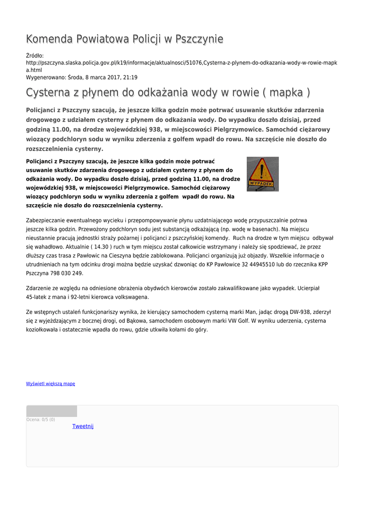 Komenda Powiatowa Policji w Pszczynie Źródło: http://pszczyna.slaska.policja.gov.pl/k19/informacje/aktualnosci/51076,Cysterna-z-plynem-do-odkazania-wody-w-rowie-mapk a.html Wygenerowano: Środa, 8 marca 2017, 21:19 Cysterna z płynem do odkażania wody w rowie ( mapka ) Policjanci z Pszczyny szacują, że jeszcze kilka godzin może potrwać usuwanie skutków zdarzenia drogowego z udziałem cysterny z płynem do odkażania wody. Do wypadku doszło dzisiaj, przed godziną 11.00, na drodze wojewódzkiej 938, w miejscowości Pielgrzymowice. Samochód ciężarowy wiozący podchloryn sodu w wyniku zderzenia z golfem wpadł do rowu. Na szczęście nie doszło do rozszczelnienia cysterny. Policjanci z Pszczyny szacują, że jeszcze kilka godzin może potrwać usuwanie skutków zdarzenia drogowego z udziałem cysterny z płynem do odkażania wody. Do wypadku doszło dzisiaj, przed godziną 11.00, na drodze wojewódzkiej 938, w miejscowości Pielgrzymowice. Samochód ciężarowy wiozący podchloryn sodu w wyniku zderzenia z golfem wpadł do rowu. Na szczęście nie doszło do rozszczelnienia cysterny. Zabezpieczanie ewentualnego wycieku i przepompowywanie płynu uzdatniającego wodę przypuszczalnie potrwa jeszcze kilka godzin. Przewożony podchloryn sodu jest substancją odkażającą (np. wodę w basenach). Na miejscu nieustannie pracują jednostki straży pożarnej i policjanci z pszczyńskiej komendy. Ruch na drodze w tym miejscu odbywał się wahadłowo. Aktualnie ( 14.30 ) ruch w tym miejscu został całkowicie wstrzymany i należy się spodziewać, że przez dłuższy czas trasa z Pawłowic na Cieszyna będzie zablokowana. Policjanci organizują już objazdy. Wszelkie informacje o utrudnieniach na tym odcinku drogi można będzie uzyskać dzwoniąc do KP Pawłowice 32 44945510 lub do rzecznika KPP Pszczyna 798 030 249. Zdarzenie ze względu na odniesione obrażenia obydwóch kierowców zostało zakwalifikowane jako wypadek. Ucierpiał 45-latek z mana i 92-letni kierowca volkswagena. Ze wstępnych ustaleń funkcjonariszy wynika, że kierujący samochodem cysterną marki Man, jadąc drogą DW-938, zderzył się z wyjeżdzającym z bocznej drogi, od Bąkowa, samochodem osobowym marki VW Golf. W wyniku uderzenia, cysterna koziołkowała i ostatecznie wpadła do rowu, gdzie utkwiła kołami do góry. Wyświetl większą mapę Ocena: 0/5 (0) Tweetnij