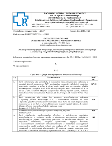 RADOMSKI SZPITAL SPECJALISTYCZNY im. Dr Tytusa Chałubińskiego 26-610 Radom, ul. Tochtermana 1 Dział Zamówień Publicznych Funduszy Strukturalnych i Zaopatrzenia www.szpital.radom.pl; [email protected] NIP: 796-00-12-187 tel.: (048) 361-52-85, 361-52-84 REGON: 000315086 fax.: (048) 361-52-13 Centralny nr postępowania: /2010 Radom, dnia 2010.11.25 Znak sprawy: RSS/ZPFSiZ/P-93/…../2010 OGŁOSZENIE O ZMIANIE OGŁOSZENIA O PRZETRARGU NIEOGRANICZONYM o wartości poniżej 193 000 Euro (tablica ogłoszeń, strona internetowa) Na zakup i dostawę sprzętu medycznego jednorazowego dla potrzeb Oddziału Anestezjologii i Intensywnej Terapii Radomskiego Szpitala Specjalistycznego: informacje o zmianie ogłoszenia o przetargu nieograniczonym z dn. 09.11.2010r., Nr 363600 – 2010 Zmiany w ogłoszeniu: I. W ogłoszeniu jest: (….) Lp. 1. 2. 3. 4. Część nr 9 – Sprzęt do utrzymywania drożności oddechowej Nazwa towaru Rurki intubacyjne dla dorosłych, z mankietem niskociśnieniowym wykonane z wysokiej jakości medycznego PCV, posiadające znacznik głębokości, podwójne oznaczenie rozmiaru w dolnej i górnej części rurki oraz na łączniku, gładkie atraumatyczne krawędzie, linia RTG na całej długości rurki, skalowana co 1 cm lub co 2 cm z oczkiem Marphy. Zdejmowany mleczny łącznik 15mm, niebieski balonik kontrolny uszczelnienia. Rozmiar 2,5 do 10 co pół lub rozmiar 3,0 do 10 co pół. Rurki intubacyjne dla dzieci bez mankietu uszczelniającego wykonane z wysokiej jakości medycznego PCV, z oznaczeniem rozmiaru na rurce i łączniku, gładkie atraumatyczne krawędzie, linia RTG na całej długości rurki, skalowana co 1 cm lub co 2 cm..Zdejmowany mleczny łącznik 15mm. Z oczkiem Marphy. Czarny znacznik głębokości na końcu rurki. Rozmiary 2 /2,5 /3 /3,5 / 4/ Maski krtaniowe jednokrotnego użytku do wentylacji pacjenta Rozmiar 3;4;5 Rurki intubacyjne tracheostomijne zbrojone z pojedynczym mankietem uszczelniającym, z ruchomą rączką o obrotowym mechanizmie blokującym umożliwiającym płynną regenerację położenia, o przedłużonej długości we wszystkich rozmiarach, wstępnie uformowana, wygięta łukowato, z cienkościennym mankietem niskociśnieniowym, z delikatnym zaokrąglonym zakończeniem rurki, grubość ścianki nie większa niż 1,4 mm we wszystkich rozmiarach o zwiększonej elastyczności. W zestawie opaska mocująca oraz prowadnik – intubator ułatwiający wprowadzenie rurki. Rozmiary 7,5 / 8,5/ 9,5/ Ilość szt. 16 740 620 100 160 5. 6. 7. 8. 9. 10. 10,5/ Lub Rurki tracheostomijne zbrojone z pojedynczym mankietem uszczelniającym, z ruchomym kołnierzem o obrotowym mechanizmie blokującym umożliwiającym płynną regenerację położenia, o przedłużonej długości we wszystkich rozmiarach, wstępnie uformowana, wygięta łukowato, z cienkościennym mankietem niskociśnieniowym, z delikatnym zaokrąglonym zakończeniem rurki, o zwiększonej elastyczności. W zestawie opaska mocująca oraz prowadnik – intubator ułatwiający wprowadzenie rurki. Rozmiary od 6 do 11 co jeden. Zestaw do tracheostomi przezskórnej z obrotowym, śrubowym dilatatorem. Rozmiar: 7 /8 /9 zakr. nr 11 Lub Tracheostomia przezskórna metodą TLT, w rozm. 7,5 ; 8,5 ; 9,5 Rurka odoskrzelowa dwuświatłowa z dwoma niskociśnieniowymi mankietami uszczelniającymi, bezbarwnym dotchawicznym, z bezbarwnym balonikiem kontrolnym oraz niebieskim oskrzelowym, z niebieskim balonikiem kontrolnym. Rurka wykonana z PCV, bez lateksu z prowadnicą ze stoperem. Zestaw: 2 podwójnie –obrotowe łączniki, każdy z podwójnym uszczelnieniem umożliwiającym bronchoskopię, łącznik Y, 2 cewniki do odsysania z kontrolą siły ssania. Prawa i Lewa lub Prawa. Rozmiar 26 /28 /35 /37 /39 /41 Lub Rurki dooskrzelowe dwuświatłowe z dwoma niskociśnieniowymi mankietami uszczelniającymi, bezbarwnym dotchawicznym, z bezbarwnym balonikiem kontrolnym oraz niebieskim oskrzelowym, z niebieskim balonikiem kontrolnym. Rurka wykonana z PCV, bez lateksu z prowadnicą. Zestaw: 2 podwójnie – obrotowe łączniki, każdy z uszczelnieniem umożliwiającym bronchoskopię, łącznik Y, 2 cewniki do odsysania z kontrolą siły ssania. Prawa i Lewa lub Prawa. Rozmiar /35/ 37/ 39/ 41 Rurki ustno – gardłowe Guedela sterylne z kolorowym oznaczeniem rozmiaru . Zakres rozmiarów 000 do 5 Rurki tracheostomijne z pojedynczym mankietem uszczelniającym z ruchomą ramką sterylną o regulowanym, nieskokowym położeniu, delikatne zaokrąglone zakończenie rurki, łagodne połączenie drenu balonika kontrolnego z rurką. Wykonana z medycznej odmiany polichlorku winylu, czytelny rozmiar, delikatny mankiet niskociśnieniowy, znacznik RTG. Rozmiary od 7,0 do 11,0 co jeden Lub Rurki tracheostomijne z pojedynczym mankietem uszczelniającym z ruchomą ramką sterylną o regulowanym położeniu, delikatne zaokrąglone zakończenie rurki, łagodne połączenie drenu balonika kontrolnego z rurką. Wykonana z medycznej odmiany polichlorku winylu, czytelny rozmiar, delikatny mankiet niskociśnieniowy, znacznik RTG. Rozmiary od 7,0 do 10,0 co jeden. Rurka tracheostomijna foniatryczna bez balonu posiadająca: rurkę tracheostomijną, 2 wymienne kaniule różnego koloru, opaska mocująca, zastawki antykaszlowe, zastawki fonacyjne. Rozmiary 4,0 do 13,0 co jeden Lub Rurki tracheostomijne foniatryczne bez balonu posiadające: rurkę tracheostomijną,2 wymienne kaniule, opaskę mocującą. Rozmiary 4,0 /6,0 /8,0 /10,0 Rurka tracheostomijna z mankietem niskociśnieniowym. Wykonana z termoplastycznego PCV anatomicznie ukształtowana zintegrowany obrotowy łącznik przezroczysta ramka do mocowania rurki, znacznik RTG na całej długości rurki. Bez lateksu, sterylna pakowana pojedynczo 60 120 2 600 320 130 1 290 z zaworem do strzykawki Luer-lock .Może być używany z kaniulą wewnętrzną. Rozmiar od 3,5 do 10 co pół. Lub Rurki tracheostomijne z mankietem niskociśnieniowym. Wykonana z termoplastycznego PCV anatomicznie ukształtowana z przez