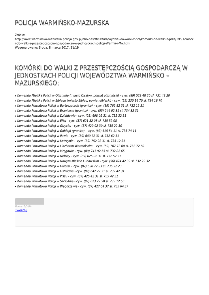 POLICJA WARMIŃSKO-MAZURSKA Źródło: http://www.warminsko-mazurska.policja.gov.pl/ol/o-nas/struktura/wydzial-do-walki-z-prz/komorki-do-walki-z-prze/195,Komork i-do-walki-z-przestepczoscia-gospodarcza-w-jednostkach-policji-Warmii-i-Ma.html Wygenerowano: Środa, 8 marca 2017, 21:19 KOMÓRKI DO WALKI Z PRZESTĘPCZOŚCIĄ GOSPODARCZĄ W JEDNOSTKACH POLICJI WOJEWÓDZTWA WARMIŃSKO – MAZURSKIEGO: ● Komenda Miejska Policji w Olsztynie (miasto Olsztyn, powiat olsztyński) - cyw. (89) 522 48 20 sł. 731 48 20 ● Komenda Miejska Policji w Elblągu (miasto Elbląg, powiat elbląski) - cyw. (55) 230 16 70 sł. 734 16 70 ● Komenda Powiatowa Policji w Bartoszycach (granica) – cyw. (89) 762 82 31 sł. 732 12 31 ● Komenda Powiatowa Policji w Braniewie (granica) - cyw. (55) 244 02 31 sł. 734 32 31 ● Komenda Powiatowa Policji w Działdowie - cyw. (23) 698 02 31 sł. 732 32 31 ● Komenda Powiatowa Policji w Ełku - cyw. (87) 621 82 08 sł. 735 52 08 ● Komenda Powiatowa Policji w Giżycku - cyw. (87) 429 92 30 sł. 735 22 30 ● Komenda Powiatowa Policji w Gołdapi (granica) - cyw. (87) 615 54 11 sł. 735 74 11 ● Komenda Powiatowa Policji w Iławie - cyw. (89) 640 72 31 sł. 732 62 31 ● Komenda Powiatowa Policji w Ketrzynie - cyw. (89) 752 92 31 sł. 735 12 31 ● Komenda Powiatowa Policji w Lidzbarku Warmińskim - cyw. (89) 767 72 60 sł. 732 72 60 ● Komenda Powiatowa Policji w Mrągowie - cyw. (89) 741 92 65 sł. 732 82 65 ● Komenda Powiatowa Policji w Nidzicy - cyw. (89) 625 02 31 sł. 732 52 31 ● Komenda Powiatowa Policji w Nowym Mieście Lubawskim - cyw. (56) 474 42 32 sł. 732 22 32 ● Komenda Powiatowa Policji w Olecku - cyw. (87) 520 72 23 sł. 735 32 23 ● Komenda Powiatowa Policji w Ostródzie - cyw. (89) 642 72 31 sł. 732 42 31 ● Komenda Powiatowa Policji w Piszu - cyw. (87) 425 42 31 sł. 735 42 31 ● Komenda Powiatowa Policji w Szczytnie - cyw. (89) 623 22 50 sł. 733 12 50 ● Komenda Powiatowa Policji w Węgorzewie - cyw. (87) 427 04 37 sł. 735 64 37 Ocena: 0/5 (0) Tweetnij
