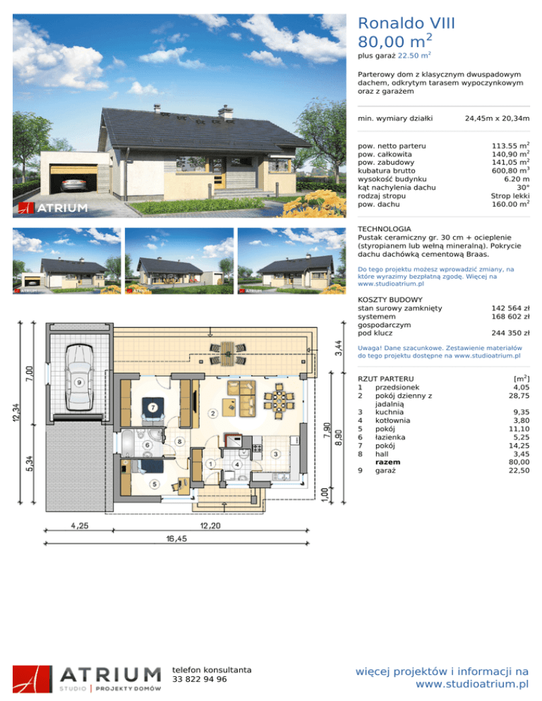 Ronaldo VIII 80,00 m2 plus garaż 22.50 m2 Parterowy dom z klasycznym dwuspadowym dachem, odkrytym tarasem wypoczynkowym oraz z garażem min. wymiary działki pow. netto parteru pow. całkowita pow. zabudowy kubatura brutto wysokość budynku kąt nachylenia dachu rodzaj stropu pow. dachu 24,45m x 20,34m 113.55 m2 140,90 m2 141,05 m2 600,80 m3 6.20 m 30° Strop lekki 160.00 m2 TECHNOLOGIA Pustak ceramiczny gr. 30 cm + ocieplenie (styropianem lub wełną mineralną). Pokrycie dachu dachówką cementową Braas. Do tego projektu możesz wprowadzić zmiany, na które wyrazimy bezpłatną zgodę. Więcej na www.studioatrium.pl KOSZTY BUDOWY stan surowy zamknięty systemem gospodarczym pod klucz 142 564 zł 168 602 zł 244 350 zł Uwaga! Dane szacunkowe. Zestawienie materiałów do tego projektu dostępne na www.studioatrium.pl RZUT PARTERU 1 przedsionek 2 pokój dzienny z jadalnią 3 kuchnia 4 kotłownia 5 pokój 6 łazienka 7 pokój 8 hall razem 9 garaż telefon konsultanta 33 822 94 96 Powered by TCPDF (www.tcpdf.org) [m2] 4,05 28,75 9,35 3,80 11,10 5,25 14,25 3,45 80,00 22,50 więcej projektów i informacji na www.studioatrium.pl