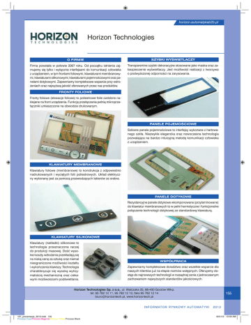 horizon.automatykab2b.pl Horizon Technologies O FIRMIE SZYBKI WYŚWIETLACZY Firma powstała w połowie 2007 roku. Od początku istnienia zajmujemy się tylko i wyłącznie interfejsami do komunikacji człowieka z urządzeniem, w tym frontami foliowymi, klawiaturami membranowymi, klawiaturami silikonowymi, klawiaturami pojemnościowymi oraz panelami dotykowymi. Zapewniamy kompleksowe wsparcie przy wdrożeniach oraz najwyższą jakość oferowanych przez nas produktów. Transparentne szybki dekoracyjne stosowane jako maska oraz zabezpieczenie wyświetlaczy. Jest możliwość realizacji z tworzywa o podwyższonej odporności na zarysowania. FRONTY FOLIOWE Fronty foliowe (elewacje foliowe) to poliestrowe folie ozdobne naklejane na front urządzenia. Funkcję przełączania pełnią mikroprzełączniki umieszczone na obwodzie drukowanym. PANELE POJEMOŚCIOWE Szklane panele pojemnościowe to interfejsy wykonane z hartowanego szkła. Niezwykle elegancka oraz nowoczesna technologia pozwalająca na bardzo intuicyjną metodę komunikacji człowieka z urządzeniem. KLAWIATURY MEMBRANOWE Klawiatury foliowe (membranowe) to konstrukcja z odpowiednio nadrukowanych i wyciętych folii poliestrowych. Układ elektryczny wykonany jest za pomocą przewodzących lakierów ze srebra. PANELE DOTYKOWE Rezystancyjne panele dotykowe wkomponowane (przylaminowane) do klawiatur membranowych to w pełni hermetyczne i funkcjonalne połączenie technologii dotykowej ze standardową klawiaturą. KLAWIATURY SILIKONOWE Klawiatury (nakładki) silikonowe to technologia przeznaczona raczej do produkcji masowej. Dość wysokie koszty wdrożenia przekładają się na niską cenę za sztukę oraz niemal nieograniczone możliwości kształtu i wykończenia klawiszy. Technologia charakteryzuje się wysoką wytrzymałością mechaniczną oraz ciekawymi możliwościami podświetlania. WSPÓŁPRACA Zapewniamy kompleksowe doradztwo oraz wszelkie wsparcie dla naszych klientów już na etapie rozmów wstępnych. Oferujemy dostęp do najnowszych technologii w rozsądnej cenie z jednoczesnym zachowaniem najwyższych standardów jakościowych. Horizon Technologies Sp. z o.o., ul. Walczaka 25, 66-400 Gorzów Wlkp. tel. 95 782 12 11, 95 782 12 12, faks 95 782 12 14 [email protected], www.horizontech.pl I N F O R M AT O R R Y N KO W Y AU T O M AT Y K I 121_prezentacje_2013.indd 155 Process CyanProcess MagentaProcess YellowProcess Black 155 2013 8/31/12 12:59 AM