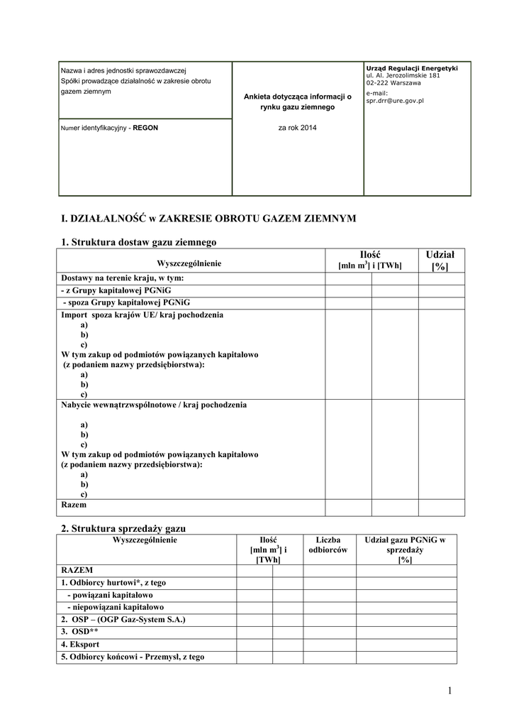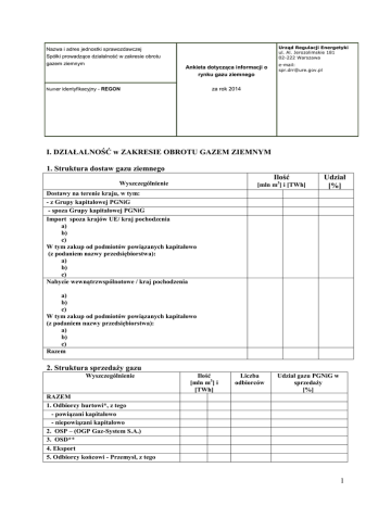 Nazwa i adres jednostki sprawozdawczej Spółki prowadzące działalność w zakresie obrotu gazem ziemnym Urząd Regulacji Energetyki ul. Al. Jerozolimskie 181 02-222 Warszawa Ankieta dotycząca informacji o rynku gazu ziemnego e-mail: [email protected] za rok 2014 Numer identyfikacyjny - REGON I. DZIAŁALNOŚĆ w ZAKRESIE OBROTU GAZEM ZIEMNYM 1. Struktura dostaw gazu ziemnego Ilość Wyszczególnienie [mln m3] i [TWh] Udział [%] Dostawy na terenie kraju, w tym: - z Grupy kapitałowej PGNiG - spoza Grupy kapitałowej PGNiG Import spoza krajów UE/ kraj pochodzenia a) b) c) W tym zakup od podmiotów powiązanych kapitałowo (z podaniem nazwy przedsiębiorstwa): a) b) c) Nabycie wewnątrzwspólnotowe / kraj pochodzenia a) b) c) W tym zakup od podmiotów powiązanych kapitałowo (z podaniem nazwy przedsiębiorstwa): a) b) c) Razem 2. Struktura sprzedaży gazu Wyszczególnienie Ilość [mln m3] i [TWh] Liczba odbiorców Udział gazu PGNiG w sprzedaży [%] RAZEM 1. Odbiorcy hurtowi*, z tego - powiązani kapitałowo - niepowiązani kapitałowo 2. OSP – (OGP Gaz-System S.A.) 3. OSD** 4. Eksport 5. Odbiorcy końcowi - Przemysł, z tego 1 odbiorcy (o zużyciu do2,5 mln m3/rok) odbiorcy (o zużyciu powyżej 2,5 mln m3do 25 mln m3 /rok) odbiorcy (o zużyciu powyżej 25 mln m3 /rok) 6. Odbiorcy końcowi - handel i usługi, z tego odbiorcy (o zużyciu do 2,5 mln m3/rok) odbiorcy (o zużyciu od 2,5 mln m3do 25 mln m3 /rok) odbiorcy (o zużyciu powyżej 25 mln m3 /rok) 7. Gospodarstwa domowe * Odbiorcy kupujący w celu dalszej odsprzedaży **sprzedaż wyłącznie na potrzeby prowadzenia działalności dystrybucyjnej. 3. Struktura zakupu gazu Ilość Wyszczególnienie [mln m3] i [TWh] 1. Z systemu: a) gaz ziemny wysokometanowy b) gaz ziemny zaazotowany (w przeliczeniu na gaz wysokometanowy) 2. Ze złóż lokalnych: a) gaz ziemny wysokometanowy b) gaz ziemny zaazotowany (w przeliczeniu na gaz wysokometanowy) 3. LNG [ t ] 4. W kontraktach a) krótkoterminowych (do 1 roku) c) długoterminowych (powyżej 1 roku) d) poprzez TGE Udział gazu zakupionego od PGNiG [%] ---------------- 4. Struktura sprzedaży Wyszczególnienie Ilość [mln m3] i [TWh] Sprzedaż CNG Sprzedaż LNG (Liquefied Natural Gas) [ t ] a) do dalszej odsprzedaży b) do odbiorców końcowych Sprzedaż gazu bez wykorzystania własnej infrastruktury Sprzedaż gazu z wykorzystaniem własnej infrastruktury 5. Kontrakty na sprzedaż gazu Wyszczególnienie Ilość [mln m3] i [TWh] 1. poprzez rynek OTC: a) kontrakty SPOT (do 1 tygodnia) 2 b) terminowe: - krótsze niż roczne - roczne i dłuższe 2. poprzez TGE: a) kontrakty SPOT b) terminowe: - krótsze niż roczne - roczne i dłuższe Razem 6. Czy spółka podczas prowadzonej działalności korzystała z zasady TPA (dostępu strony trzeciej) do gazociągów? II. DZIAŁALNOŚĆ w ZAKRESIE DYSTRYBUCJI GAZU ZIEMNEGO 7. Charakterystyka techniczna w zakresie prowadzonej działalności dystrybucyjnej (wypełniają spółki posiadające koncesję dystrybucyjną) Ilość Wyszczególnienie Długość sieci gazowej dystrybucyjnej [km] – na początek okresu sprawozdawczego Długość sieci gazowej dystrybucyjnej [km] – na koniec roku sprawozdawczego Ilość gazu wprowadzanego do systemu - wysokometanowego [mln m3] i [TWh] - zaazotowanego [mln m3] i [TWh] Wielkość popytu szczytowego [mln m3 dobę] i [TWh/day] Potrzeby technologiczne [mln m3/dobę] i [TWh/day] 8. Potrzeby własne, straty, różnica bilansowa Wyszczególnienie Ilość [mln m3] i [TWh] Zużycie własne Straty Różnica bilansowa imię, nazwisko osoby, która sporządziła sprawozdanie nr telefonu, adres e-mail miejscowość i data podpis osoby działającej w imieniu sprawozdawcy UWAGI: gaz ziemny – gaz ziemny wysokometanowy oraz zaazotowany w przeliczeniu na gaz ziemny wysokometanowy o cieple spalania 39,5 MJ/m3 m3 (metr sześcienny normalny) – jednostka rozliczeniowa oznaczająca ilość suchego gazu zawartą w objętości 1 m3 przy ciśnieniu 101,325kPa i temperaturze 0 oC. 3