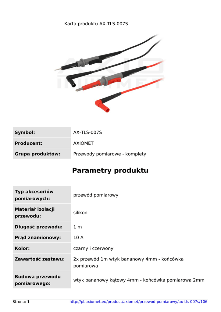Karta produktu AX-TLS-007S Symbol: AX-TLS-007S Producent: AXIOMET Grupa produktów: Przewody pomiarowe - komplety Parametry produktu Typ akcesoriów pomiarowych: Materiał izolacji przewodu: przewód pomiarowy silikon Długość przewodu: 1m Prąd znamionowy: 10 A Kolor: czarny i czerwony Zawartość zestawu: 2x przewód 1m wtyk bananowy 4mm - końcówka pomiarowa Budowa przewodu pomiarowego: Strona: 1 wtyk bananowy kątowy 4mm - końcówka pomiarowa 2mm http://pl.axiomet.eu/product/axiomet/przewod-pomiarowy/ax-tls-007s/106 Karta produktu AX-TLS-007S Zgodność z normą: EN61010 1000V CAT II, EN61010 1000V CAT III, EN61010 600V CAT IV Informacje dodatkowe Masa brutto: Strona: 2 0,092 kg http://pl.axiomet.eu/product/axiomet/przewod-pomiarowy/ax-tls-007s/106