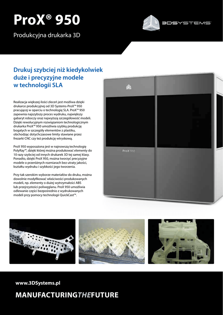 ProX® 950 Produkcyjna drukarka 3D Drukuj szybciej niż kiedykolwiek duże i precyzyjne modele w technologii SLA Realizacja większej ilości zleceń jest możliwa dzięki drukarce produkcyjnej od 3D Systems-ProX™ 950 pracującej w oparciu o technologię SLA. ProX™ 950 zapewnia najszybszy proces wydruku, największy gabaryt roboczy oraz najwyższą szczegółowość modeli. Dzięki rewolucyjnym rozwiązaniom technologicznym drukarka ProX™ 950 umożliwia szybką produkcję bogatych w szczegóły elementów z plastiku, obchodząc dotychczasowe limity stawiane przez frezarki CNC czy też produkcję wtryskową. ProX 950 wyposażona jest w najnowszą technologię PolyRay™, dzięki której można produkować elementy do 10 razy szybciej od innych drukarek 3D tej samej klasy. Ponadto, dzięki ProX 950, można tworzyć precyzyjne modele o przeróżnych rozmiarach bez utraty jakości, kształtu wydruku i szybkości jego tworzenia. Przy tak szerokim wyborze materiałów do druku, można dowolnie modyfikować właściwości produkowanych modeli, np. elementy o dużej wytrzymałości ABS lub przejrzystości poliwęglanu. ProX 950 umożliwia odlewanie części bezpośrednio z wydrukowanych modeli przy pomocy technologii QuickCast™. www.3DSystems.pl manufacturingthefuture ProX® 950 Produkcyjna drukarka 3D ProX 950 Technologia PolyRay Lasery Długość fali Moc (nominalna) – na głowicy Gwarancja lasera Zephyr system uzupełniania żywic Metoda Regulacja Grubość warstwy ProScan System skanowania Punkt skanowania krawędzi (średnica na poziomie 1/e2) Duży obiekt skanowania Max. prędkość skanowania obiektu* Skanowanie krawędzi Skanowanie dużego obiektu Stała potrójna częstotliwość fali lasera Nd: YVO4 z SteadyPower 354.7 nm 1450 mW (1000 mW na powierzchni żywicy przy nominalnej formie ścieżki optycznej) 10.000 godzin lub 18 miesięcy (którekolwiek nastąpi pierwsze), wymiana przy 800 mW Ruchome ostrze Samo poziomowanie, samo korygowanie min. 0.05 mm, max. 0.15 mm Standardowy tryb o nominale 0.13 mm Wartość nominalna 0.76 mm 3.5 m/sek 25 m/sek Najwyższa dokładność druku oraz największy wybór materiałów w tej klasie drukarek • Największe modele na rynku – możliwość produkcji największych brył (do 1,5 m) bez potrzeby ich sklejania czy też montażu pojedynczych elementów. • Szybki druk – teraz możesz wydrukować pełnowymiarową deskę rozdzielczą auta w zaledwie 2 dni. • Dokładność druku – dzięki ProX 950 wyprodukujesz części w wielu rozmiarach, o najwyższej szczegółowości. • Dowolność w wyborze materiału – ProX 950 oferuje szeroki wybór materiałów używanych do druku, teraz możesz dobrać odpowiedni materiał do wymogów produkcji. Obszar zadruku RDM 950 (ProX 950) Max. waga modelu 1500 x 750 x 550 mm 150 kg Pobór mocy 200-240 VAC 50/60Hz, jednofazowe, 50A Środowisko pracy** Zakres temperatury Max. zmiana temperatury Średnia wilgotność 20-26 °C 1°C/godzina 20-50% bez skraplania Zapotrzebowanie na miejsce Rozmiar (WxDxH) Waga, w opakowaniu bez modułu RDM 220 x 160 x 226 cm 2404 kg • Technologia PolyRay dla uzyskania najlepszej jakości, precyzji oraz szybkości wydruku. Możliwa ręczna wymiana kosza ProCure™ 1500 UV Finisher Roczna gwarancja, przy zachowaniu warunków użytkowania ustalonych przez 3D Systems • Produkcja elementów do 10 razy szybsza niż jakakolwiek inna drukarka tej klasy na rynku. Dodatki Kosz ze zmiennymi tacami roboczymi Obróbka postprodukcyjna Gwarancja systemu System operacyjny i kontroli Narzędzia programowe System operacyjny Format plików Typ i protokół sieci • Duża wydajność druku – teraz możesz drukować wydajniej – minimalne straty oraz wysoki stopień odzysku materiałów. Cechy: Oprogramowanie 3DPrint™ and 3D Manage™ Windows® 7 lub Windows® 8 .stl, .slc Ethernet, IEEE 802.3 przy użyciu TCP/IP oraz NFS • Drukarka ProX950 zapewnia minimalną ilość odpadów produkcyjnych. Jest przyjazna środowisku i ekonomiczna w użytkowaniu. • Największy obszar roboczy, możliwość produkcji największych o najbardziej złożonych geometriach elementów. *zależne od kształtu modelu, parametrów budowy oraz wybranego materiału budulcowego SL **bardziej szczegółowy opis dostępny na stronie 3D Systems wymagania dot. pomieszczenia w którym będzie przebywać urządzenie (FGR) Stereolitografia (SLA) Jest to metoda przyrostowego budowania brył przy zastosowaniu wanny wypełnionej fotopolimerową żywicą, która pod wpływem lasera UV jest utwardzana warstwa po warstwie. Dla każdej warstwy promień lasera podąża za ustalonym kształtem na powierzchni ciekłej żywicy. Wystawiona na promieniowanie UV żywica jest utwardzana na powierzchni poprzedniej warstwy. Gdy forma jednej z warstw zostaje utwardzona, taca robocza obniża się o wartość grubości pojedynczej warstwy. Wypełniona żywicą dysza omiata powstałą warstwę, dodając świeżego materiału. Na tą nową płynną powierzchnię nanoszona jest kolejna warstwa, jednocześnie zespalana z poprzednią. W tym procesie formowana jest kompletna bryła 3D. 3D Lab s.c. Autoryzowane przedstawicielstwo w Polsce www.3DSystems.pl Zapewnienie/Zastrzeżenie: Parametry użytkowe tych produktów mogą się różnić w zależności od zastosowania produktu, warunków eksploatacji, materiałów, z którymi je połączono, lub od końcowego wykorzystania. 3D Systems nie udziela żadnych zapewnień, w sposób wyraźny ani dorozumiany, w tym między innymi co do gwarancji dopuszczenia do obrotu ani przydatności do określonego użytku. © 2014 przez 3D Systems, Inc. Wszystkie prawa zastrzeżone. Specyfikacje mogą ulec zmianie bez uprzedzenia. ProX ProX,jest VisiJet, znakiem 3D Systems towarowym są znakami a logotowarowymi 3D Systems i stylizowaa logo 3D ny tekst są Systems i stylizowany zarejestrowanymi tekst sąznakami zarejestrowanymi towarowymi znakami 3D Systems towarowymi Inc. 3D Systems Inc.