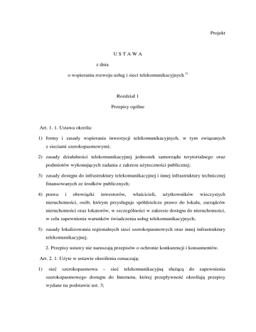 Projekt USTAWA z dnia o wspieraniu rozwoju usług i sieci telekomunikacyjnych 1) Rozdział 1 Przepisy ogólne Art. 1. 1. Ustawa określa: 1) formy i zasady wspierania inwestycji telekomunikacyjnych, w tym związanych z sieciami szerokopasmowymi; 2) zasady działalności telekomunikacyjnej jednostek samorządu terytorialnego oraz podmiotów wykonujących zadania z zakresu użyteczności publicznej; 3) zasady dostępu do infrastruktury telekomunikacyjnej i innej infrastruktury technicznej finansowanych ze środków publicznych; 4) prawa i obowiązki inwestorów, właścicieli, użytkowników wieczystych nieruchomości, osób, którym przysługuje spółdzielcze prawo do lokalu, zarządców nieruchomości oraz lokatorów, w szczególności w zakresie dostępu do nieruchomości, w celu zapewnienia warunków świadczenia usług telekomunikacyjnych; 5) zasady lokalizowania regionalnych sieci szerokopasmowych oraz innej infrastruktury telekomunikacyjnej. 2. Przepisy ustawy nie naruszają przepisów o ochronie konkurencji i konsumentów. Art. 2. 1. Użyte w ustawie określenia oznaczają: 1) sieć szerokopasmowa – sieć telekomunikacyjną służącą do zapewnienia szerokopasmowego dostępu do Internetu, której przepływność określają przepisy wydane na podstawie ust. 3; 2) regionalna sieć szerokopasmowa – sieć szerokopasmową realizowaną przez samorząd województwa lub porozumienie jednostek samorządu terytorialnego na podstawie projektów indywidualnych w ramach programów operacyjnych; 3) podmiot wykonujący zadania z zakresu użyteczności publicznej – przedsiębiorstwo energetyczne w rozumieniu ustawy z dnia 10 kwietnia 1997 r. – Prawo energetyczne (Dz. U. z 2006 r. Nr 89, poz. 625, z późn. zm.2)) prowadzące działalność gospodarczą w zakresie przesyłania, dystrybucji paliw lub energii oraz przedsiębiorstwo wodociągowo-kanalizacyjne w rozumieniu ustawy z dnia 7 czerwca 2001 r. o zbiorowym zaopatrzeniu w wodę i zbiorowym odprowadzaniu ścieków (Dz. U. z 2006 r. Nr 123, poz. 858, z późn. zm.3)), będące jednostkami sektora finansów publicznych lub nadzorowane przez takie jednostki; 4) infrastruktura telekomunikacyjna o nieznacznym oddziaływaniu – kanalizację kablową, linię kablową podziemną, instalację radiokomunikacyjną wraz z konstrukcją wsporczą do wysokości 5 metrów, szafy i słupki telekomunikacyjne oraz inne podobne urządzenia i obiekty, a także związany z nimi osprzęt i urządzenia zasilające, jeżeli nie są zaliczone do przedsięwzięć mogących znacząco oddziaływać na środowisko lub nie stanowią przedsięwzięć mogących znacząco oddziaływać na obszary Natura 2000. 2. Ilekroć w ustawie są używane określenia zdefiniowane w art. 2 ustawy z dnia 16 lipca 2004 r. – Prawo telekomunikacyjne (Dz. U. Nr 171, poz. 1800, z późn. zm.4)), określenia te należy rozumieć w znaczeniu tam przyjętym. 3. Minister właściwy do spraw łączności określi, w drodze rozporządzenia, nie rzadziej niż raz na trzy lata, minimalną przepływność łączy w sieci służącej do zapewnienia szerokopasmowego dostępu do Internetu, biorąc pod uwagę poziom rozwoju telekomunikacji i konieczność stymulowania tego rozwoju, a także zaspokojenie potrzeb użytkowników końcowych. Dostęp określa się jako szerokopasmowy, jeżeli wydajność łącza nie jest czynnikiem ograniczającym możliwość uruchomienia aplikacji dostępnych w sieci. 2 Rozdział 2 Działalność w telekomunikacji jednostek samorządu terytorialnego i podmiotów wykonujących zadania z zakresu użyteczności publicznej oraz zasady dostępu do infrastruktury telekomunikacyjnej i innej infrastruktury technicznej finansowanych ze środków publicznych Art. 3. 1. Jednostka samorządu terytorialnego może w celu zaspokajania zbiorowych potrzeb wspólnoty samorządowej: 1) budować lub eksploatować infrastrukturę telekomunikacyjną i sieci telekomunikacyjne oraz nabywać prawa do infrastruktury telekomunikacyjnej i sieci telekomunikacyjnych; 2) dostarczać sieci telekomunikacyjne lub zapewniać dostęp do infrastruktury telekomunikacyjnej; 3) świadczyć, z wykorzystaniem posiadanej infrastruktury telekomunikacyjnej i sieci telekomunikacyjnych, usługi na rzecz: a) przedsiębiorców telekomunikacyjnych, b) podmiotów, o których mowa w art. 4 pkt 1, 2, 4, 5 i 8 ustawy z dnia 16 lipca 2004 r. – Prawo telekomunikacyjne, c) użytkowników końcowych – w zakresie i na warunkach określonych w art. 6 i 7. 2. Działalność, o której mowa w ust. 1, wykonuje się: 1) przy zachowaniu spójności z innymi sieciami telekomunikacyjnymi tworzonymi przez podmioty publiczne lub finansowanymi ze środków publicznych w rozumieniu przepisów o finansach publicznych oraz zagwarantowaniu, na zasadach równego traktowania, współkorzystania z infrastruktury telekomunikacyjnej i sieci telekomunikacyjnych oraz dostępu do nich dla przedsiębiorców telekomunikacyjnych; 2) w sposób przejrzysty i niezakłócający rozwoju równoprawnej i skutecznej konkurencji na rynkach telekomunikacyjnych; 3) przy uwzględnieniu w możliwie najszerszym zakresie Komunikatu Komisji – Wytyczne wspólnotowe w sprawie stosowania przepisów dotyczących pomocy 3 państwa w odniesieniu do szybkiego wdrażania sieci szerokopasmowych (Dz. Urz. UE C 235 z 30.09.2009, str. 7). 3. Przy wykonywaniu działalności, o której mowa w ust. 1, mają zastosowanie przepisy o pomocy publicznej. 4. Działalność, o której mowa w ust. 1, należy do zadań własnych jednostki samorządu terytorialnego. 5. Jednostka samorządu terytorialnego wykonuje działalność, o której mowa w ust. 1, na podstawie uchwały organu stanowiącego. 6. Informację o podjęciu działalności, o której mowa w ust. 1, ogłasza się na stronie internetowej jednostki samorządu terytorialnego i w siedzibie tej jednostki oraz przekazuje Prezesowi Urzędu Komunikacji Elektronicznej, zwanemu dalej „Prezesem UKE”. Prezes UKE niezwłocznie 